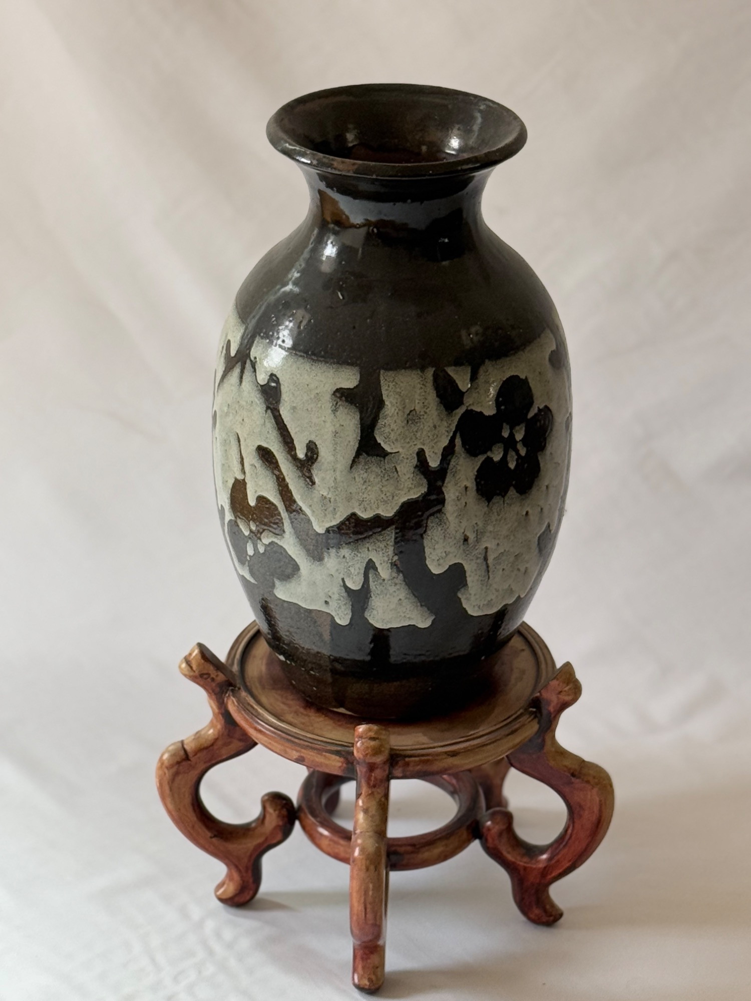 Drip Glaze Black Abstract Floral Pattern Vase With a Ornate Base. Measuring 18 inches in height and 12 inches in diameter. This stunning handcrafted ceramic vase features a bold black and light grey/white floral motif with an organic, painterly texture. The vase has a traditional shape with a wide body, slightly flared rim, and a high-gloss glazed finish. It is elegantly displayed on a hand-carved wooden stand, adding to its artistic appeal. This style of ceramic vase is reminiscent of traditional Asian pottery, particularly those from China, Japan, or Korea, where black and white glazes were commonly used in Song dynasty (China) or Joseon dynasty (Korea) pottery.