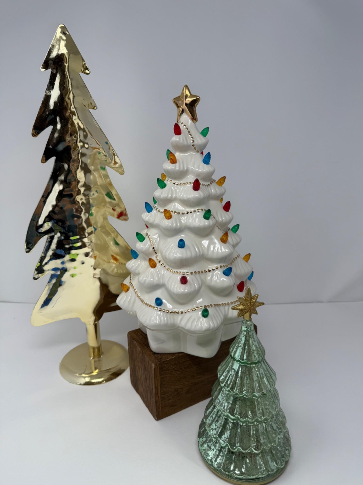 Two Battery Operated Lenox Christmas Trees and Gold Toned Tree. Trees measure-17", 12" and 8"
