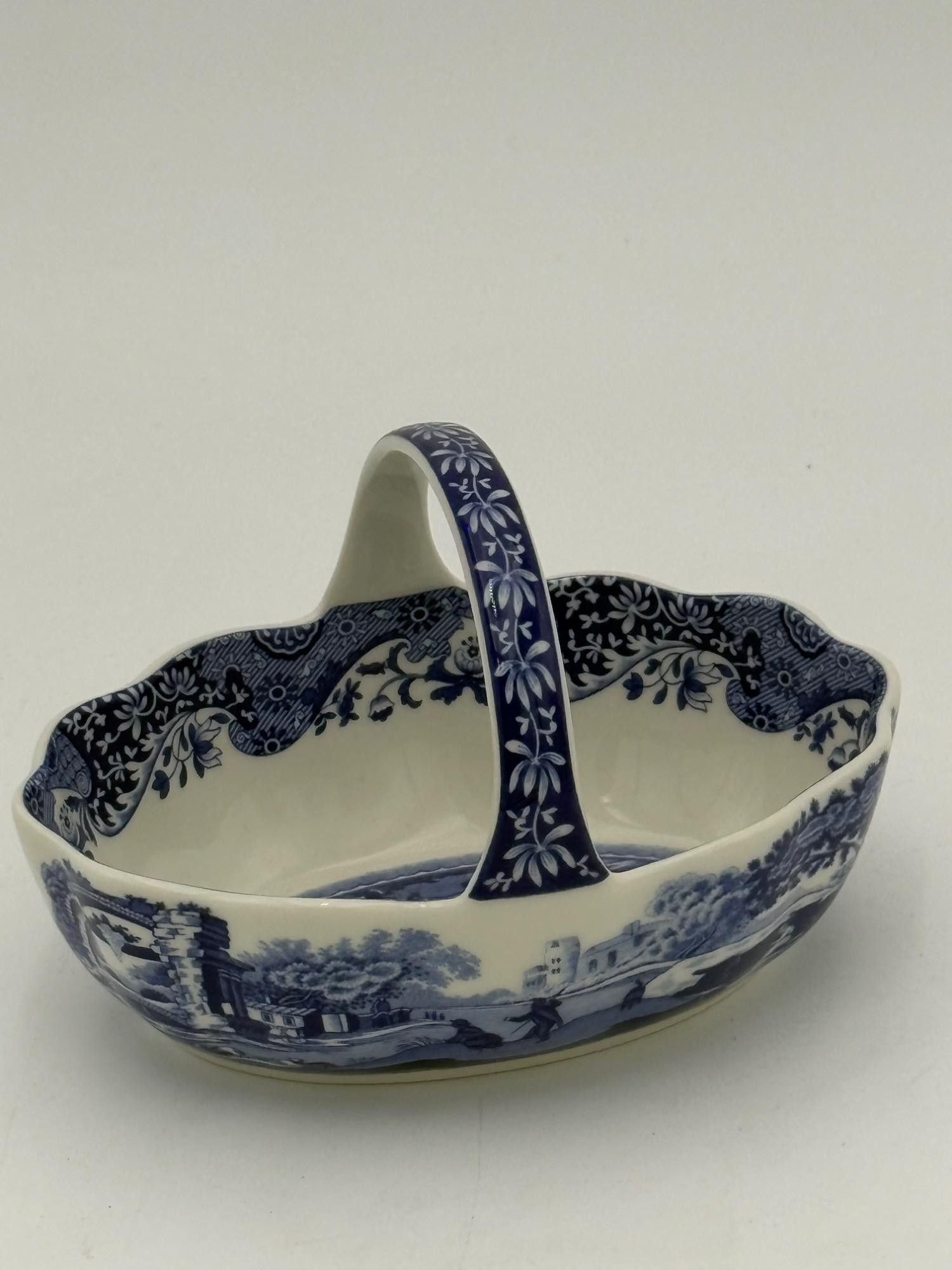 A stunning Spode "Italian" pattern handled basket, featuring the classic blue and white transferware design inspired by 19th-century Italian landscapes. The elegant basket form is complemented by a gracefully curved handle.