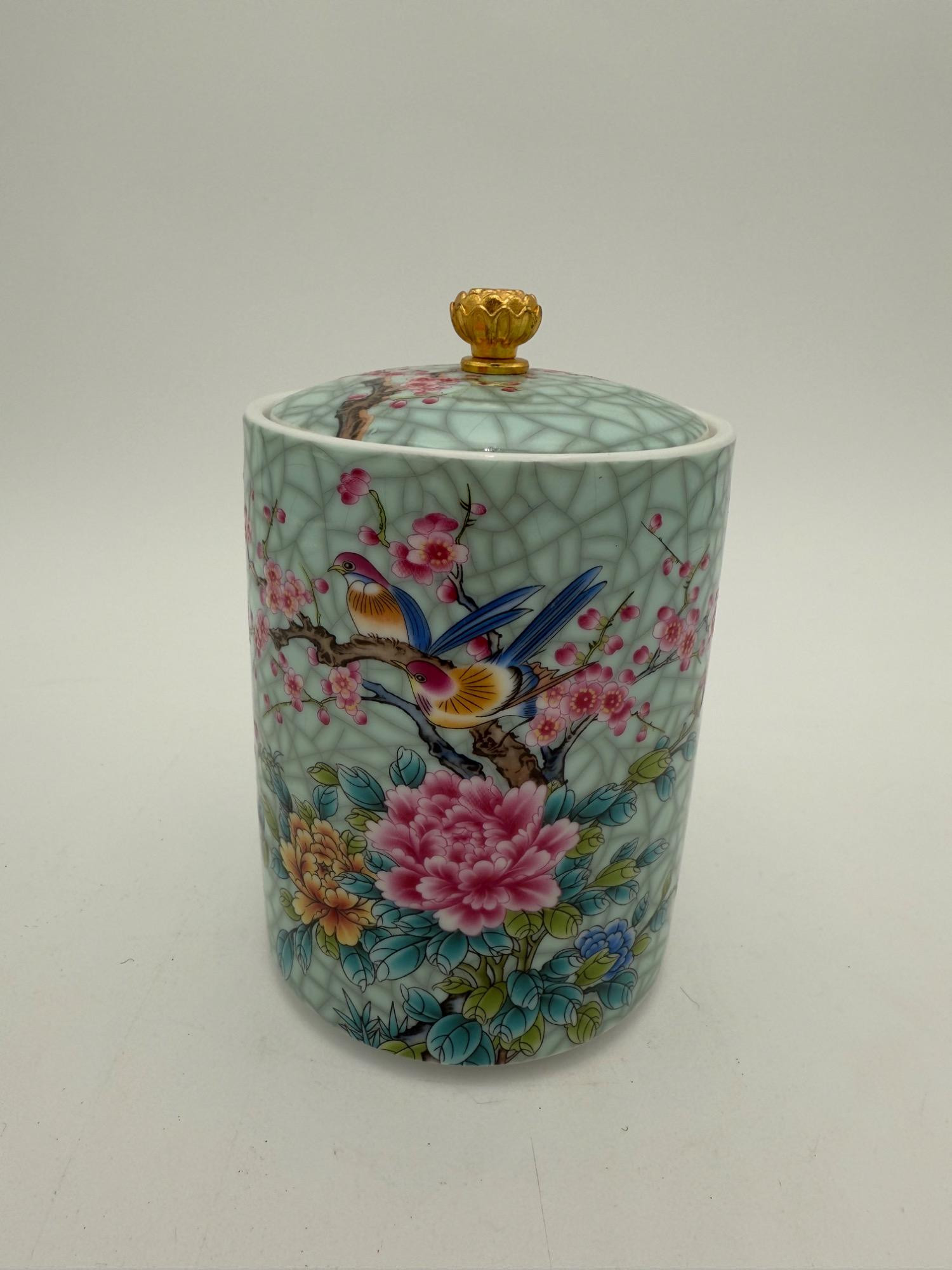 Beautifully hand-painted lidded jar from Jingdezhen, China’s legendary porcelain capital. This beautifully crafted piece features a celadon crackle glaze adorned with vibrant cherry blossoms, blooming peonies, and a delicate bird perched on a flowering branch. The ornate gold finial on the lid adds a touch of luxury. Marked “Jingde Porcelain Art” on the base, this jar represents fine Chinese craftsmanship. Condition: Excellent, with no visible flaws.
