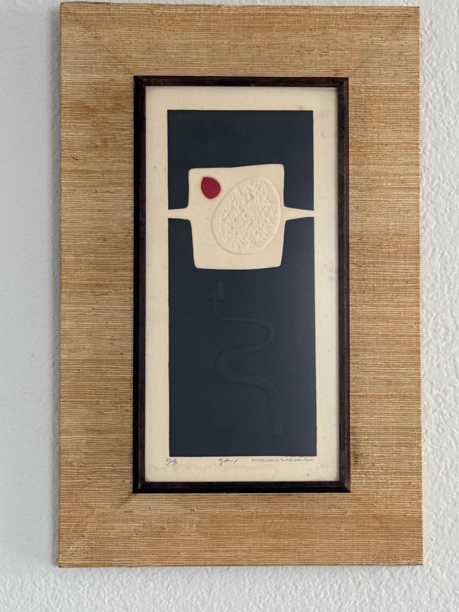 Signed Limited Edition Woodblock Print by Haku Maki titled "Go" Print 23/50. This image features a framed abstract artwork, likely a print by the renowned Japanese artist Haku Maki (1924-2000) The artwork is characterized by bold geometric shapes and textured elements, a signature style of Maki’s modernist approach to traditional Japanese printmaking (sōsaku hanga). The composition consists of a dark background with a prominent cream-colored form that appears embossed or raised, along with a small red circular accent. Note the raised accent of the black arrow. Below the image, there are handwritten numbers and text, indicating that this piece is a limited-edition print. Material wood block. Art is signed by Haku Maki.