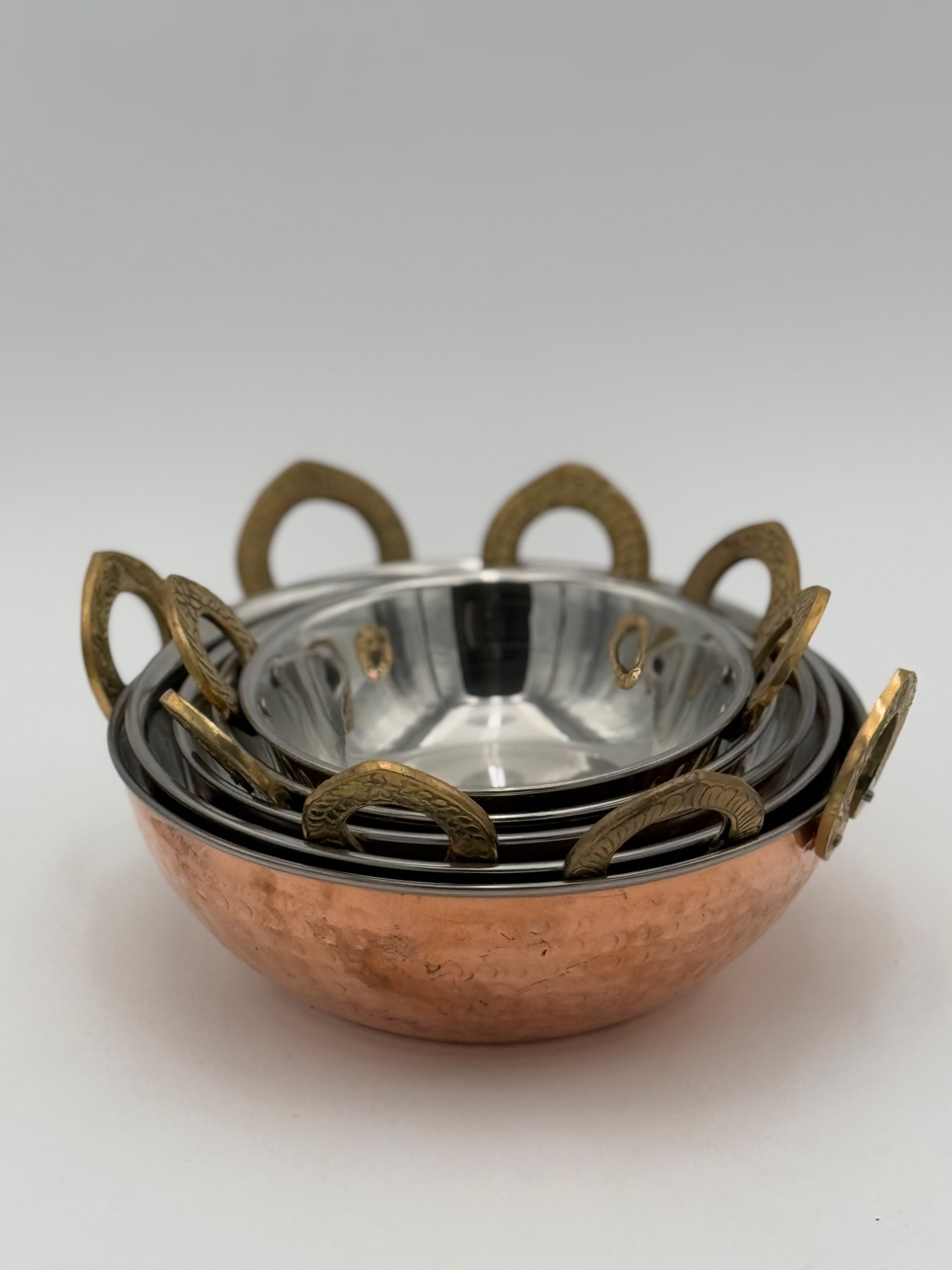 A beautiful set of stacking hammered copper and stainless steel serving bowls, featuring ornate brass loop handles with intricate detailing. The interior of each bowl is polished stainless steel, providing durability and an elegant contrast to the warm copper exterior. The handcrafted hammered finish adds texture and character to each piece. Largest- 8.5 Diameter x 3" Tall Smallest- 5.5 Diameter x 1.75 Tal