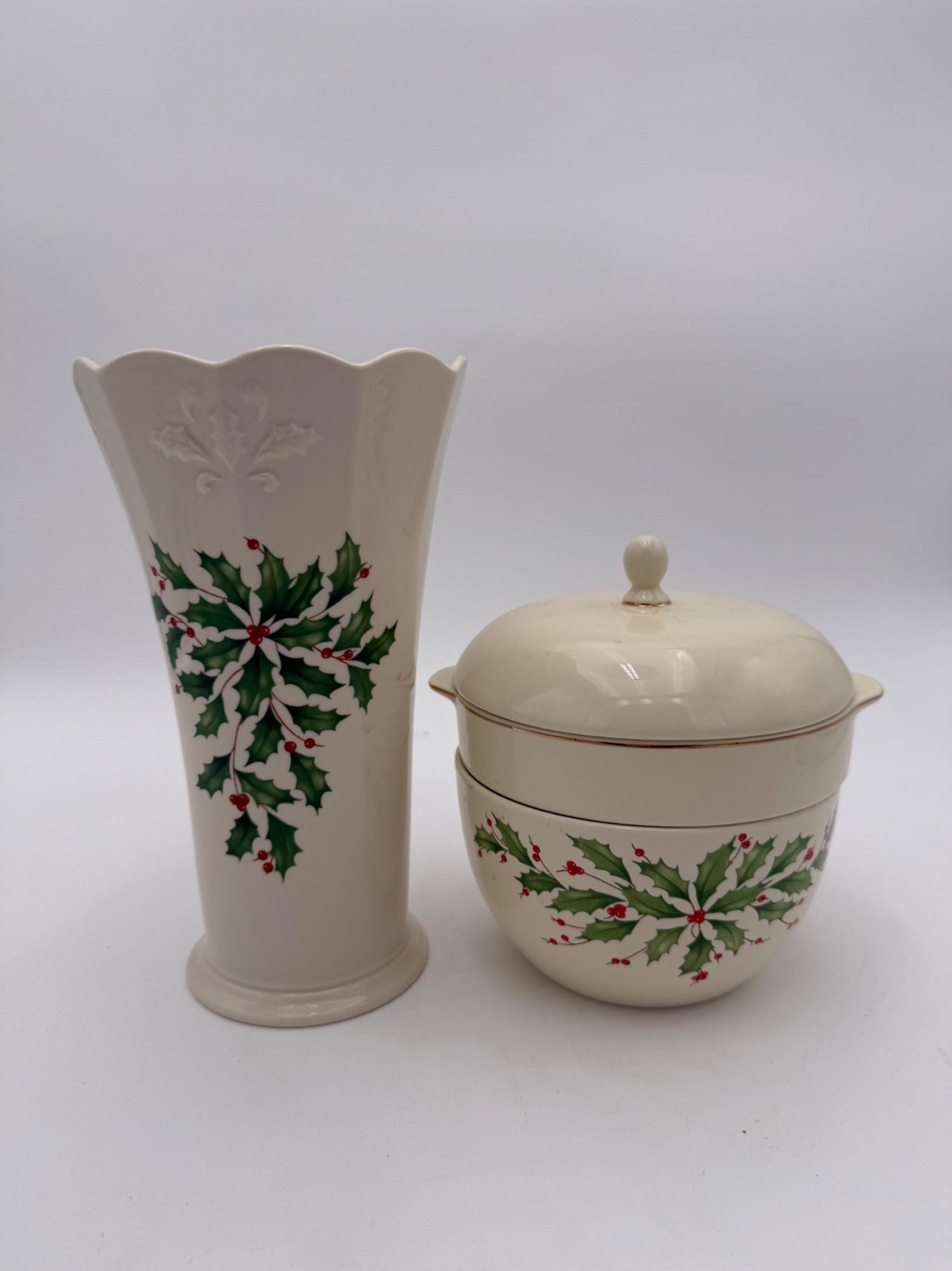 Lot # 134 - Vintage Lenox Holiday Vase and Covered Dish Set
