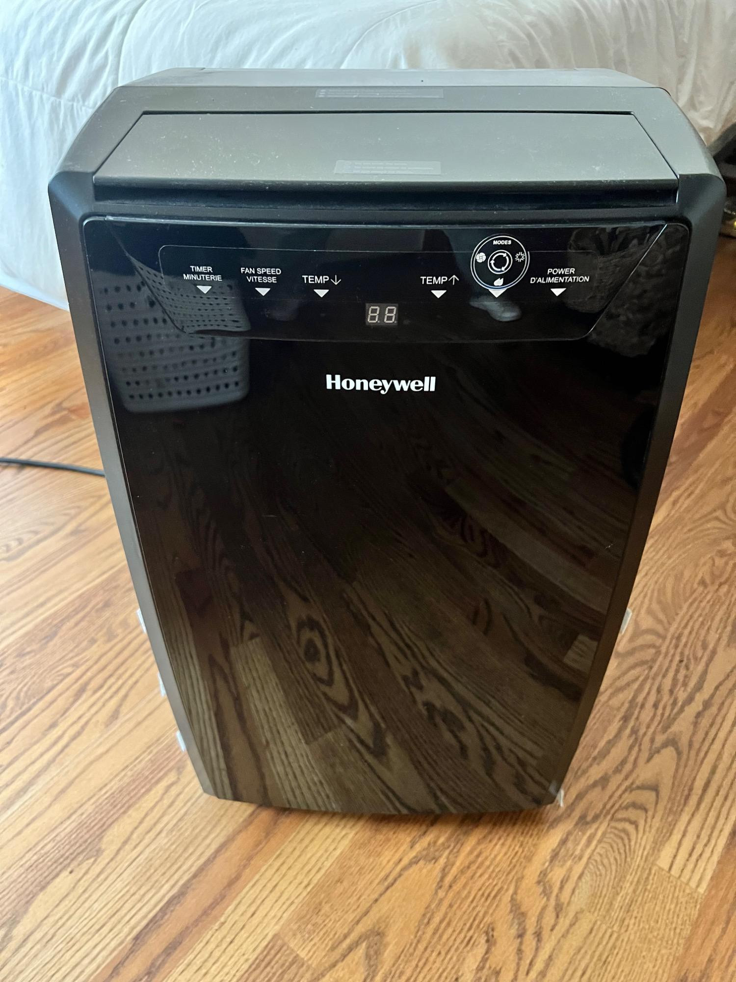 This Honeywell portable air conditioner features a sleek black design with an easy-to-use digital control panel. The unit includes settings for timer, fan speed, temperature control, and multiple operating modes, allowing users to customize cooling to their needs. The bright LED display ensures visibility, while the compact, modern build makes it a stylish and functional addition to any room. Ideal for cooling small to medium-sized spaces, this unit offers portability with built-in caster wheels for easy movement.