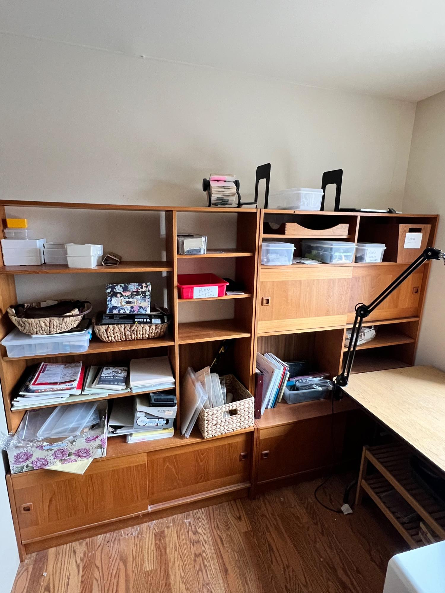 This matching pair of mid-century modern wooden bookshelves offers ample storage and display space, perfect for a home office, study, or craft room. Crafted from high-quality wood veneer, these units feature open shelving, enclosed compartments, and sliding cabinet doors for a versatile organization solution. Features: