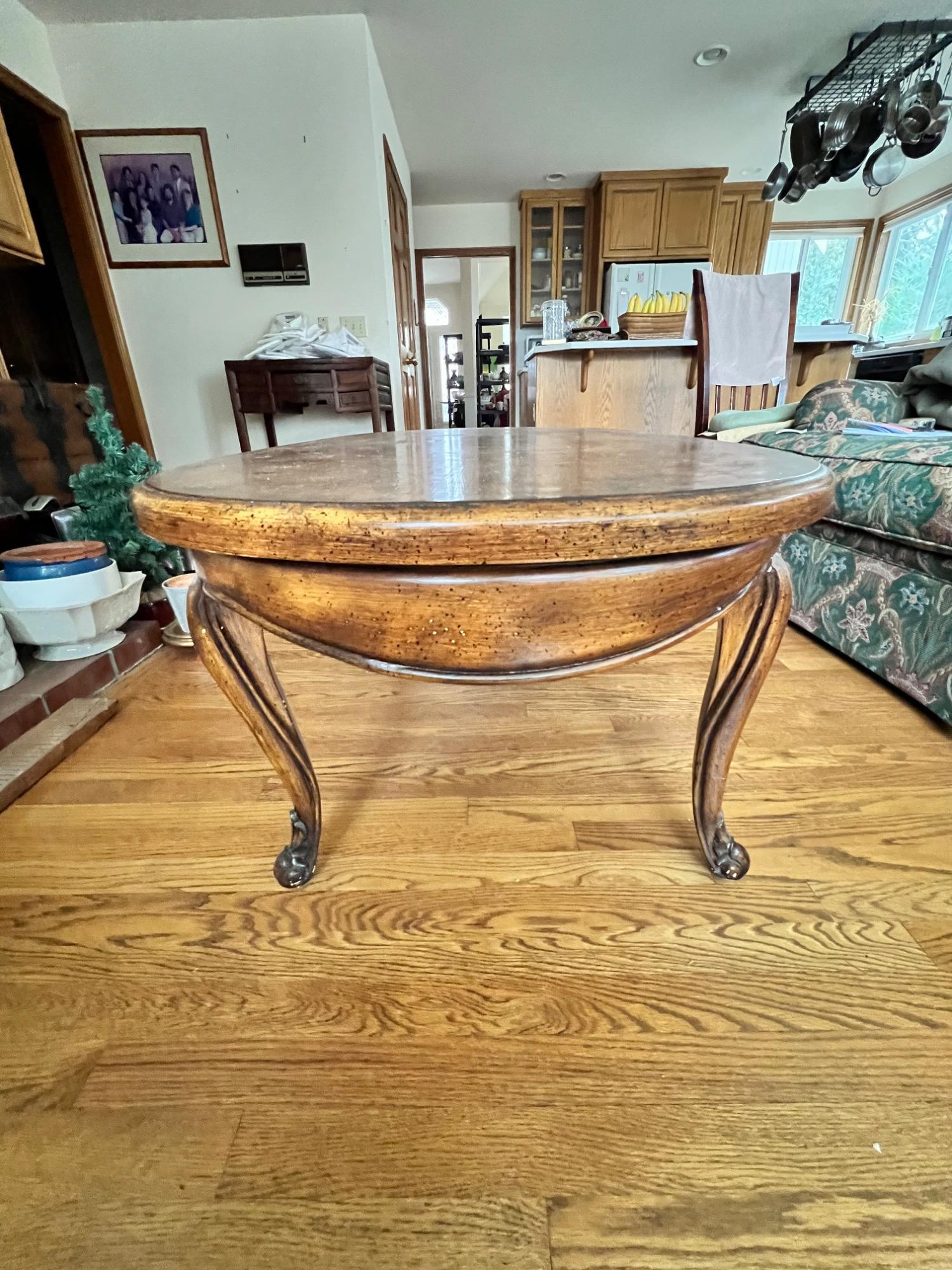 This beautifully crafted vintage oval wooden coffee table features an elegant, classic design with carved cabriole legs and a smooth, polished surface. The rich wood grain gives it a warm and timeless appeal.