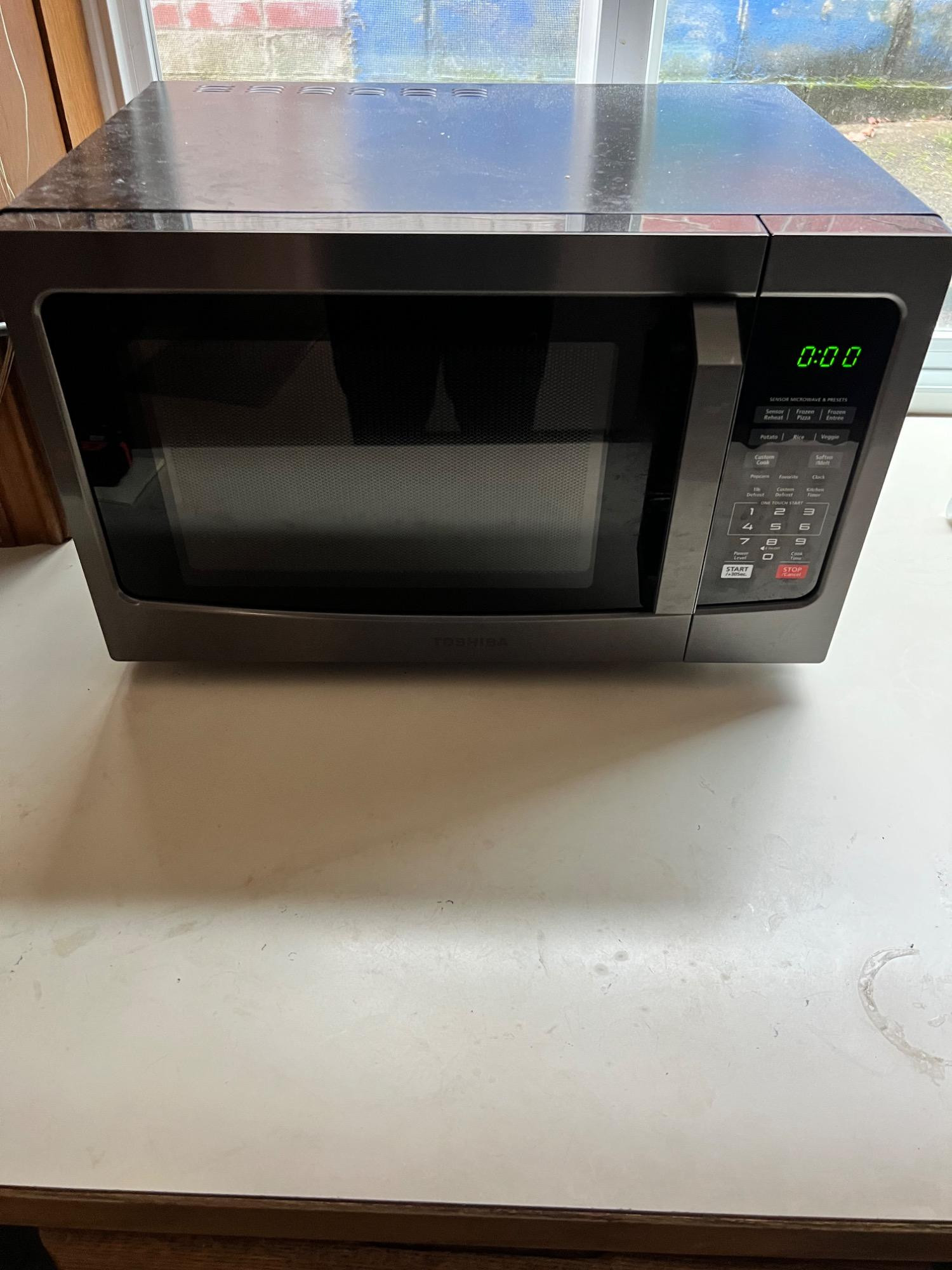 This is a Toshiba countertop microwave oven in stainless steel, featuring a digital control panel with various cooking presets and sensor functions. The microwave is in good working condition, with a clear LED display and intact buttons for easy operation. Key Features: