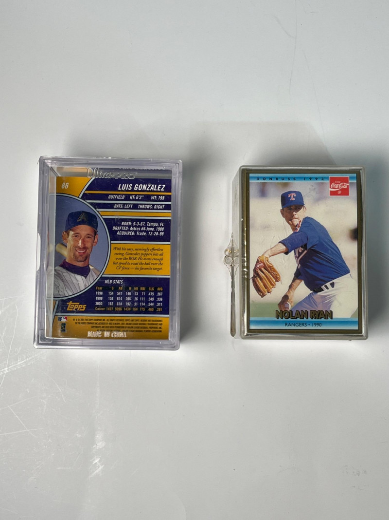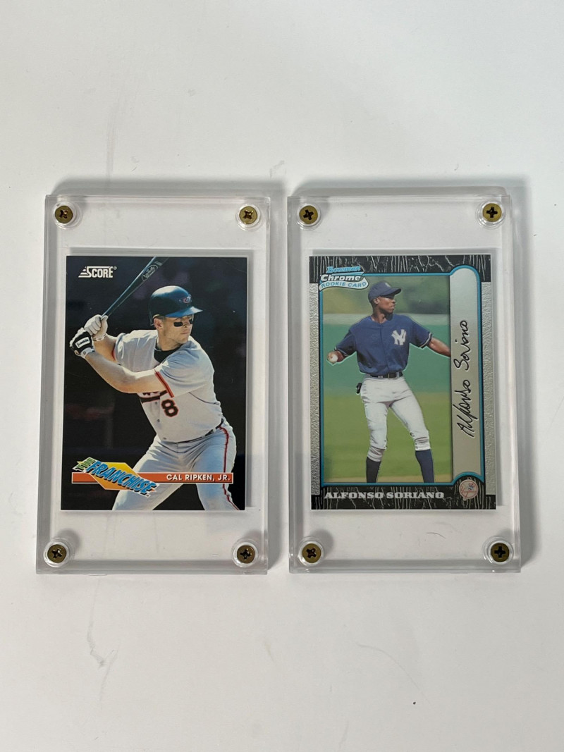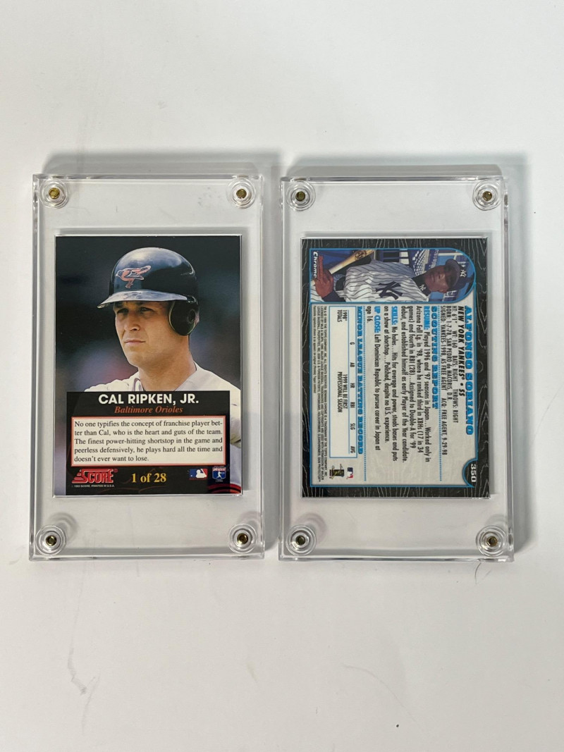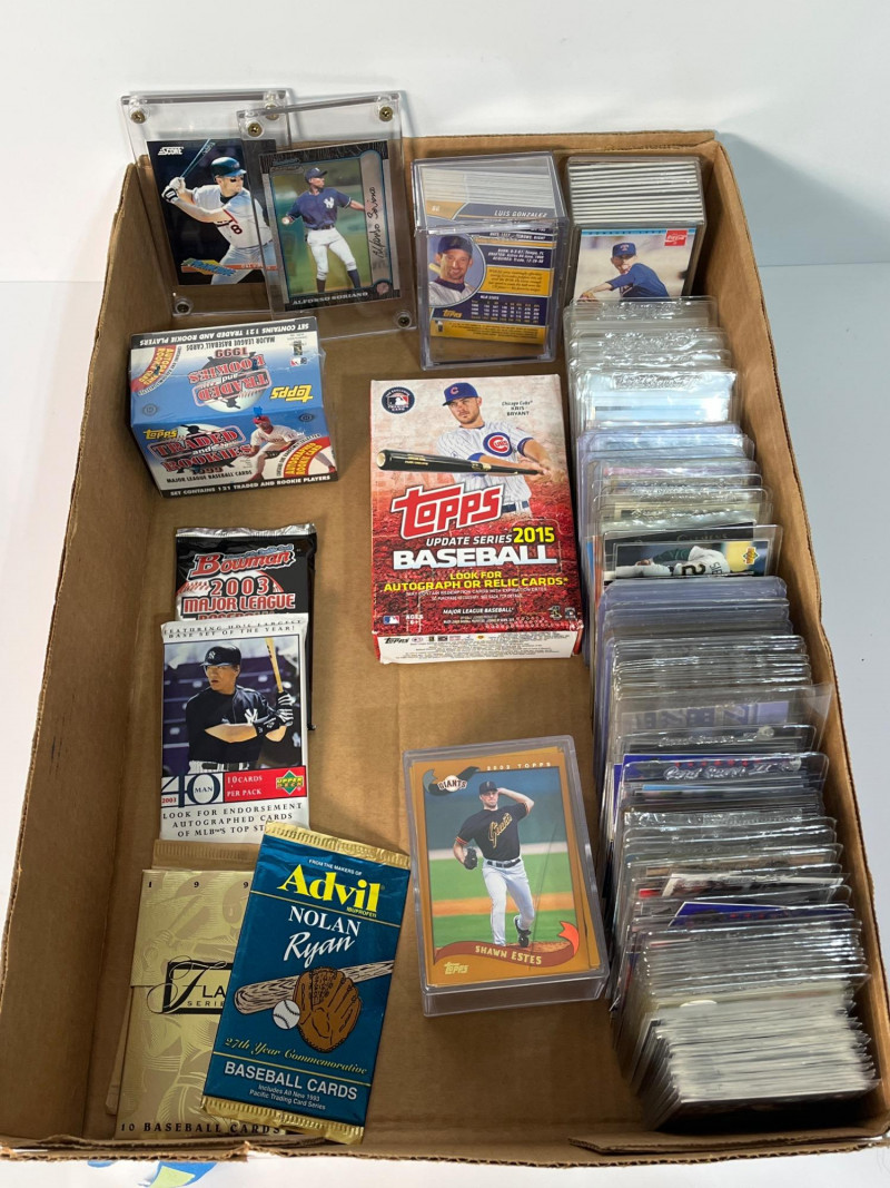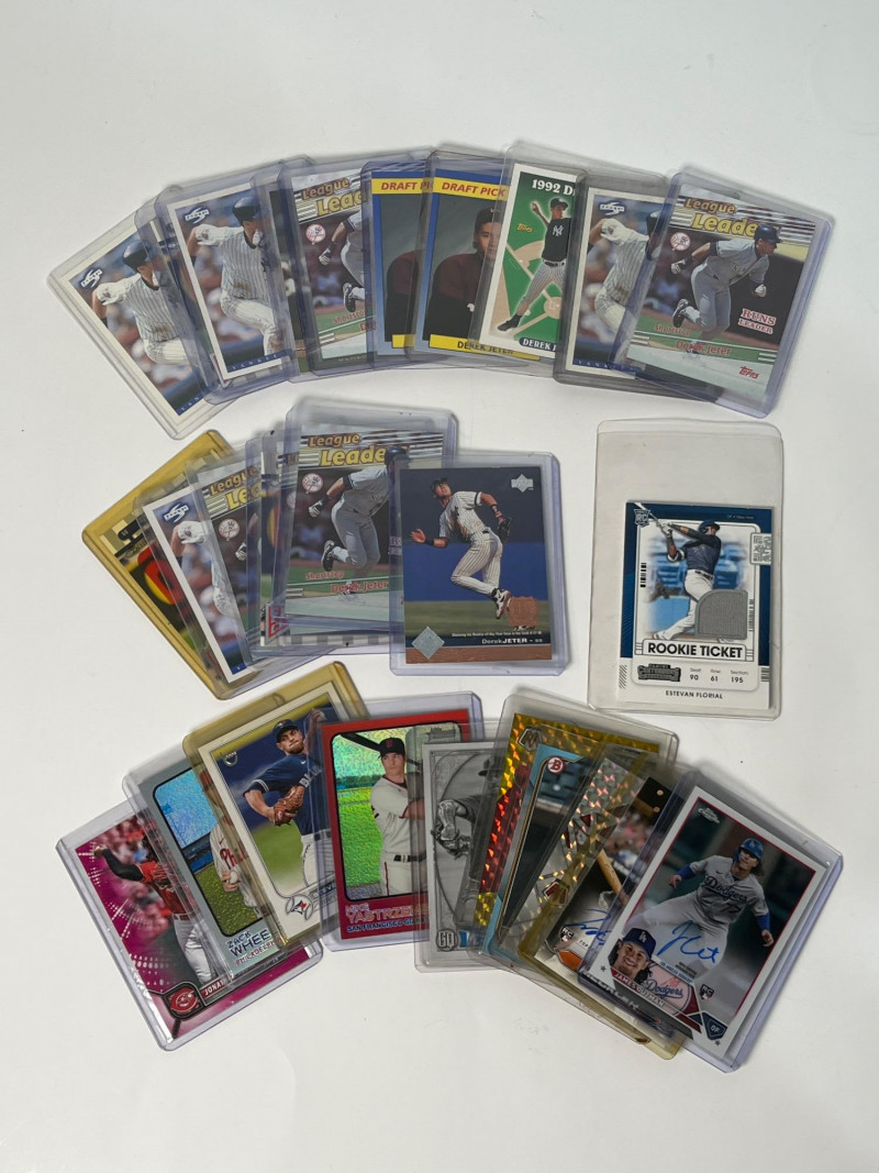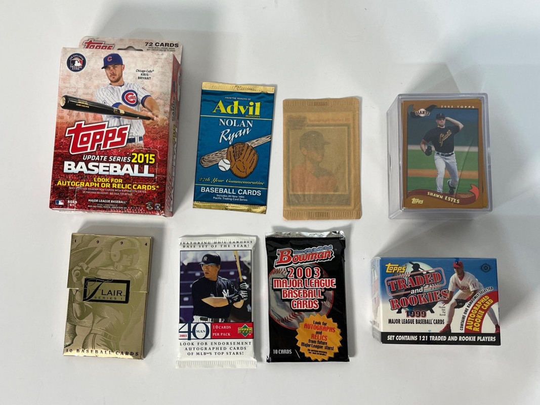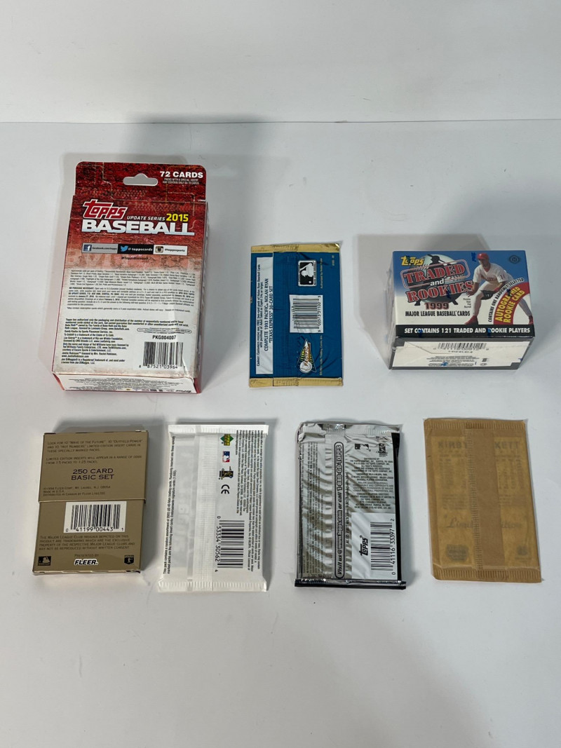 this lot is a group of cards from the 90s on up into the 2000s from multiple manufacturers like Flair, Upper Deck, Topps and others. A few of the highlights are Derek Jeter rookie cards, Cal Ripken Jr.'s last game card and a handful of unopened packages of cards. This is a really fun variety of cards for a beginner collector or seasoned collector. Official condition of cards is unknown. Please note that we do not go through trading card sets to assess their completeness. While we do make every effort to describe the exact contents of each lot, we cannot guarantee that a previously opened box contains every card advertised on its label. Unless the description expressly states that a case or box is sealed, please assume that the card set inside is or may be incomplete.