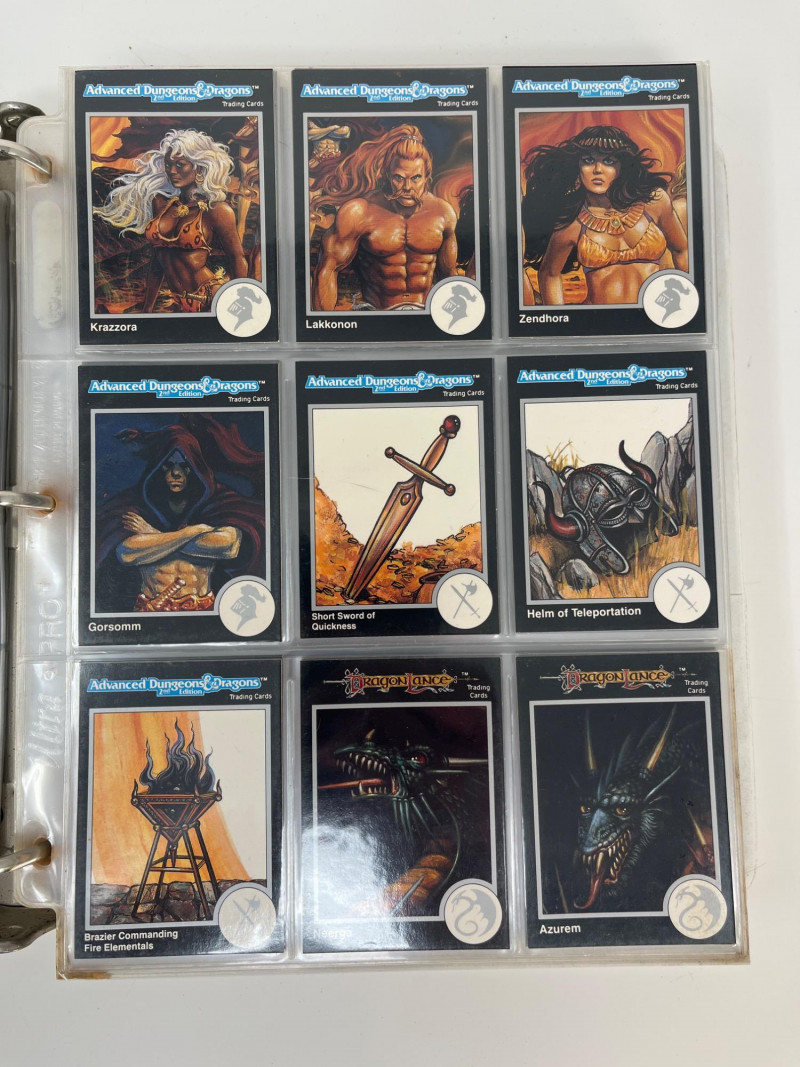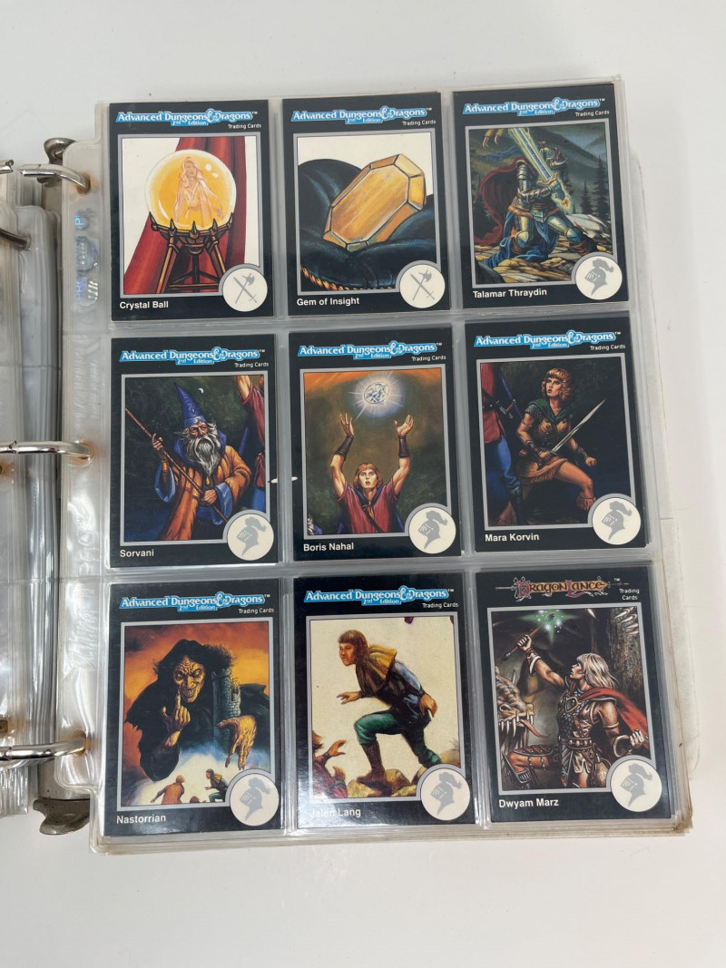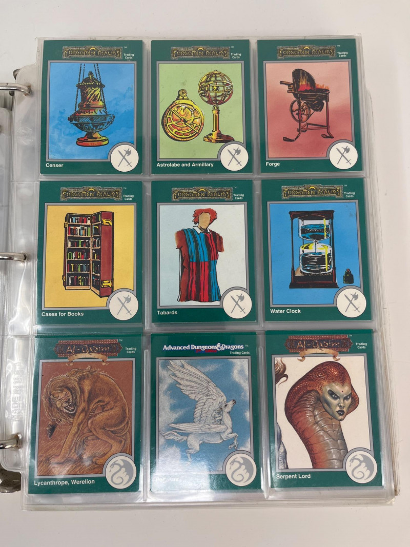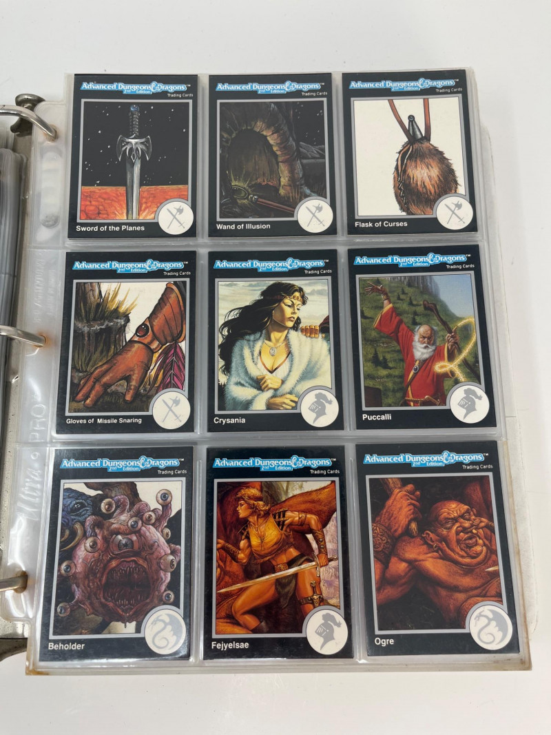 This lot includes Dungeons and Dragons trading cards from the early 1990’s and are all contained in a large 3 ring binder. Completeness of set and condition of cards is unknown. Please note that we do not go through trading card sets to assess their completeness. While we do make every effort to describe the exact contents of each lot, we cannot guarantee that a previously opened box contains every card advertised on its label. Unless the description expressly states that a case or box is sealed, please assume that the card set inside is or may be incomplete.