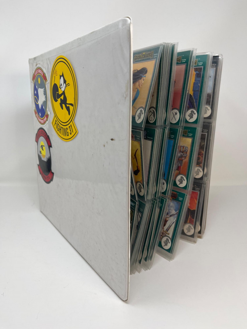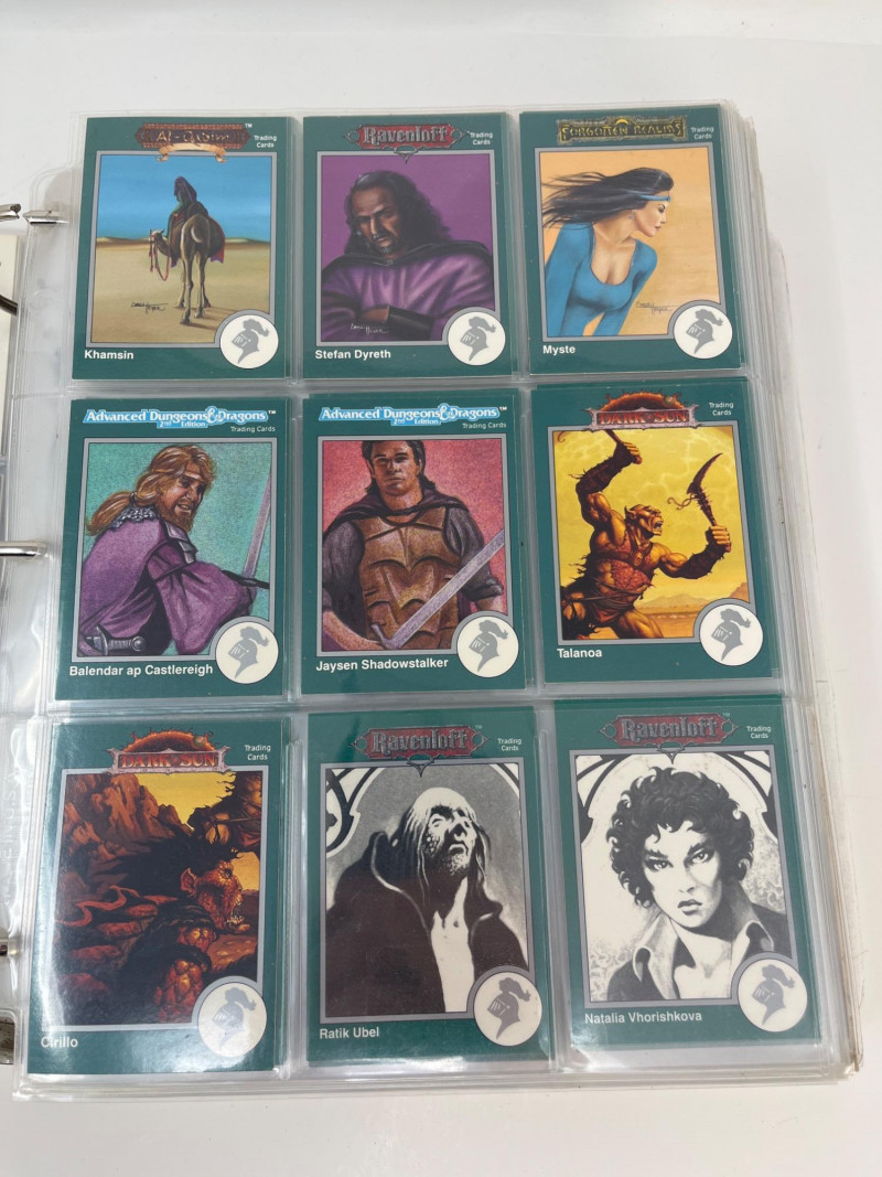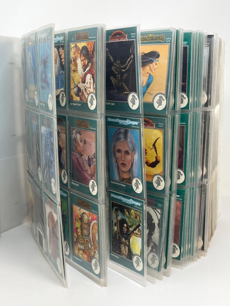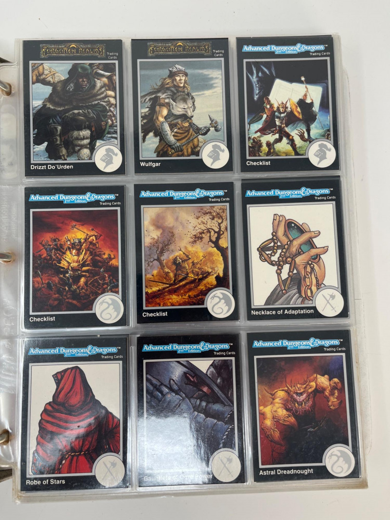 This lot includes Dungeons and Dragons trading cards from the early 1990’s and are all contained in a large 3 ring binder. Completeness of set and condition of cards is unknown. Please note that we do not go through trading card sets to assess their completeness. While we do make every effort to describe the exact contents of each lot, we cannot guarantee that a previously opened box contains every card advertised on its label. Unless the description expressly states that a case or box is sealed, please assume that the card set inside is or may be incomplete.