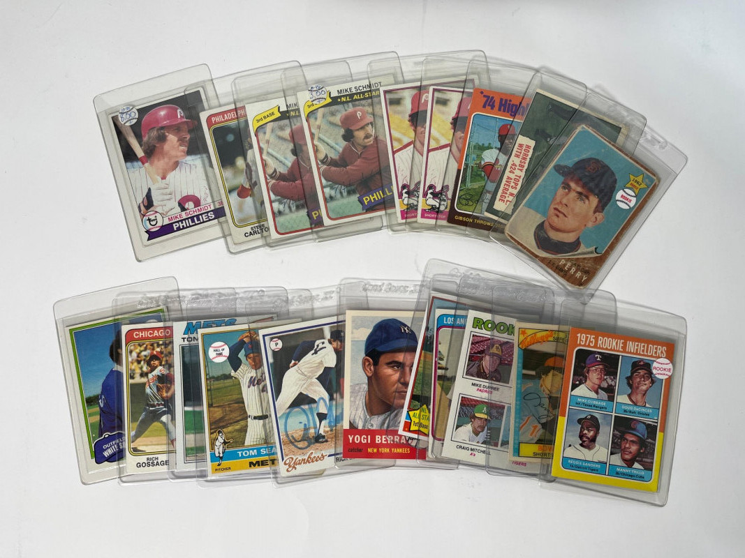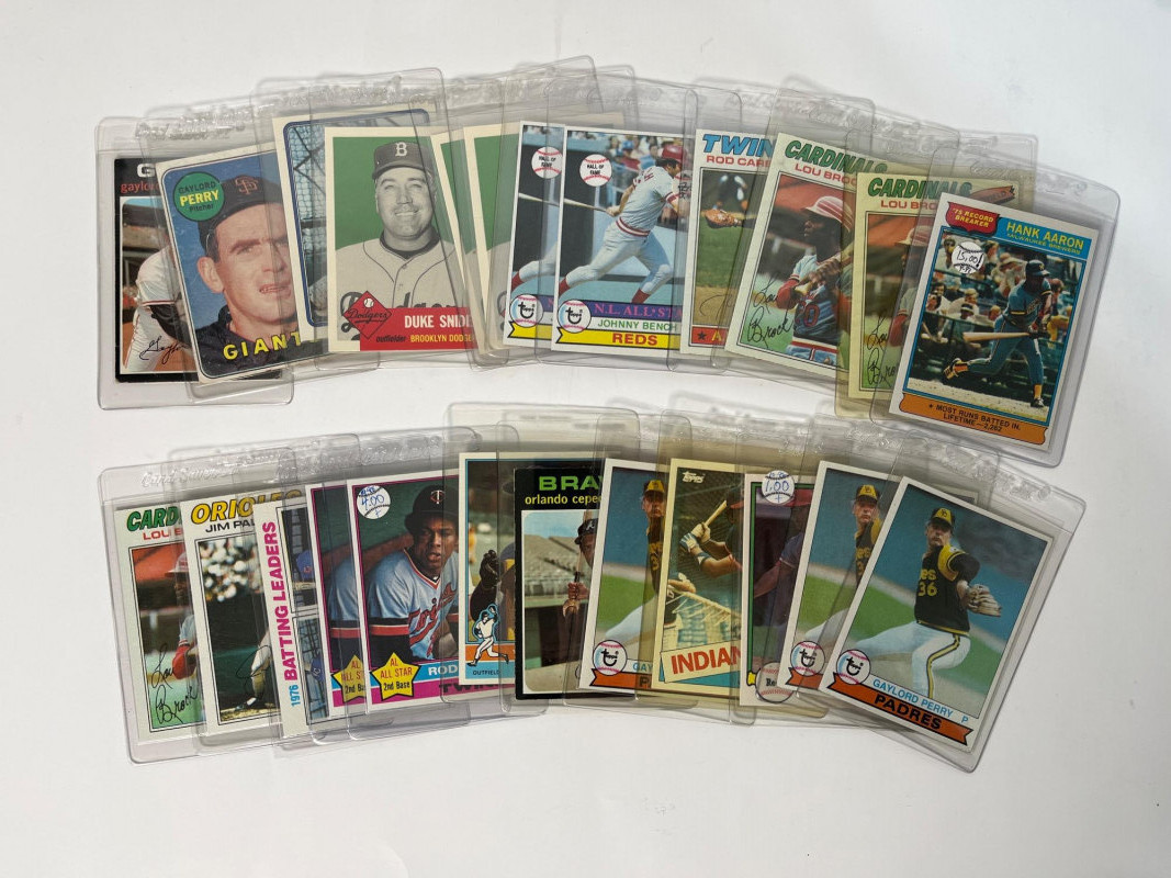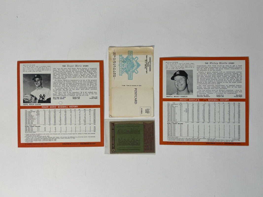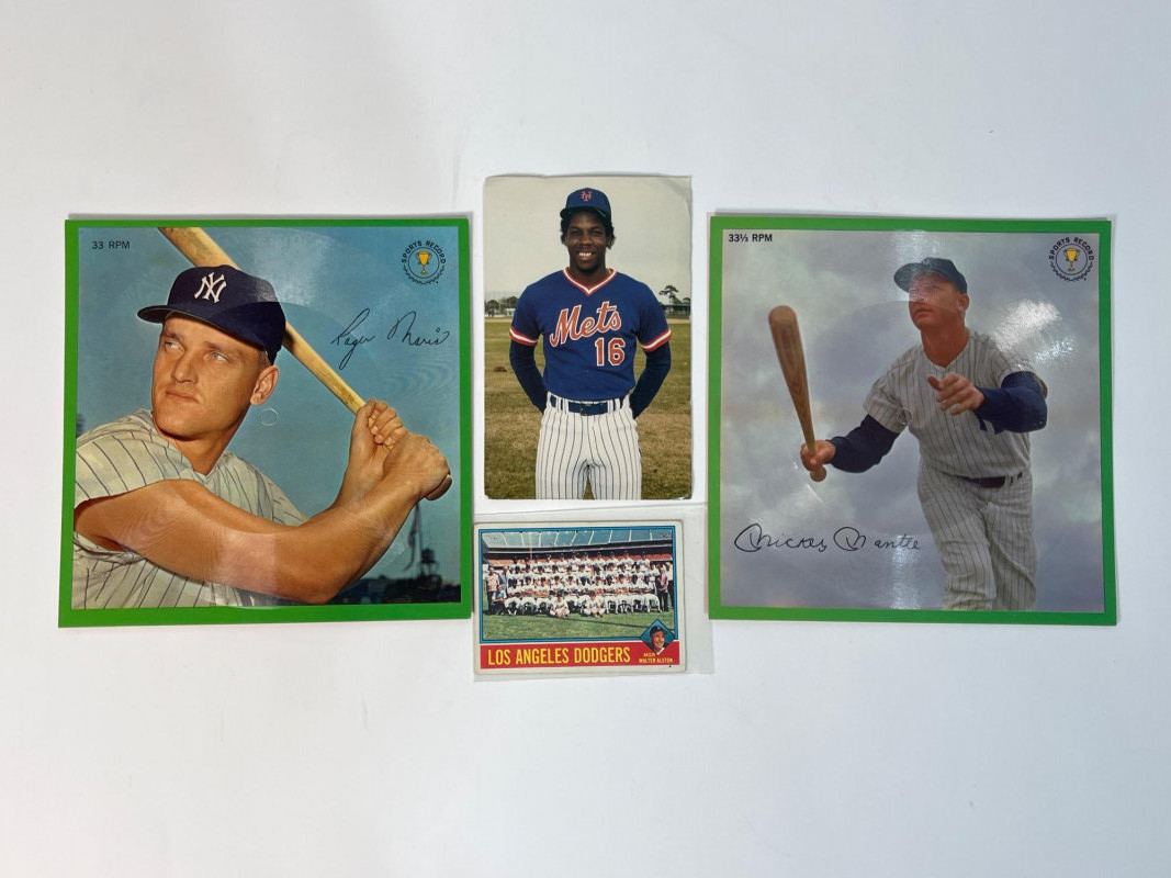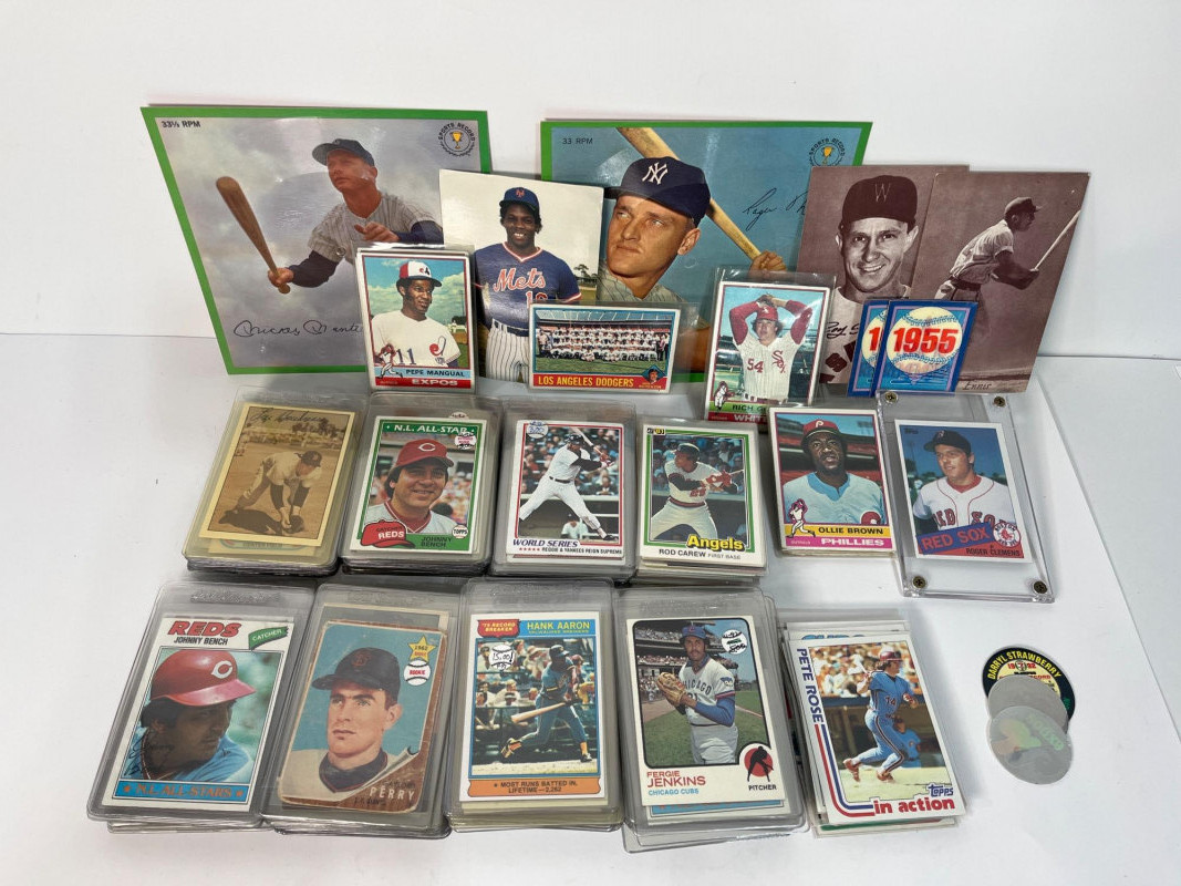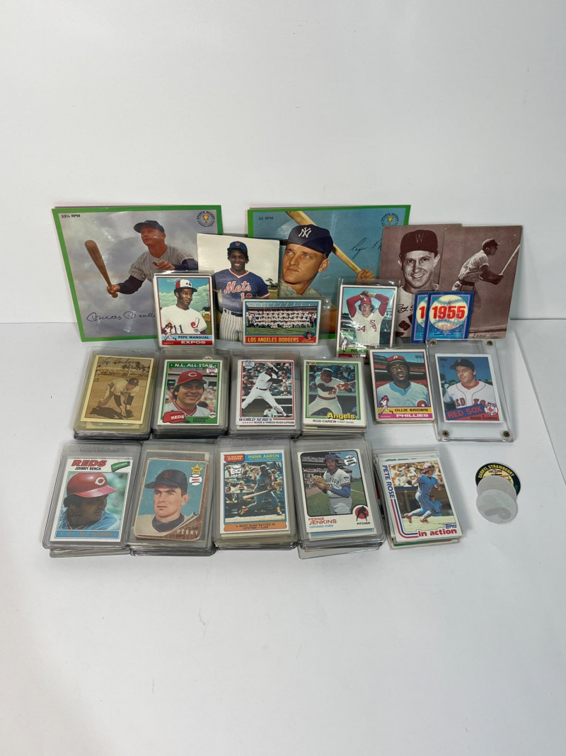 This lot includes a ton of classic players from 1980 and earlier. Most of these cards are from the '70s. Some of the collectibles include postcards and two collectible records, one on Mickey Mantle and one on Roger Marris. This collection is perfect for the baseball historian! Please note that we do not go through trading card sets to assess their completeness. While we do make every effort to describe the exact contents of each lot, we cannot guarantee that a previously opened box contains every card advertised on its label. Unless the description expressly states that a case or box is sealed, please assume that the card set inside is or may be incomplete.