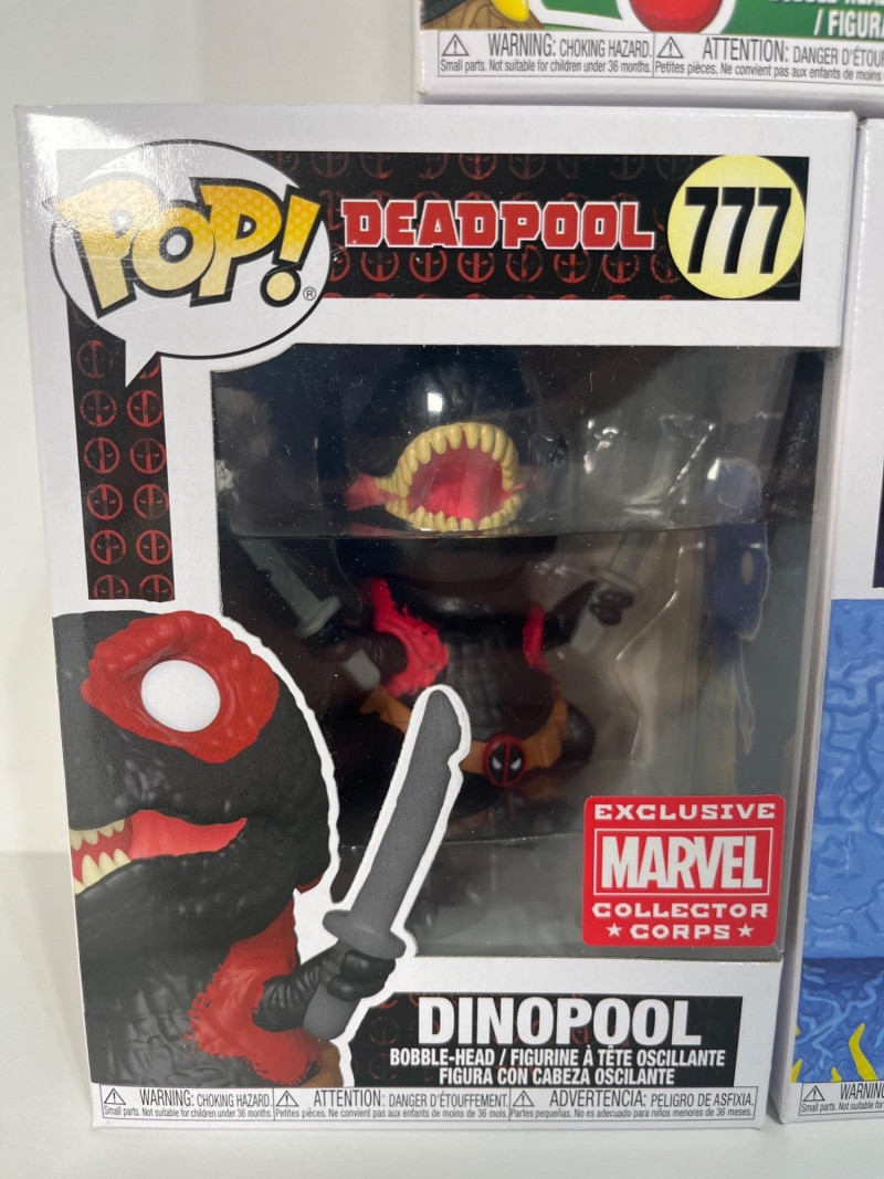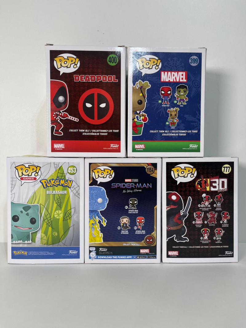 This lot includes five pop figurines from Funko including group number 399 Deadpool 400 Dino pool 777 electro 1154 and Bulbasaur 453. All packages look to be unopened.