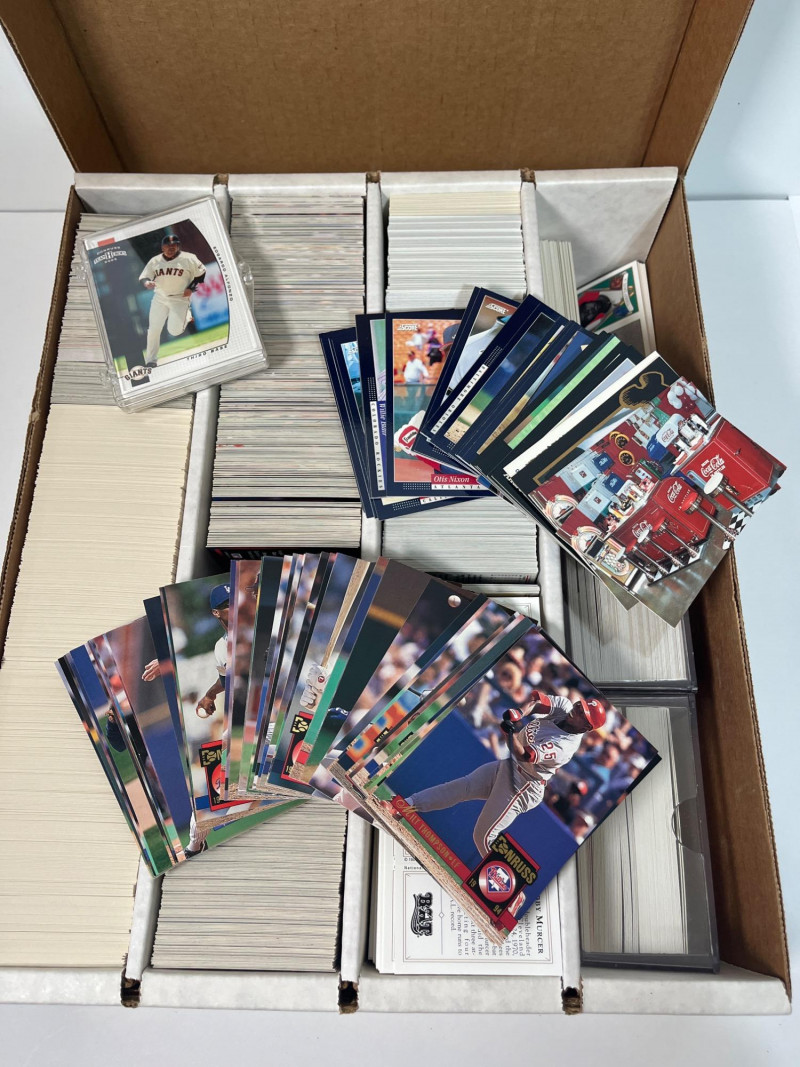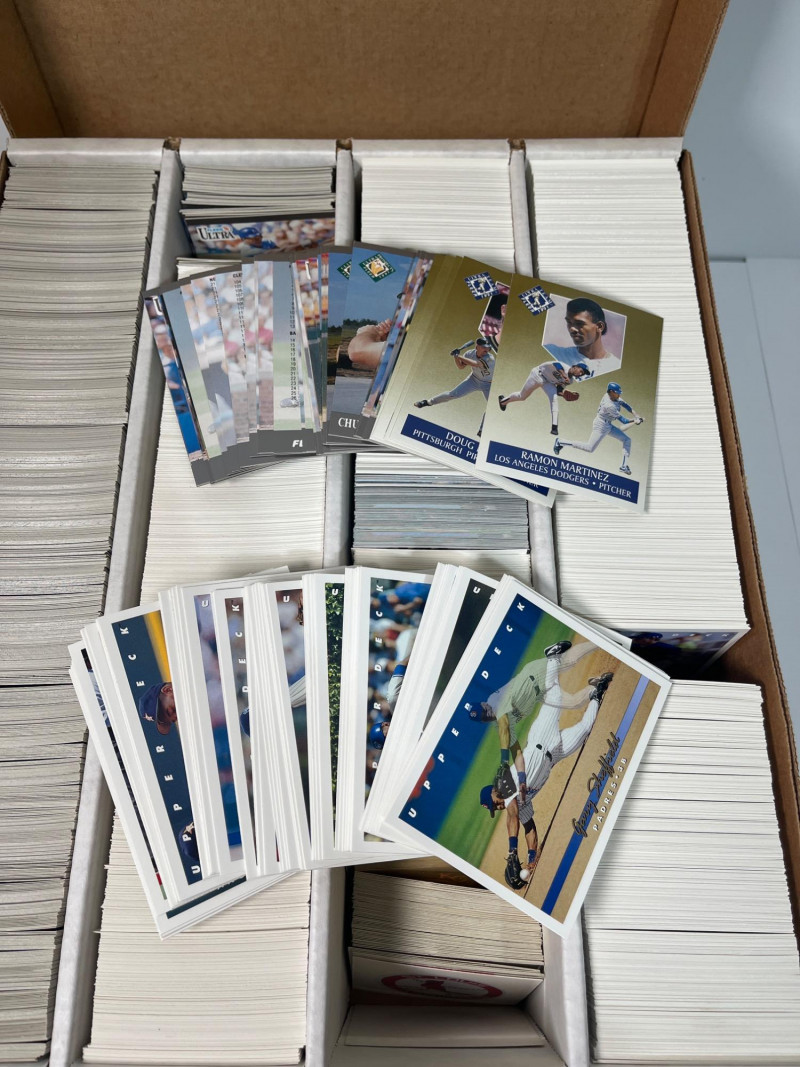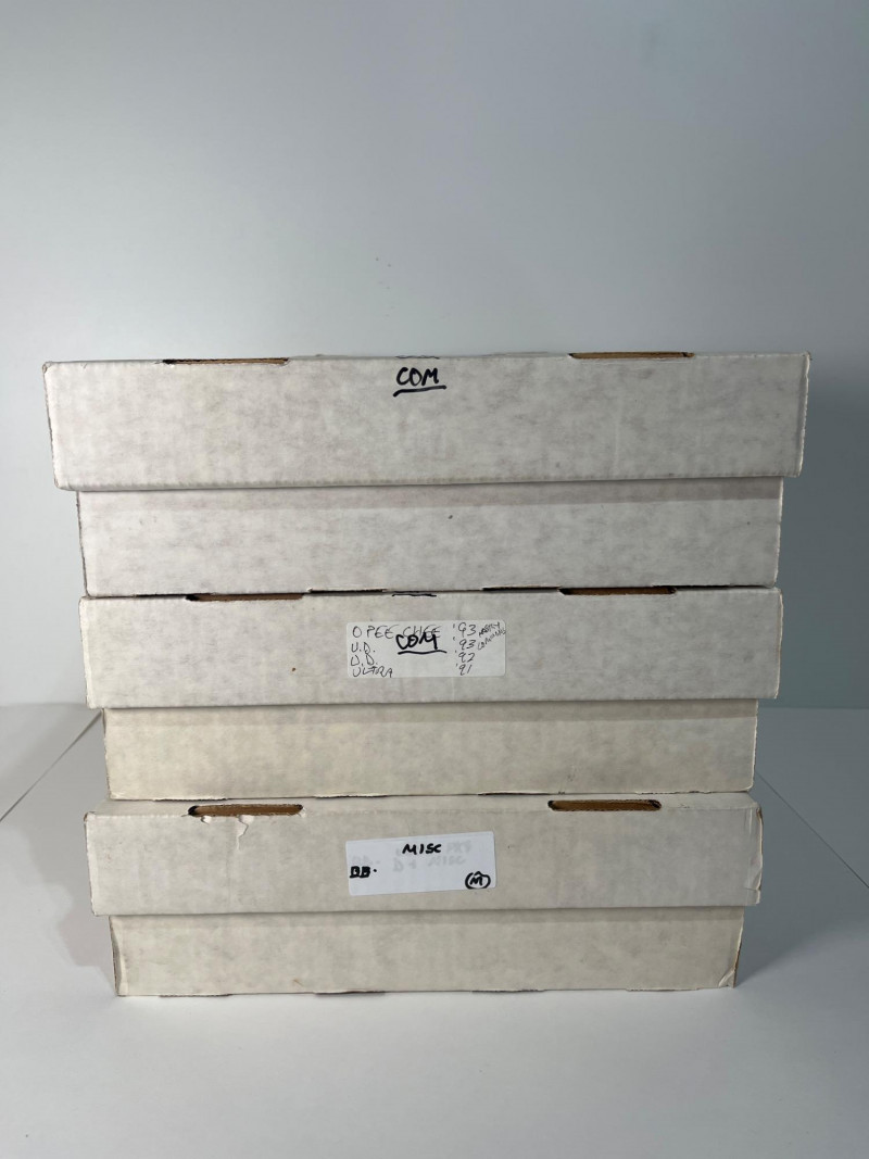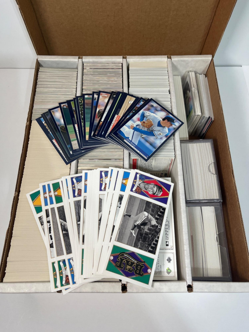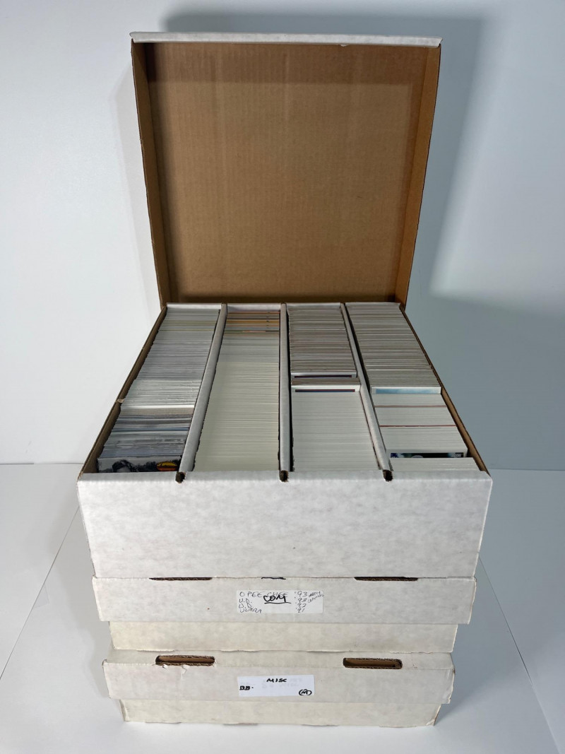 This lot consists of three big boxes of baseball cards with a few football and basketball cards mixed in. Brands include O-Pee-Chee, Ultra, Upper Deck and Topps. Official condition and completeness of sets is unknown. Please note that we do not go through trading card sets to assess their completeness. While we do make every effort to describe the exact contents of each lot, we cannot guarantee that a previously opened box contains every card advertised on its label. Unless the description expressly states that a case or box is sealed, please assume that the card set inside is or may be incomplete.