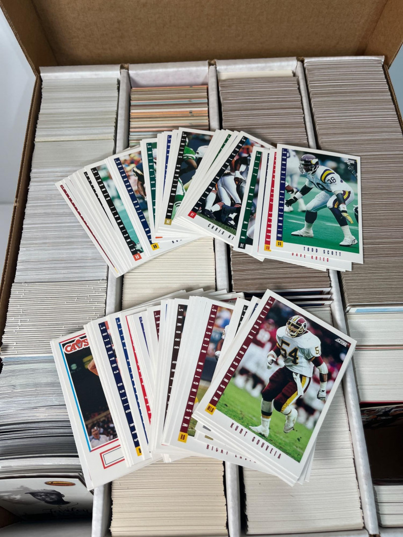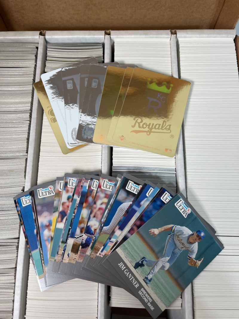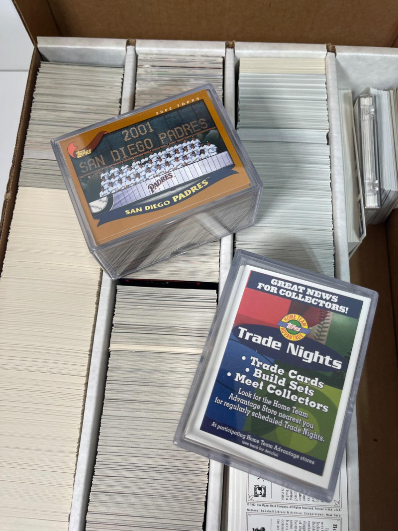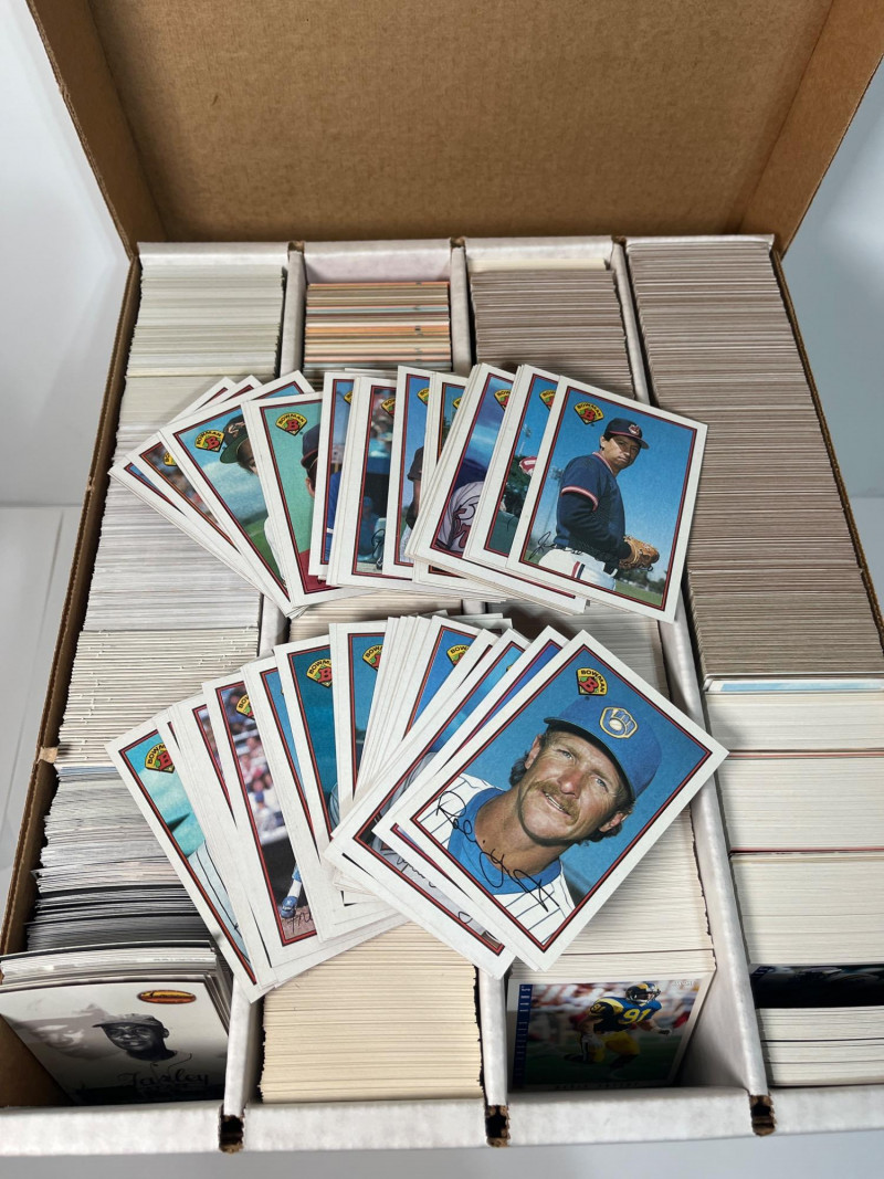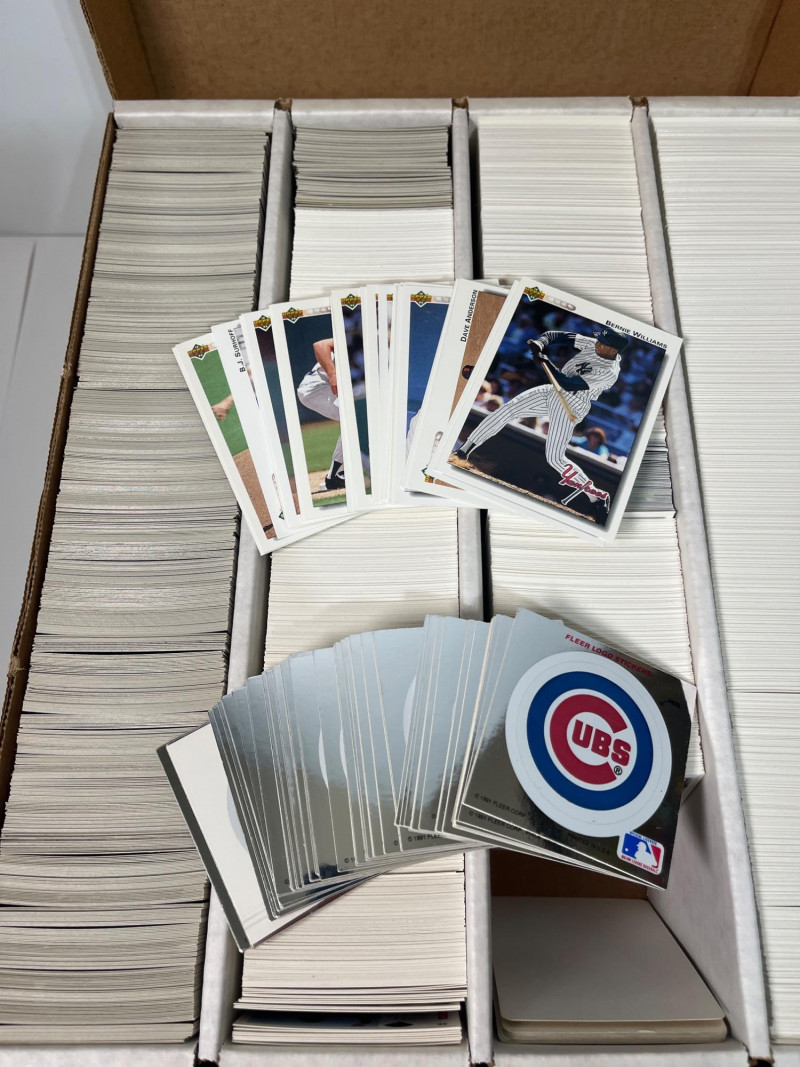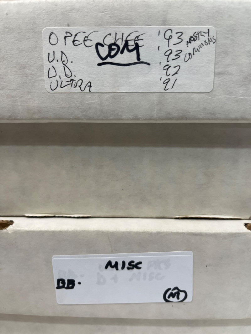 This lot consists of three big boxes of baseball cards with a few football and basketball cards mixed in. Brands include O-Pee-Chee, Ultra, Upper Deck and Topps. Official condition and completeness of sets is unknown. Please note that we do not go through trading card sets to assess their completeness. While we do make every effort to describe the exact contents of each lot, we cannot guarantee that a previously opened box contains every card advertised on its label. Unless the description expressly states that a case or box is sealed, please assume that the card set inside is or may be incomplete.