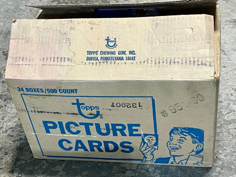 This case contains 24 boxes of 500 cards. The year stamped on each box inside is 1990. What treasures might be inside? Please note that we do not go through trading card sets to assess their completeness. While we do make every effort to describe the exact contents of each lot, we cannot guarantee that a previously opened box contains every card advertised on its label. Unless the description expressly states that a case or box is sealed, please assume that the card set inside is or may be incomplete.