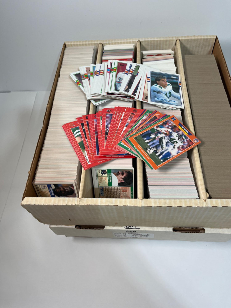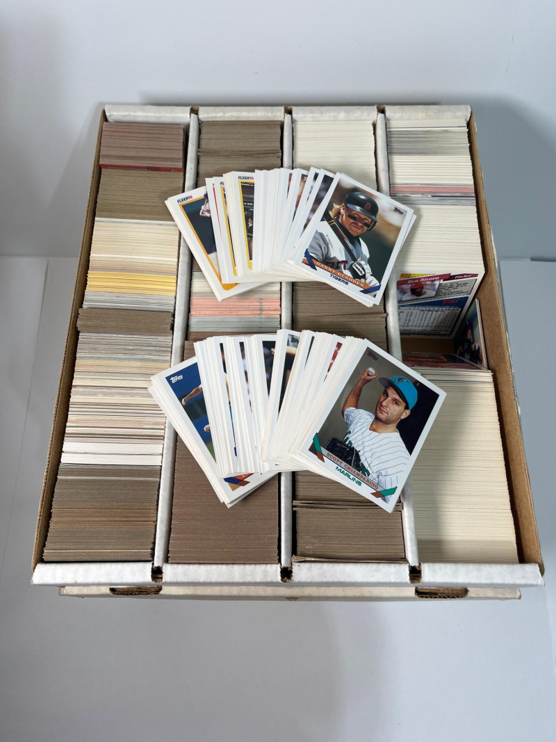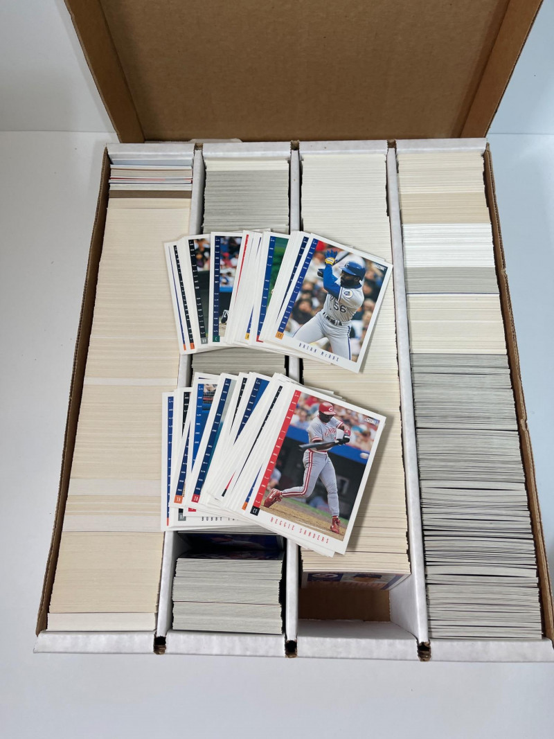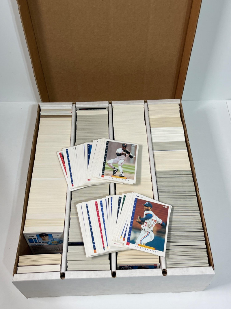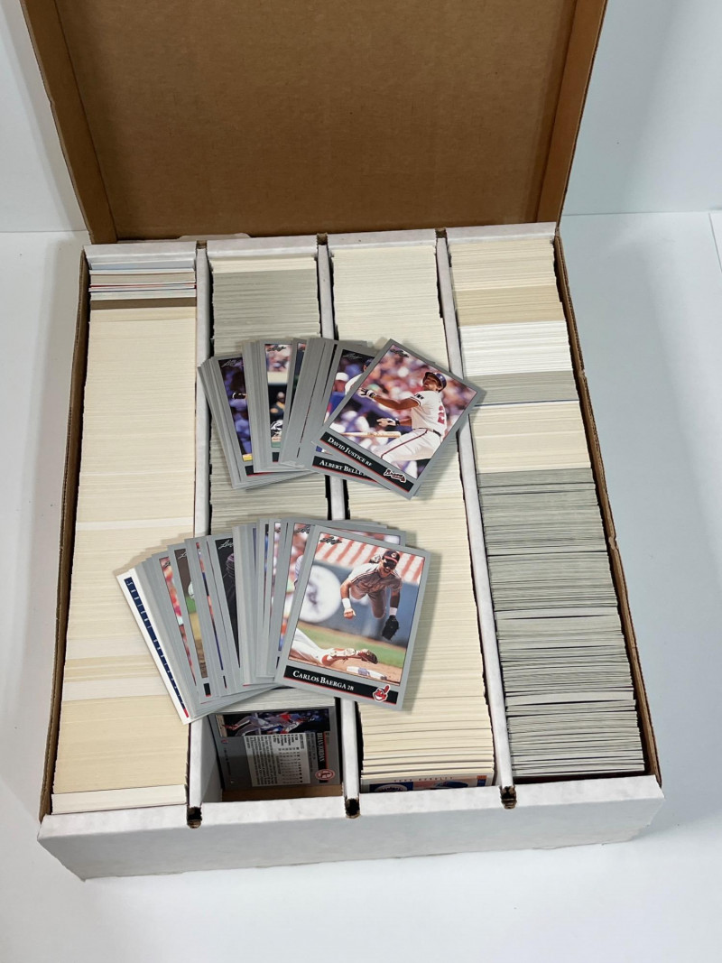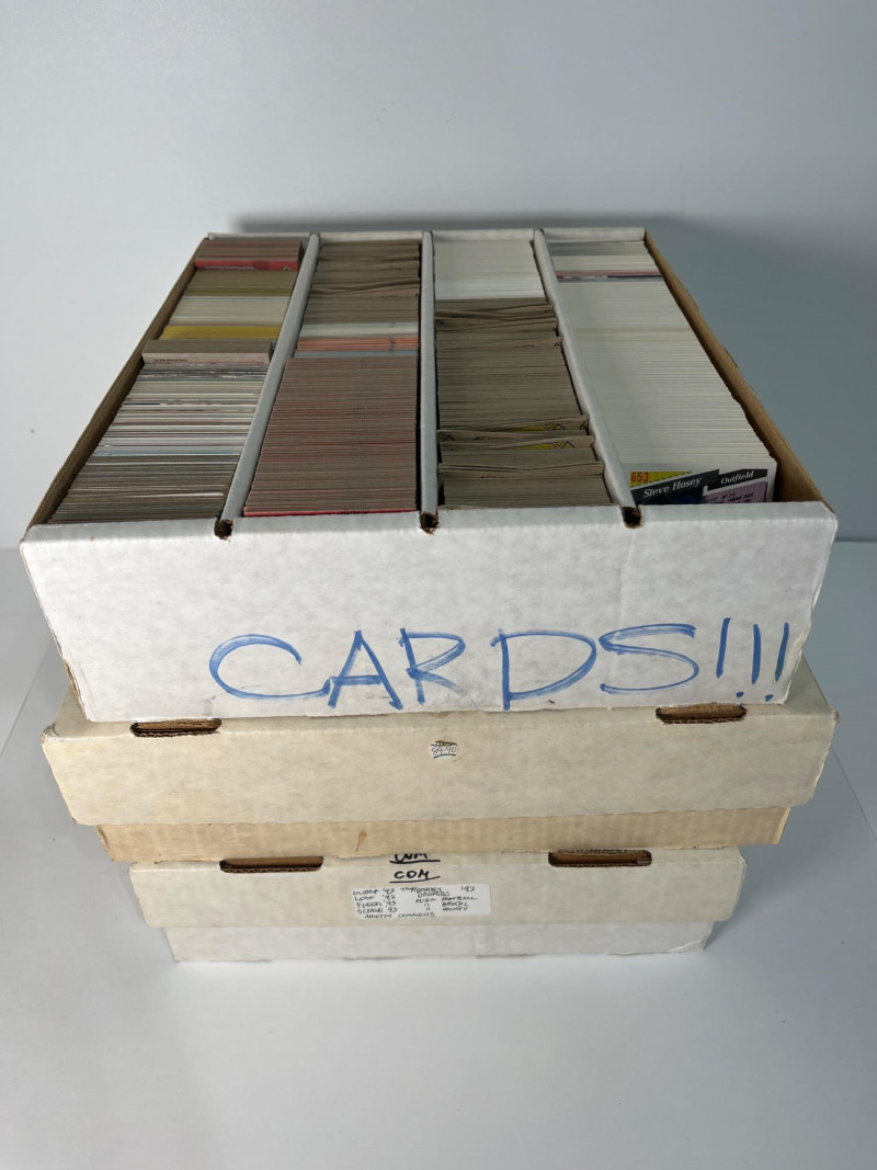 This lot includes three boxes of both baseball and football cards from multiple manufacturers such as Topps, Upper Deck and Fleer. One box is mostly football while two boxes are all baseball. A major majority of the cards are from the early 90s and late 80s. Condition and completeness of sets is unknown but just imagine the treasures you might find within these boxes! Please note that we do not go through trading card sets to assess their completeness. While we do make every effort to describe the exact contents of each lot, we cannot guarantee that a previously opened box contains every card advertised on its label. Unless the description expressly states that a case or box is sealed, please assume that the card set inside is or may be incomplete.