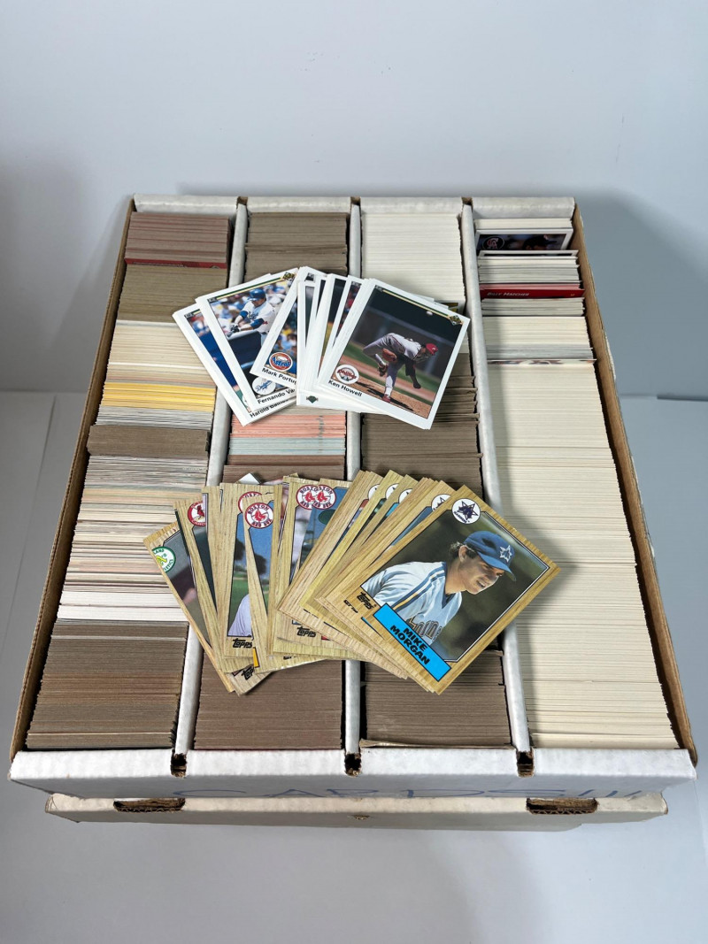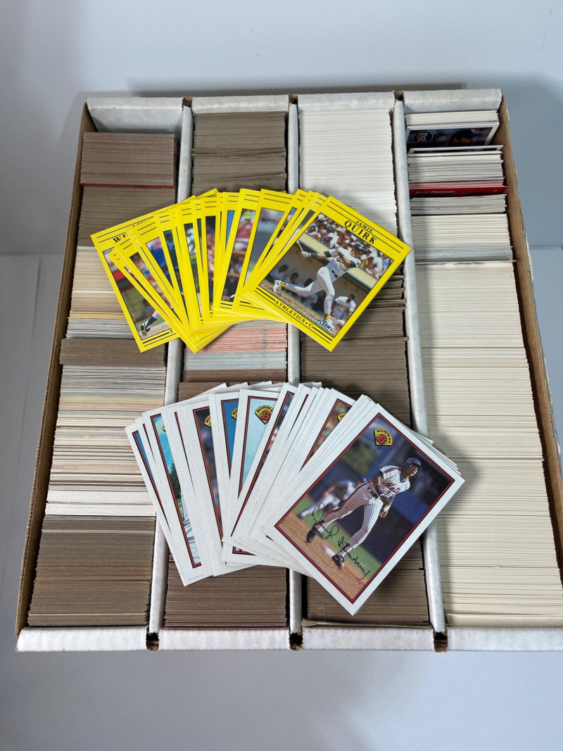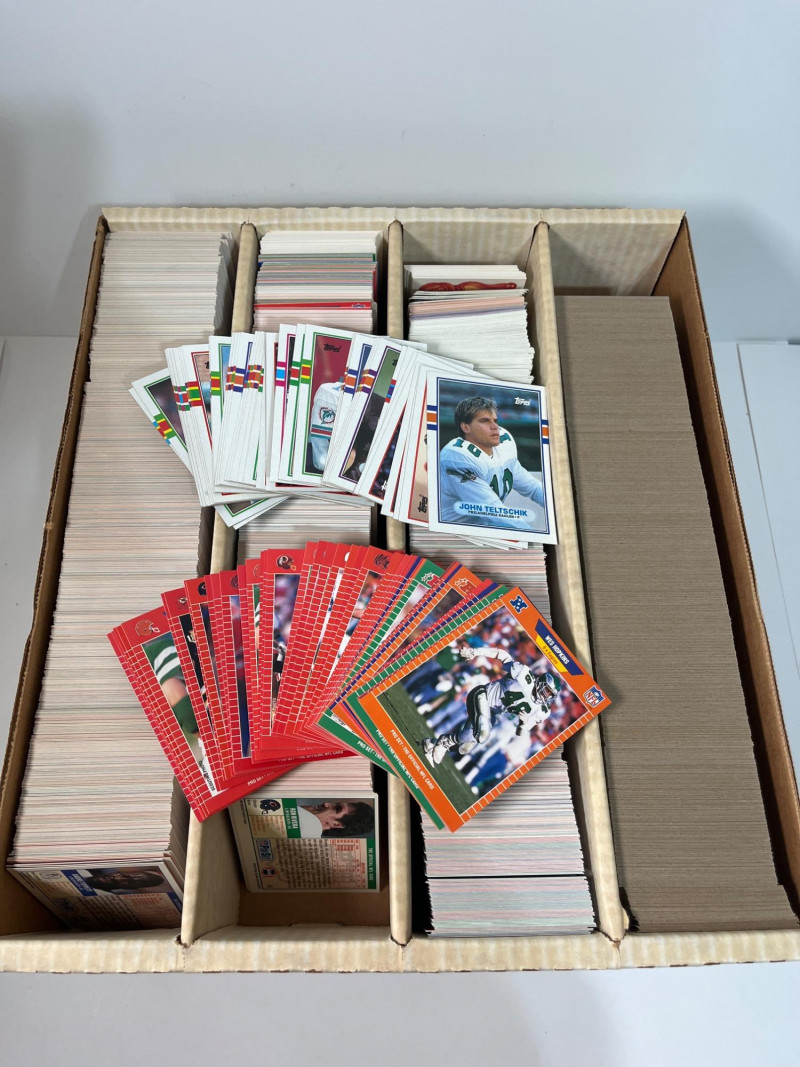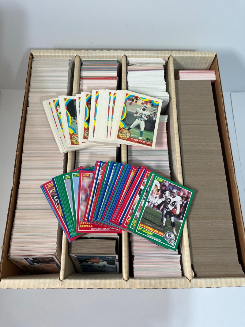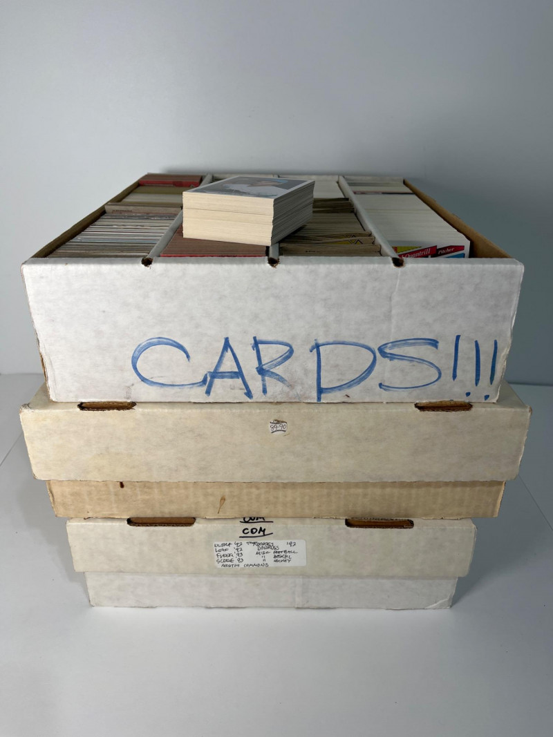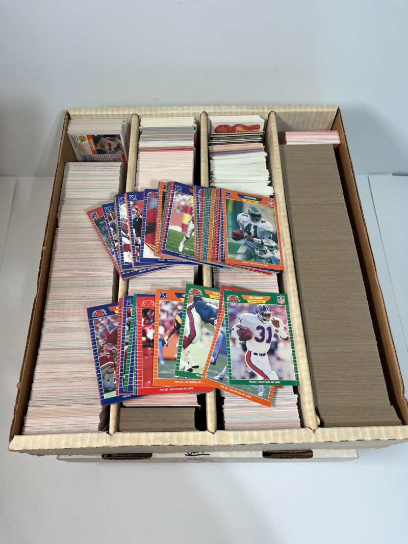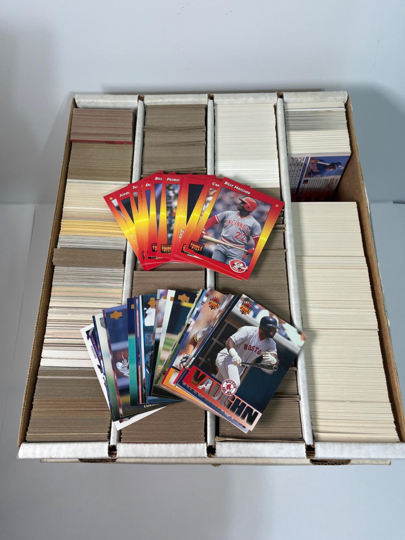 This lot includes three boxes of both baseball and football cards from multiple manufacturers such as Topps, Upper Deck and Fleer. One box is mostly football while two boxes are all baseball. A major majority of the cards are from the early 90s and late 80s. Condition and completeness of sets is unknown but just imagine the treasures you might find within these boxes! Please note that we do not go through trading card sets to assess their completeness. While we do make every effort to describe the exact contents of each lot, we cannot guarantee that a previously opened box contains every card advertised on its label. Unless the description expressly states that a case or box is sealed, please assume that the card set inside is or may be incomplete.