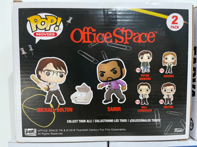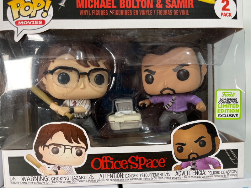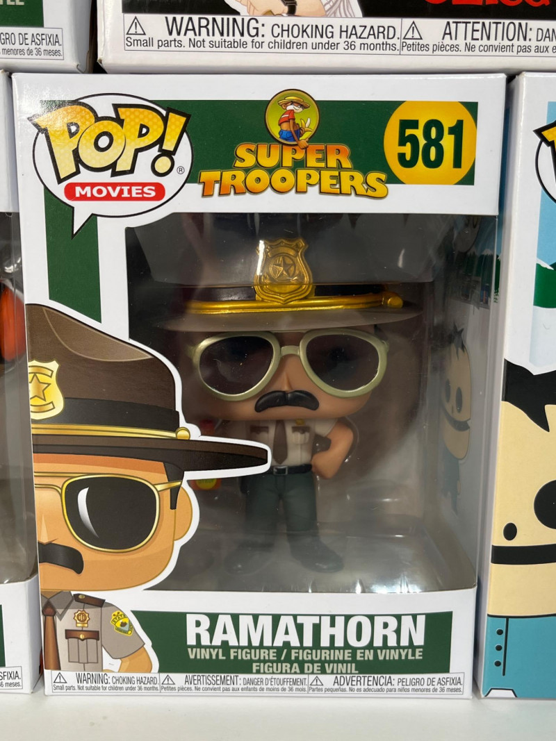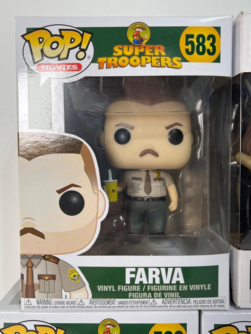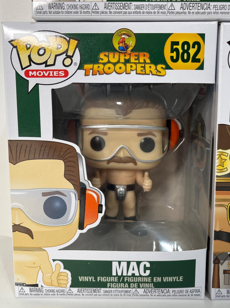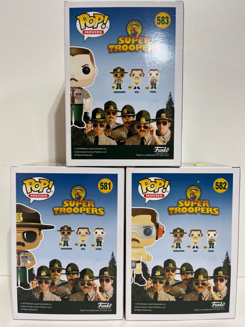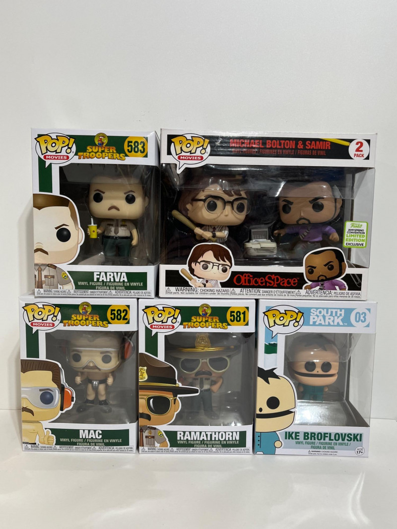 This Funko Pop! lot consists of Michael Bolton and Samir from Office Space in a 2 pack, Ike Broflovski from South Park #3, Farva #583, Mac #582, and Ramathorn #581, all from Super Troopers. All five figures are in their original packages which look to be unopened.