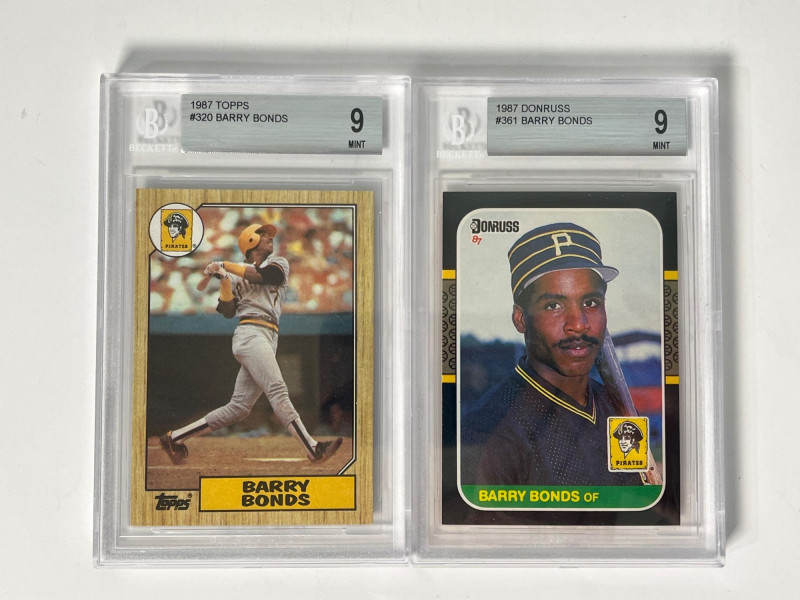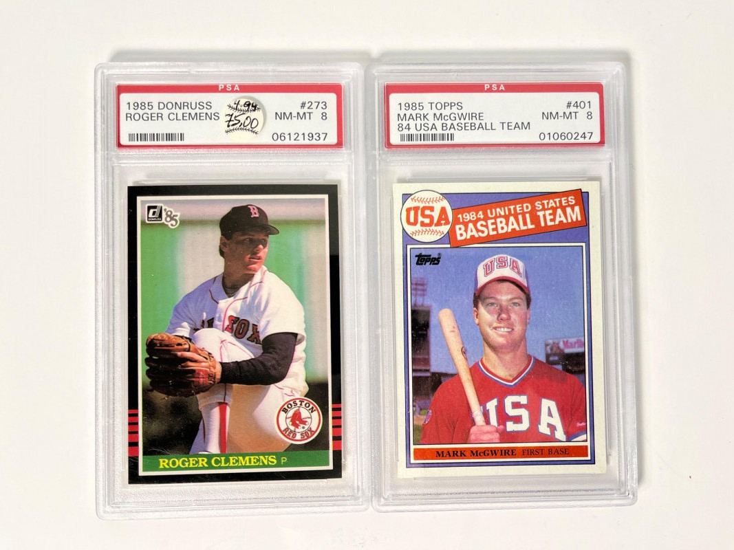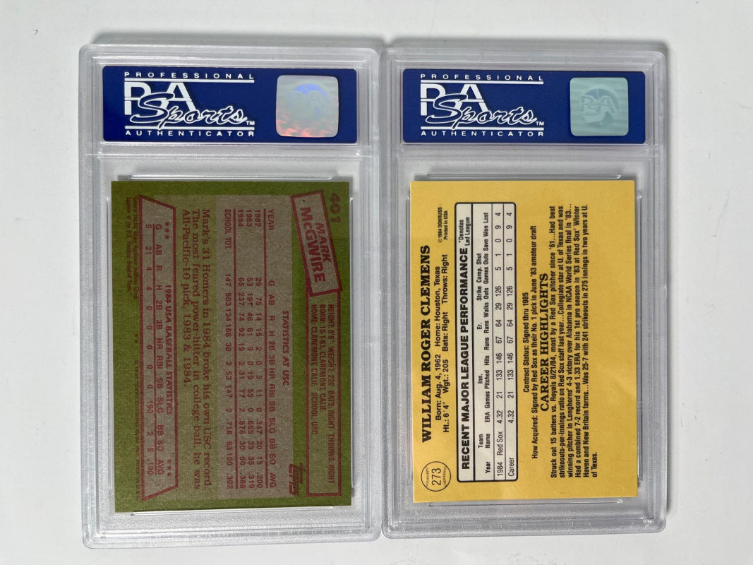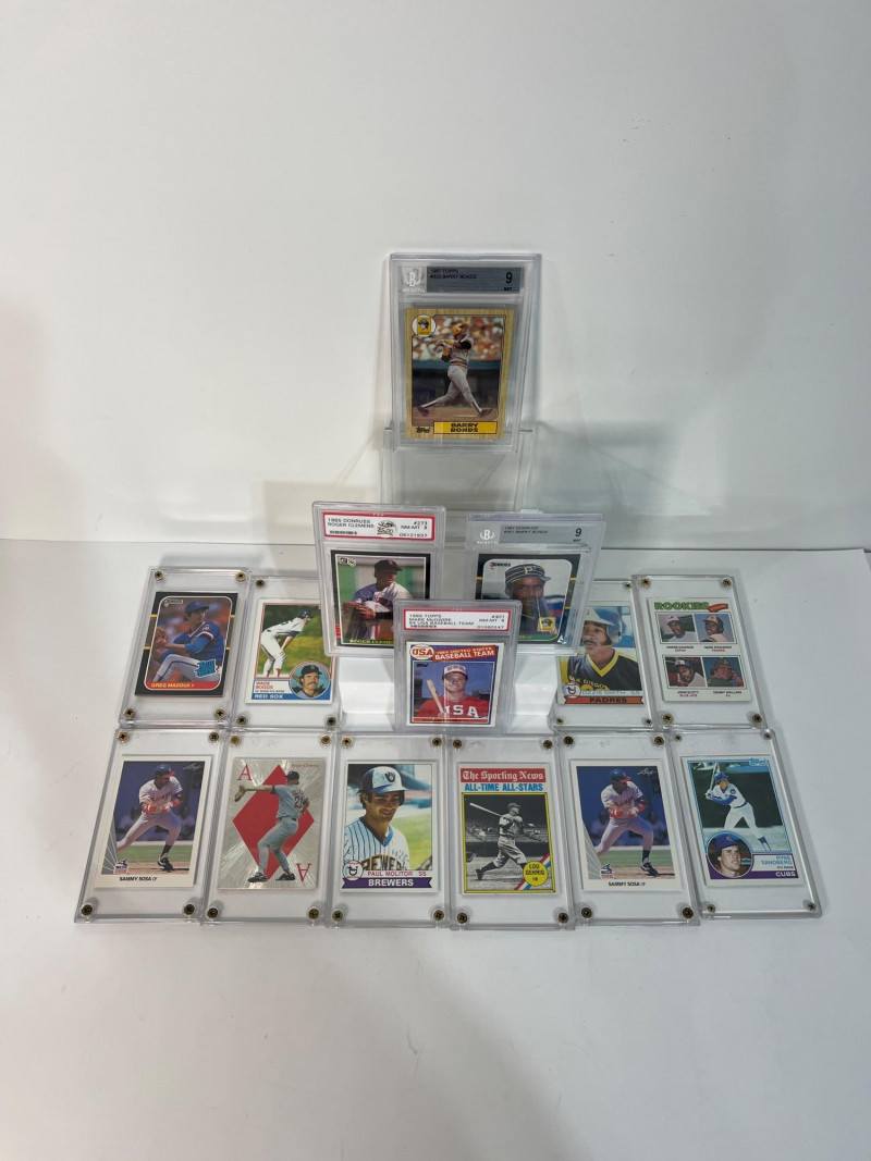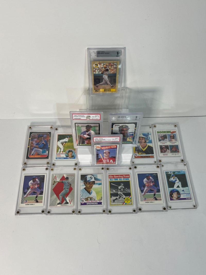 This lot includes an impressive collection of both graded and plastic case mounted baseball cards from popular players. The collection includes two mint Gary Bonds cards, a mint Roger Clements card and a mint Mark McGuire 1984 United States baseball team card. The cards in the plastic mounts are ungraded so official condition is unknown.