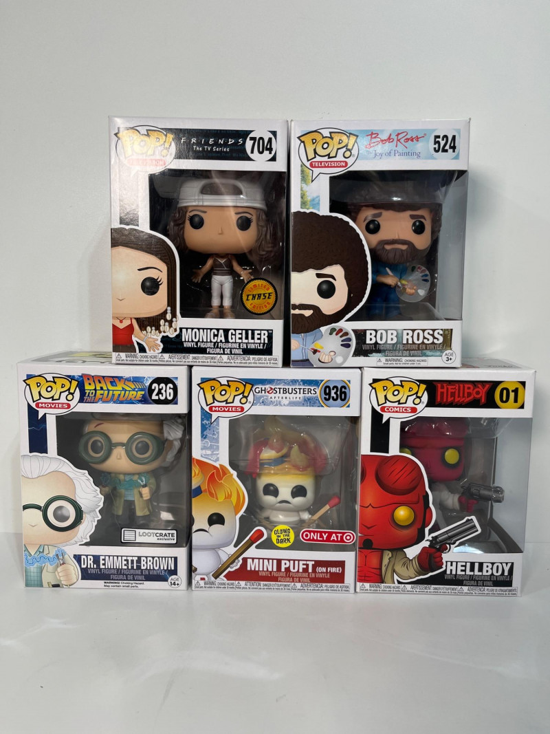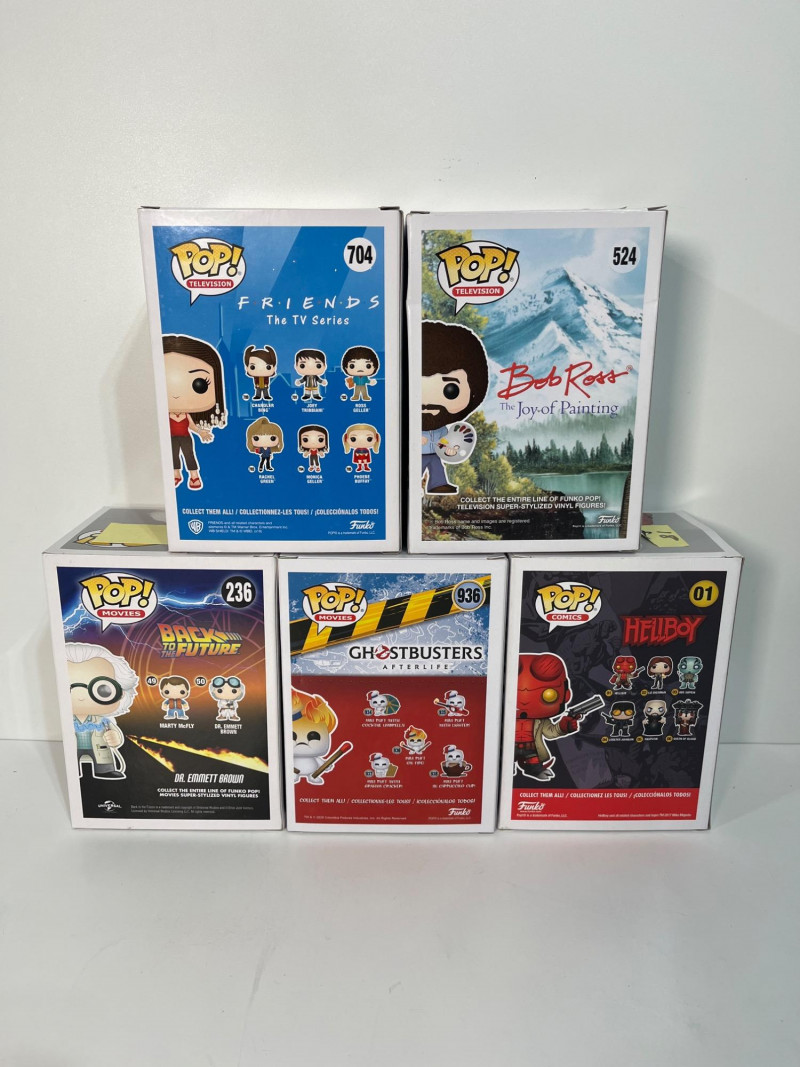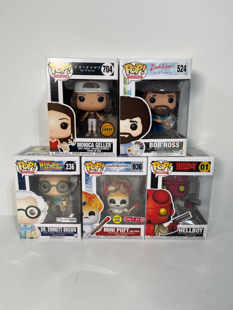 This fun lot of Funko pop figurines includes Monica Geller from Friends #704, Bob Ross #524, Hellboy #1, Ghostbusters Mini Puft #936 and Dr. Emmett Brown from Back to the Future #236. All figures are in their original package which lot to be unopened.