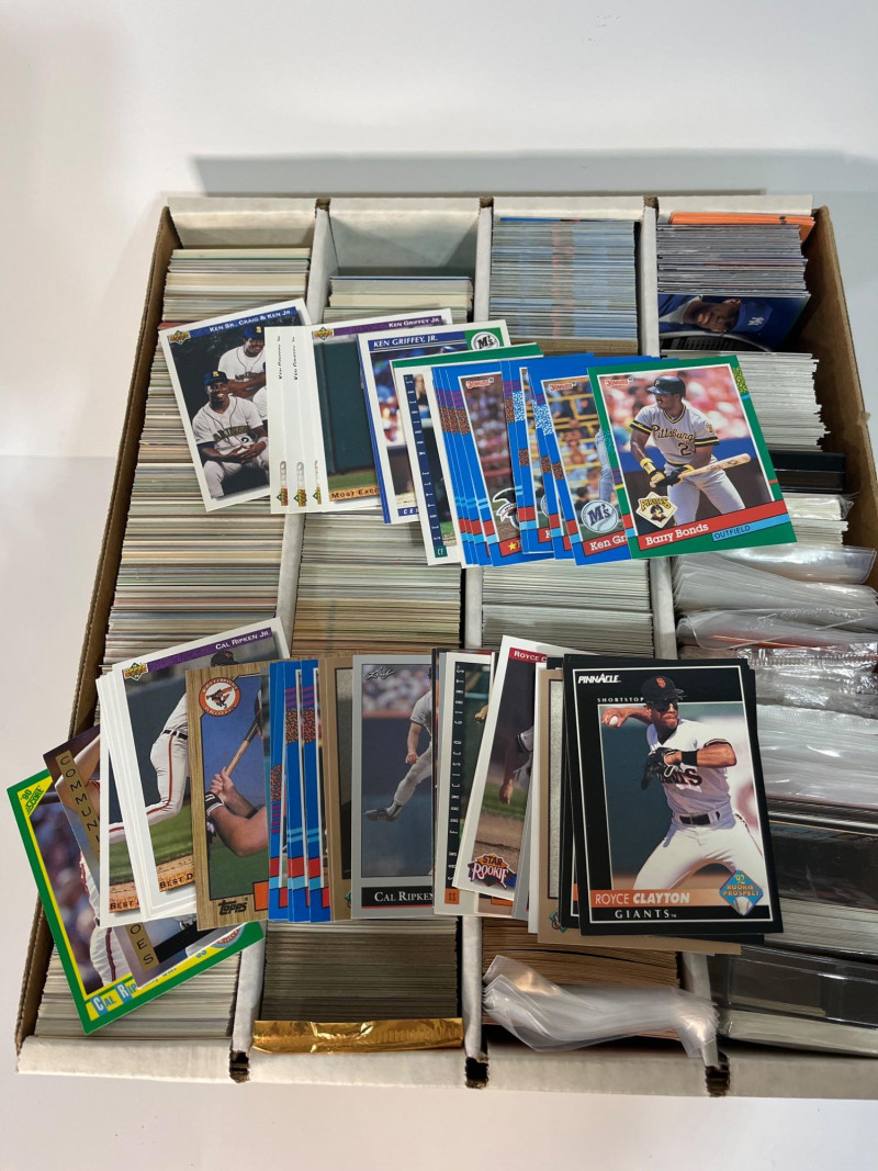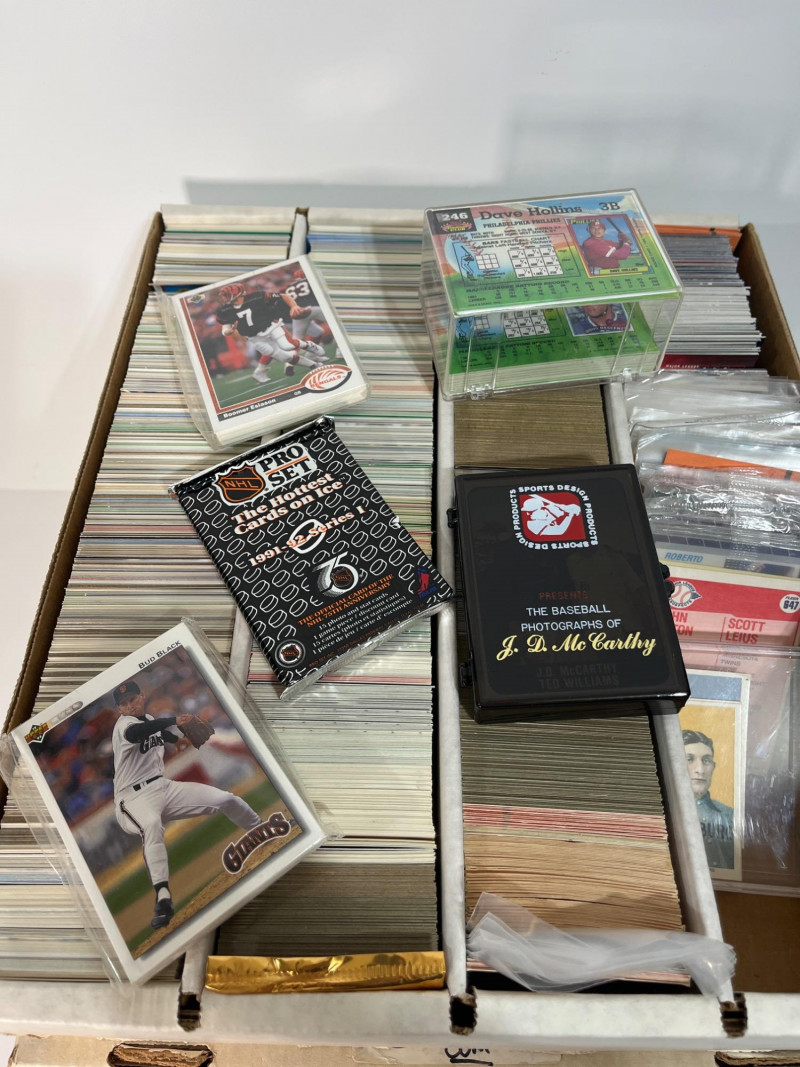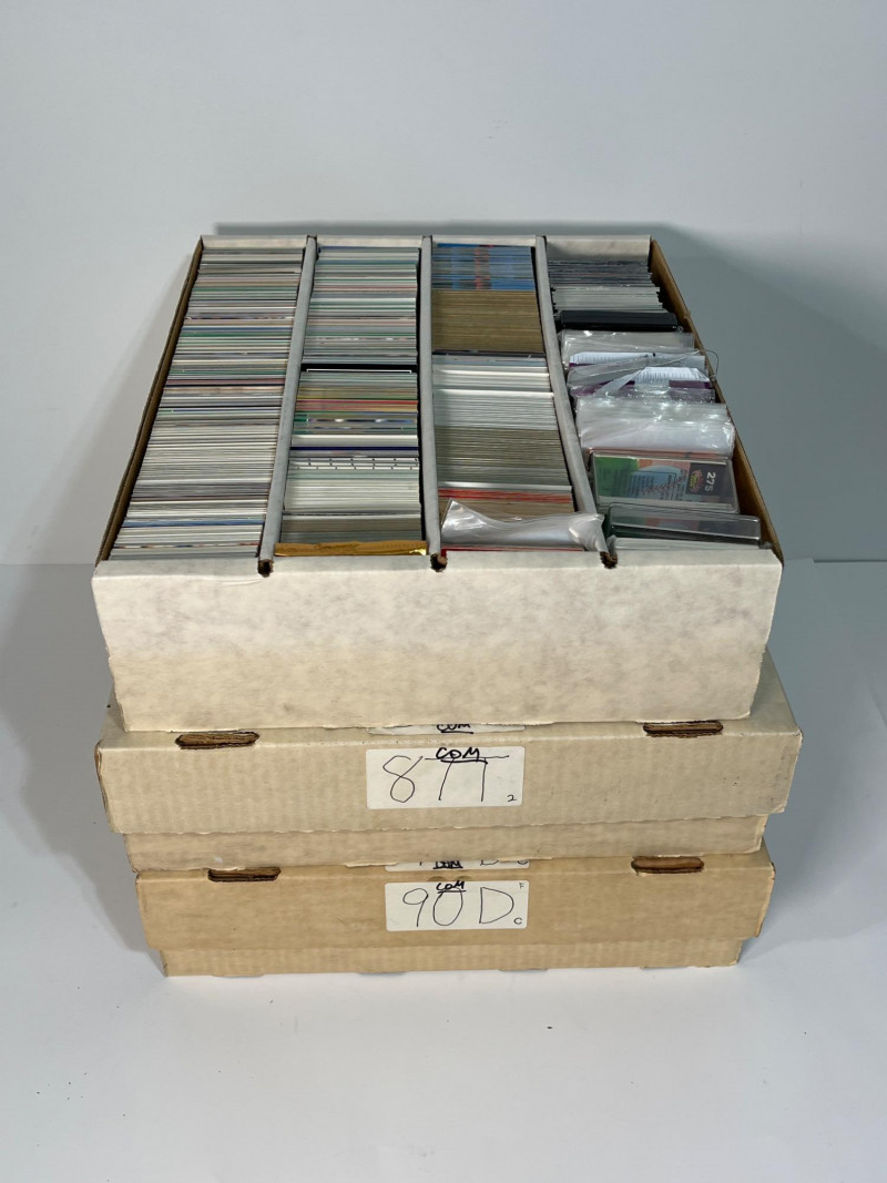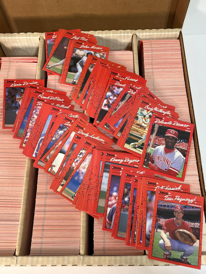 This lot of three boxes of baseball and other sports cards does come with mostly baseball cards and a few football and hockey cards. The first box has a wide range of years and manufacturers. The second box has numerous duplicates and the third box doesn’t have many duplicates, but they are the same manufacturer, Donruss. Please note that we do not go through trading card sets to assess their completeness. While we do make every effort to describe the exact contents of each lot, we cannot guarantee that a previously opened box contains every card advertised on its label. Unless the description expressly states that a case or box is sealed, please assume that the card set inside is or may be incomplete.