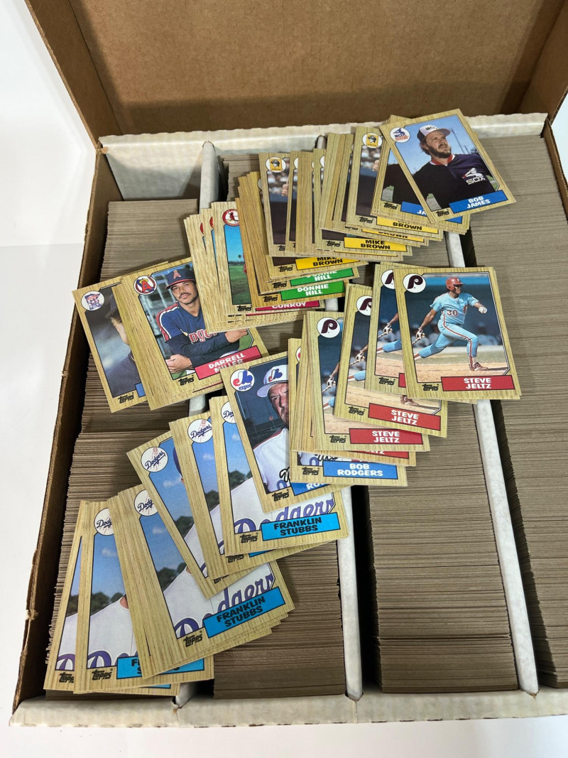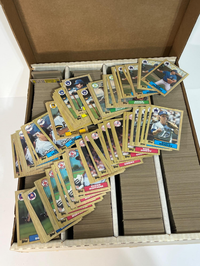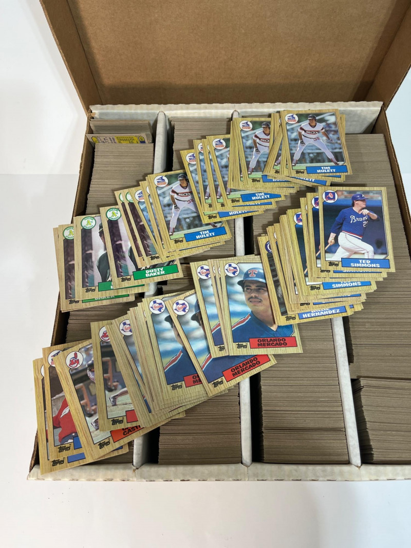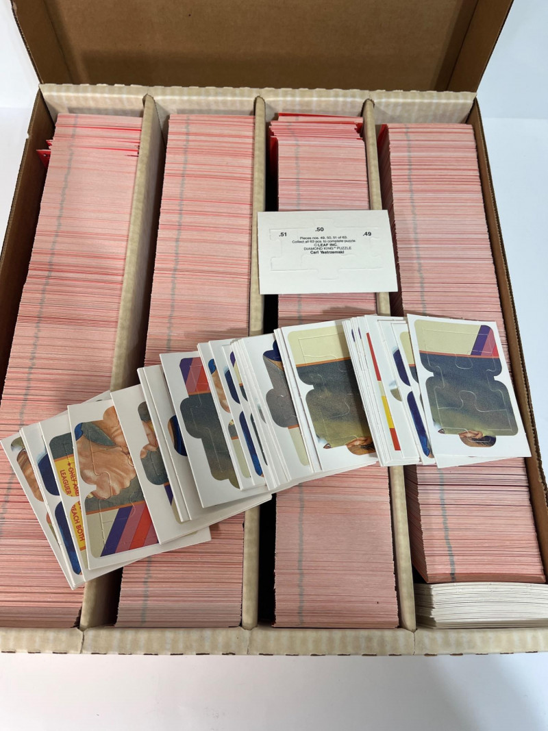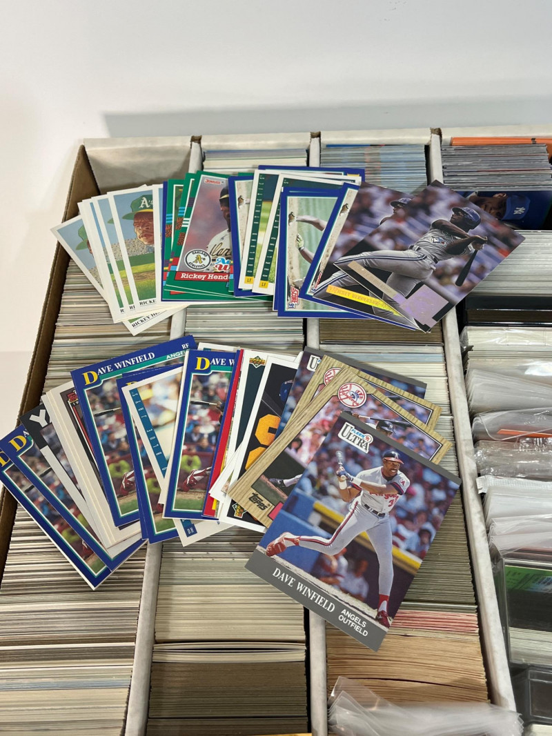 This lot of three boxes of baseball and other sports cards does come with mostly baseball cards and a few football and hockey cards. The first box has a wide range of years and manufacturers. The second box has numerous duplicates and the third box doesn’t have many duplicates, but they are the same manufacturer, Donruss. Please note that we do not go through trading card sets to assess their completeness. While we do make every effort to describe the exact contents of each lot, we cannot guarantee that a previously opened box contains every card advertised on its label. Unless the description expressly states that a case or box is sealed, please assume that the card set inside is or may be incomplete.