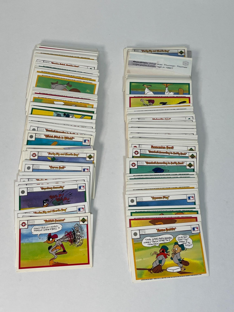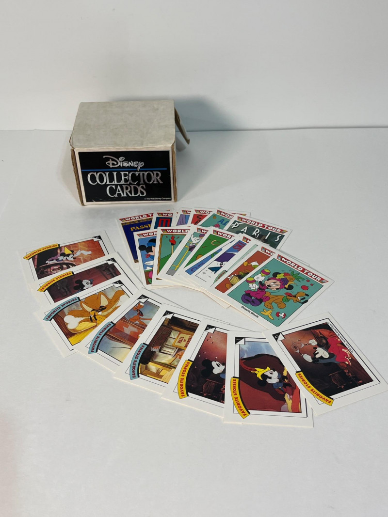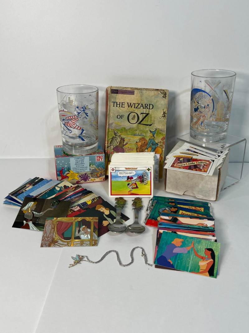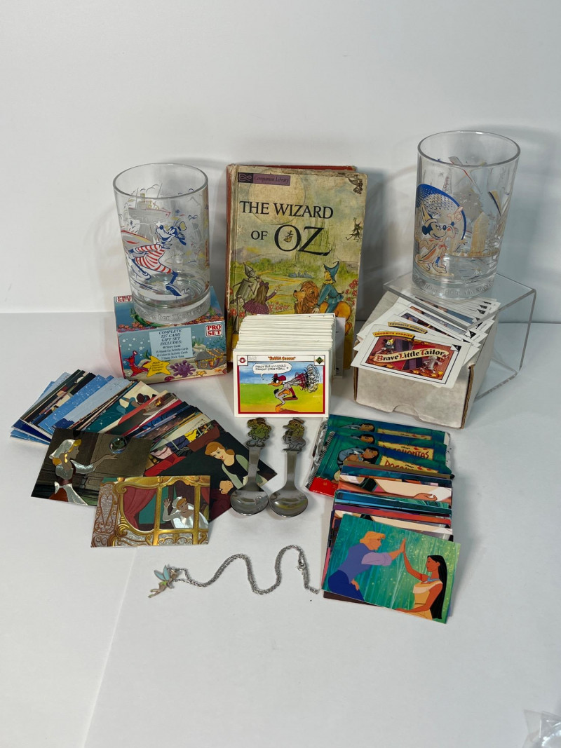 This is a fun lot of Disney, Looney Tunes, and a vintage Wizard of Oz/ Jungle Book book from the early 1960's. There are two Remember the Magic Disney collectible glasses from McDonald’s in the 1990’s. There is a Little Mermaid trader card set, a various but incomplete Cinderella trading card set, a Minnie Mouse and Donald Duck stainless steel spoon pair from the 1960s, a Tinker Bell necklace, and incomplete set of Pocahontas trading cards. Additionally, there is a set of Disney trading cards from 1991, and a collection of Looney Tunes sports trading cards. Condition and completeness of card sets are unknown.