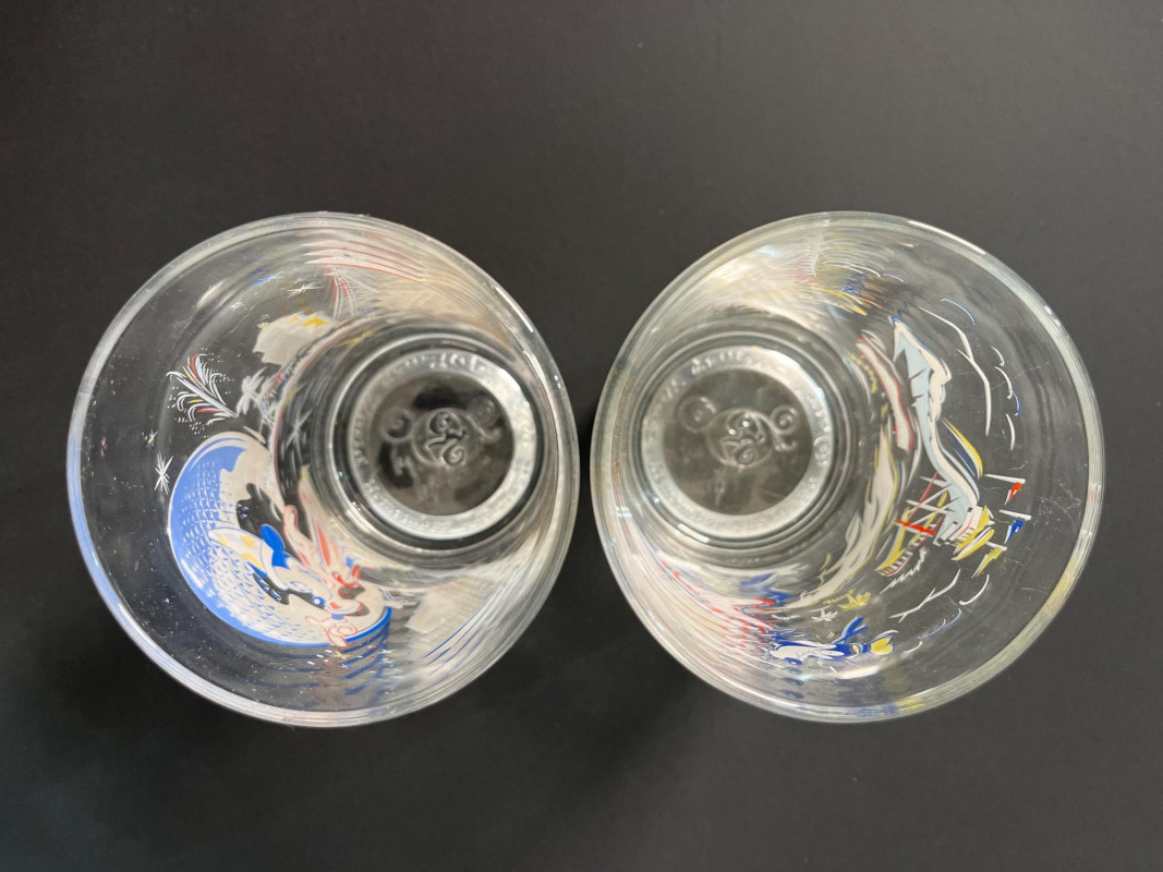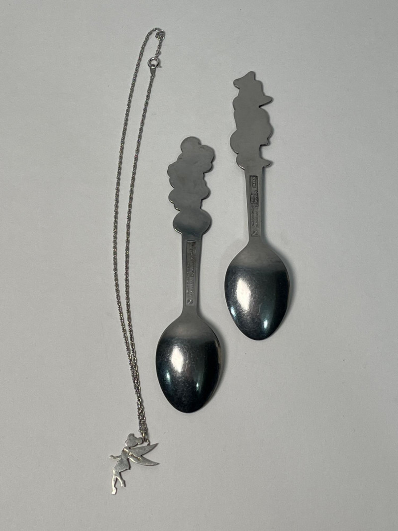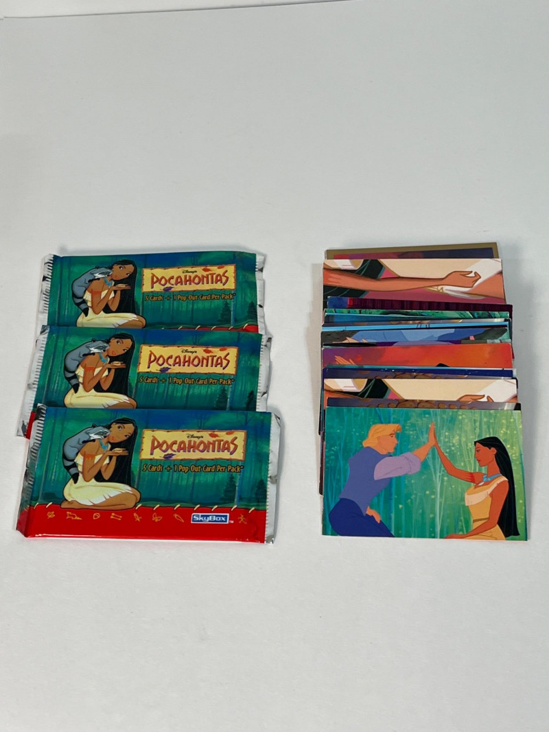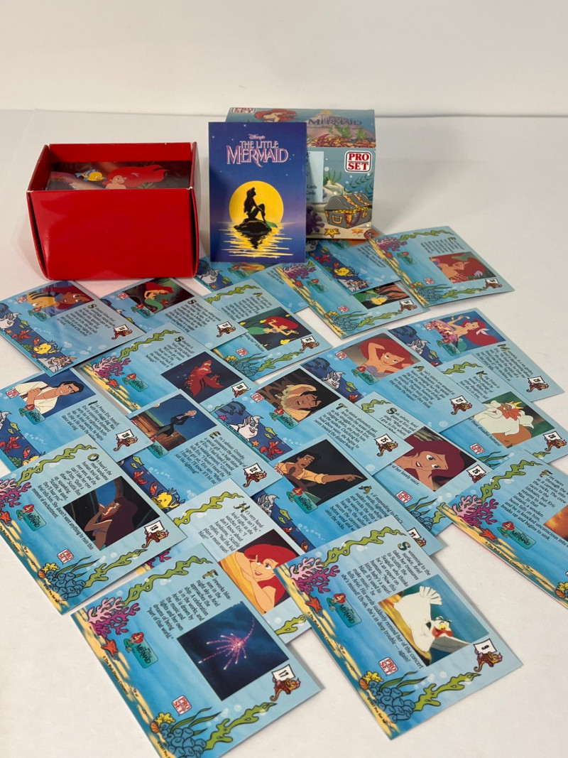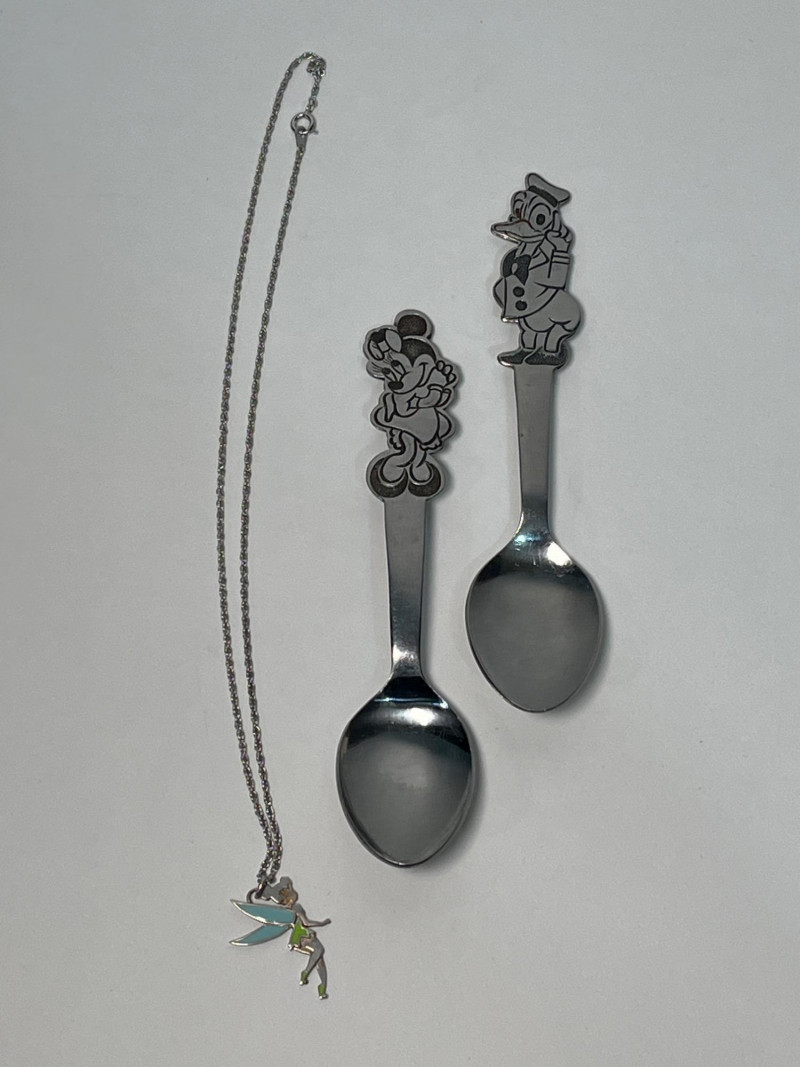 This is a fun lot of Disney, Looney Tunes, and a vintage Wizard of Oz/ Jungle Book book from the early 1960's. There are two Remember the Magic Disney collectible glasses from McDonald’s in the 1990’s. There is a Little Mermaid trader card set, a various but incomplete Cinderella trading card set, a Minnie Mouse and Donald Duck stainless steel spoon pair from the 1960s, a Tinker Bell necklace, and incomplete set of Pocahontas trading cards. Additionally, there is a set of Disney trading cards from 1991, and a collection of Looney Tunes sports trading cards. Condition and completeness of card sets are unknown.