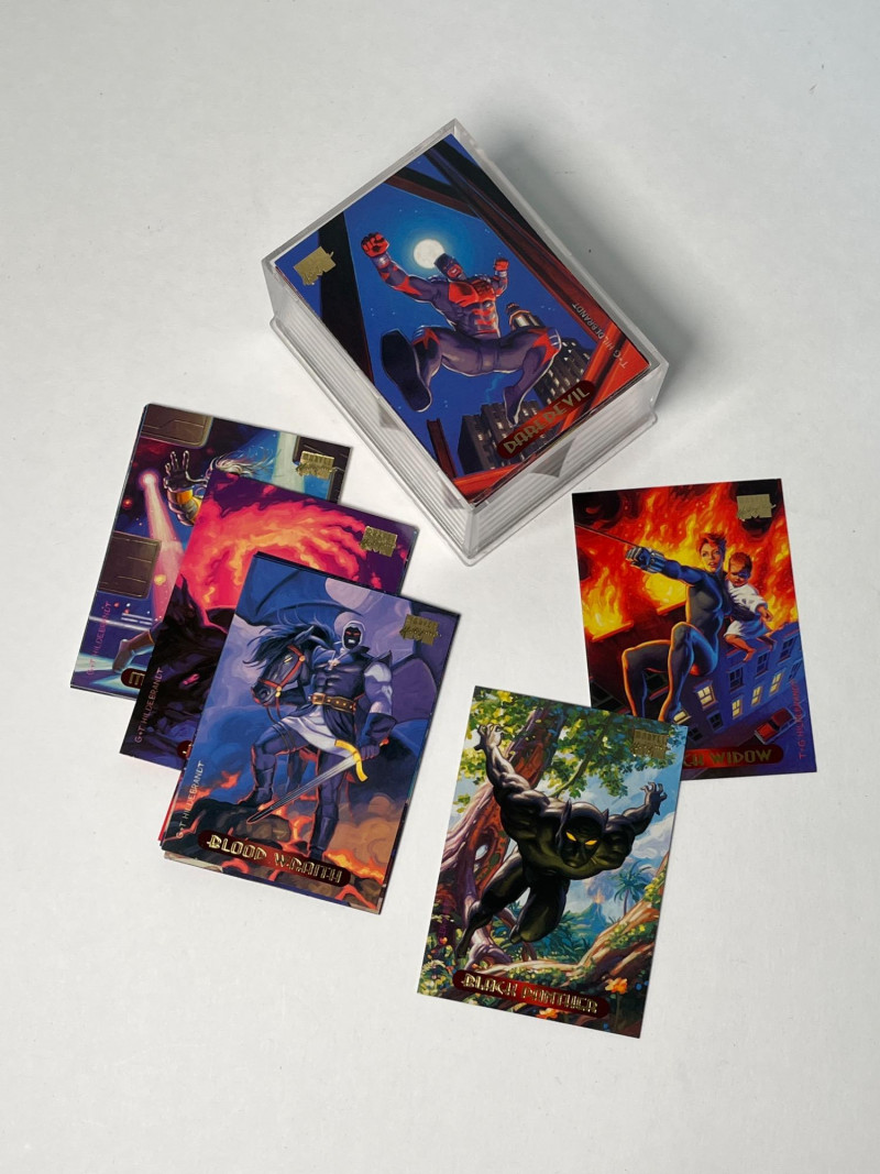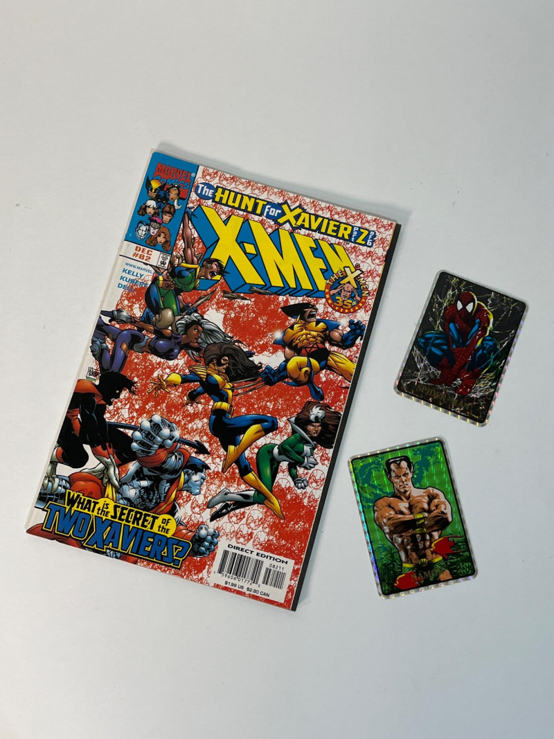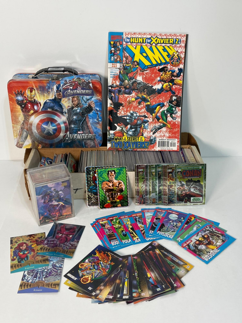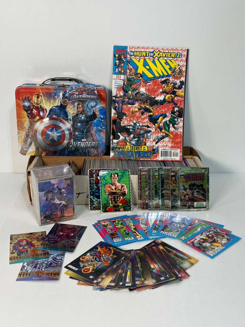 Calling all fans of the Marvel Universe! This lot features vintage styled, metal lunch box, an X-Men comic book, and several small collections of Marvel trading cards. Cards shown in photos are just a small sample and completeness of sets is unknown. Most cards are from the late 90's and many feature a foil finish.