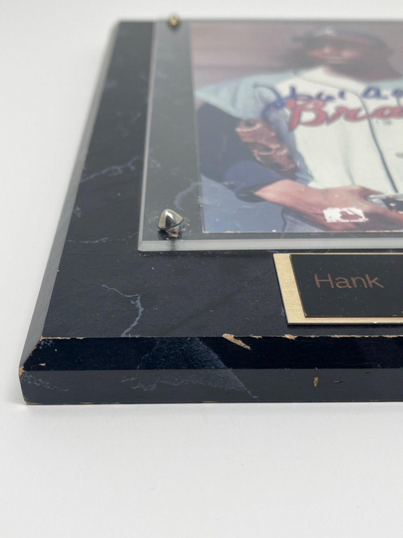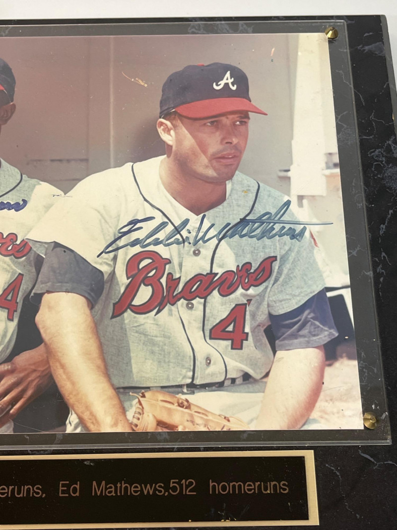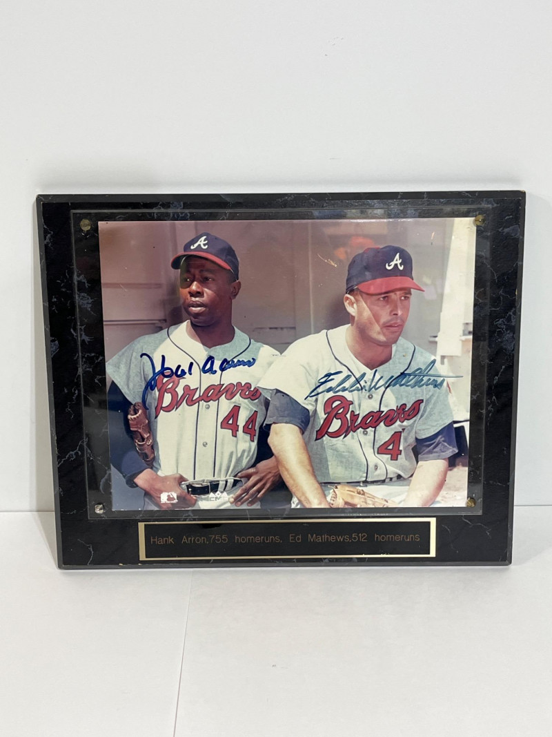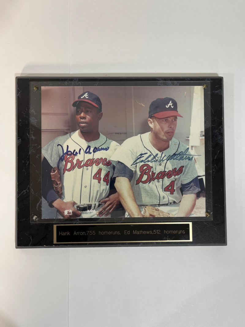 Autographed photo of Hank Aaron and Ed Mathews of the Atlanta Braves, year unknown. Photo is presented under plexiglass on a wood plaque that has a faux marble finish. The plaque is 13” x 10.5” and does have scratches to the finish and one screw holding the plexiglass down looks to have been replaced by a silver colored screw rather than a gold one like the other 3. The photo is 8” x 10”.
