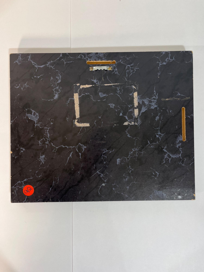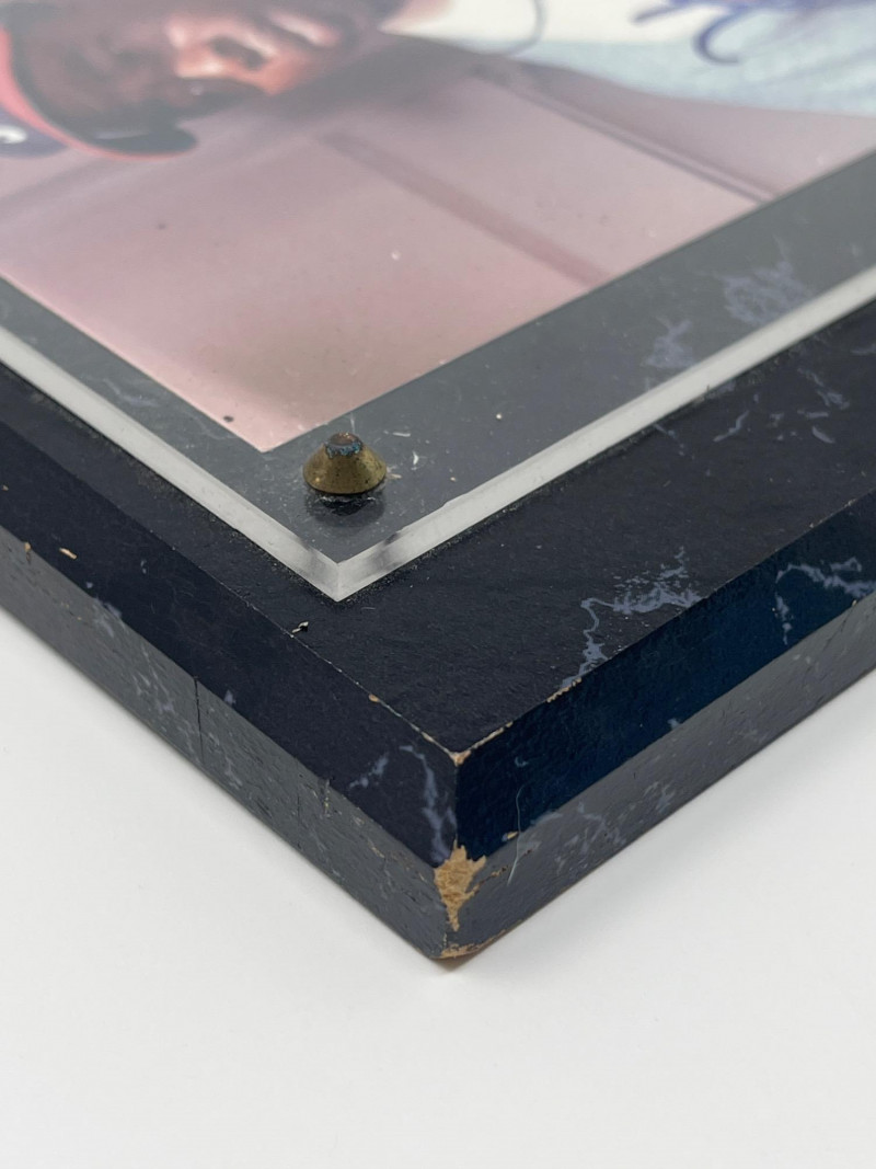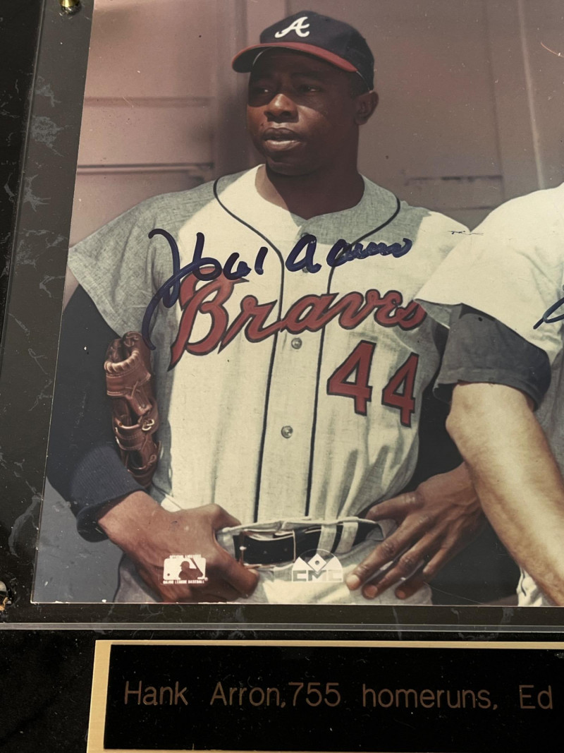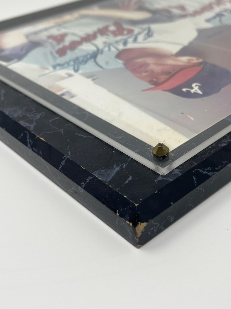 Autographed photo of Hank Aaron and Ed Mathews of the Atlanta Braves, year unknown. Photo is presented under plexiglass on a wood plaque that has a faux marble finish. The plaque is 13” x 10.5” and does have scratches to the finish and one screw holding the plexiglass down looks to have been replaced by a silver colored screw rather than a gold one like the other 3. The photo is 8” x 10”.