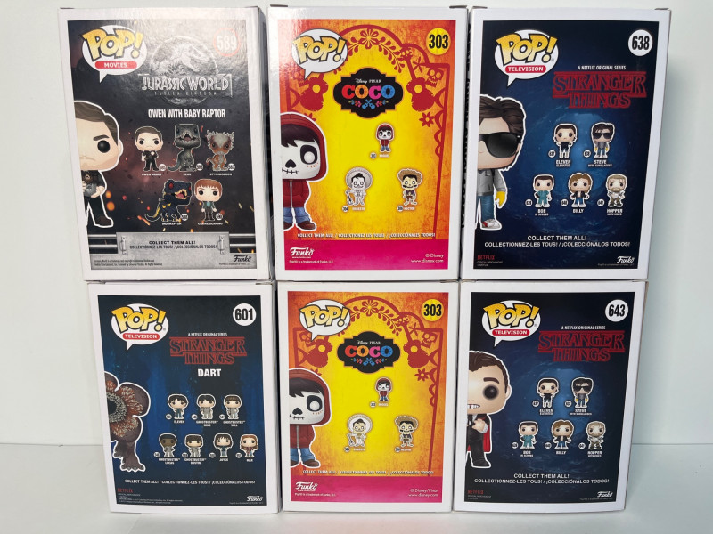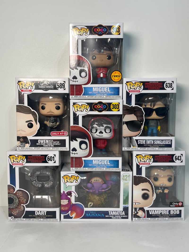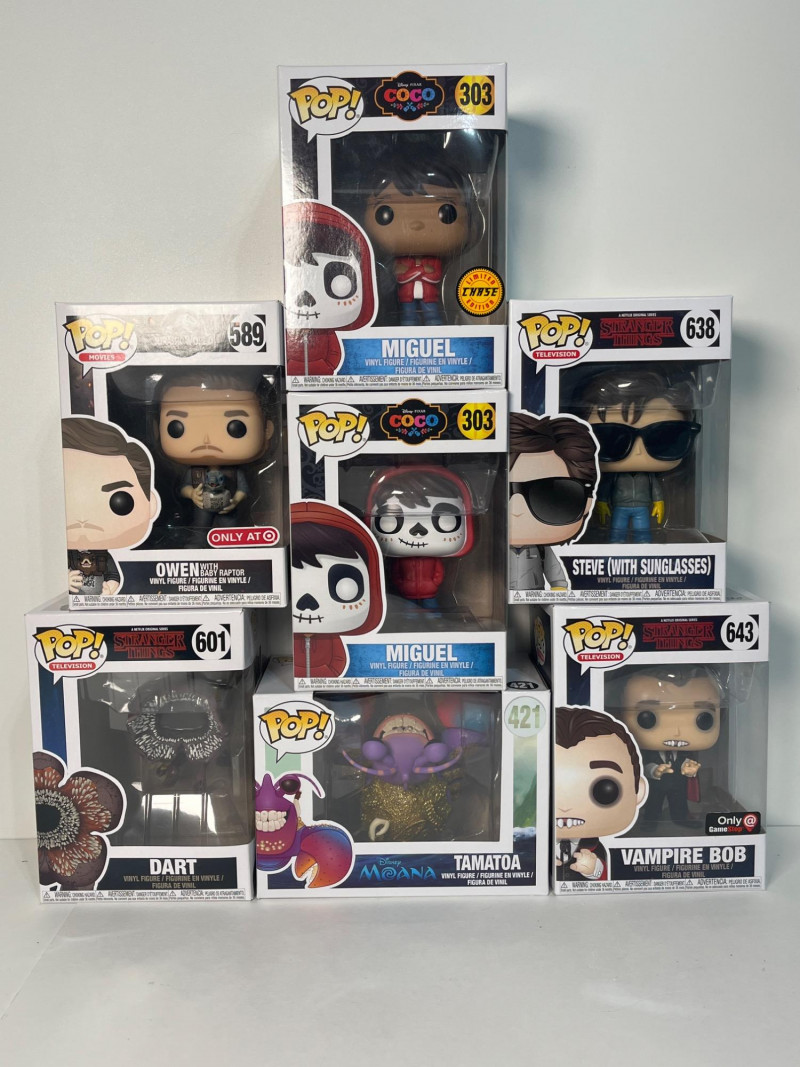 This lot of Funko Pop! figurines is a fun collection including Tamatoa from Disney’s Moana #421, Miguel #303 (one is the limited edition), Owen from Jurassic World #589, and three from Stranger Things including Dart #601, Vampire Bob #643, and Steve #638. All figurines are in their original package which looked to be unopened.