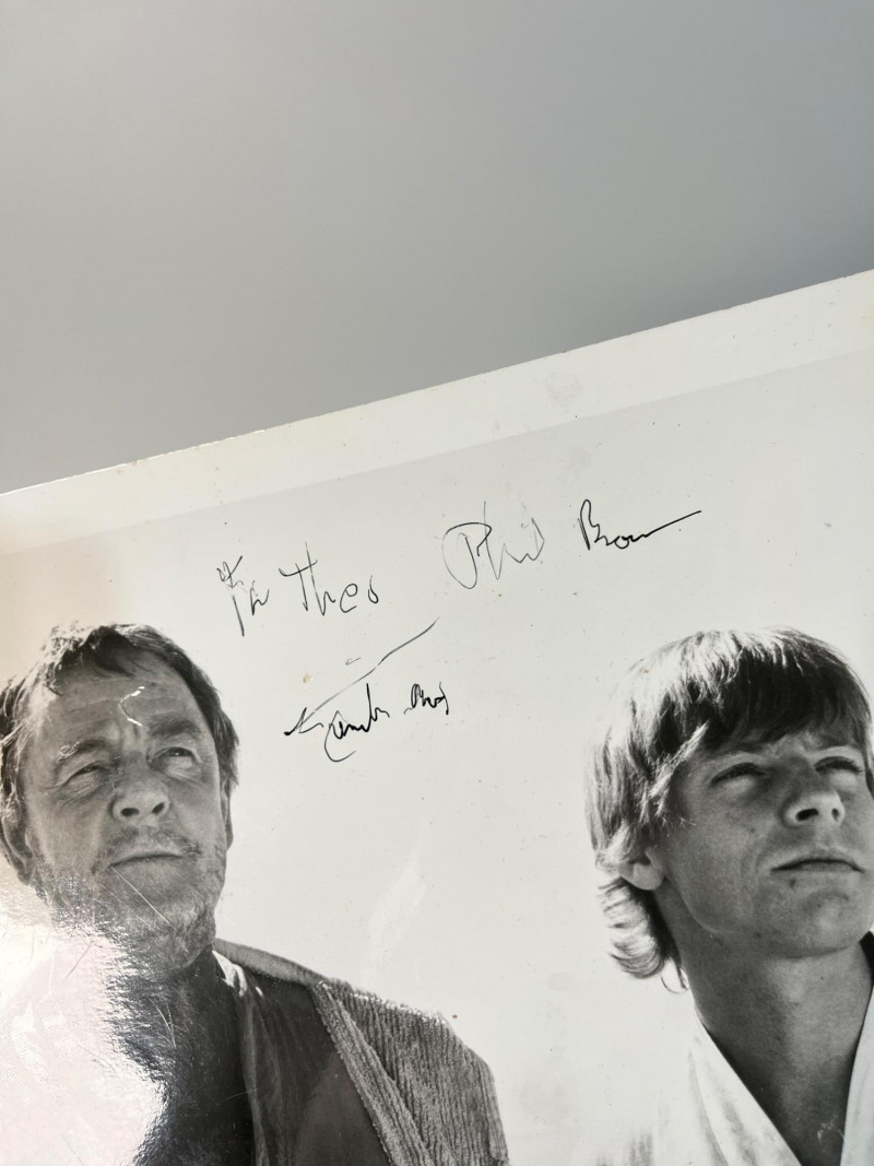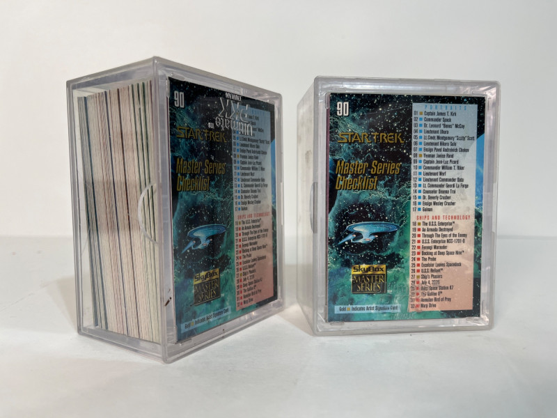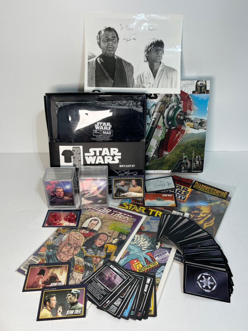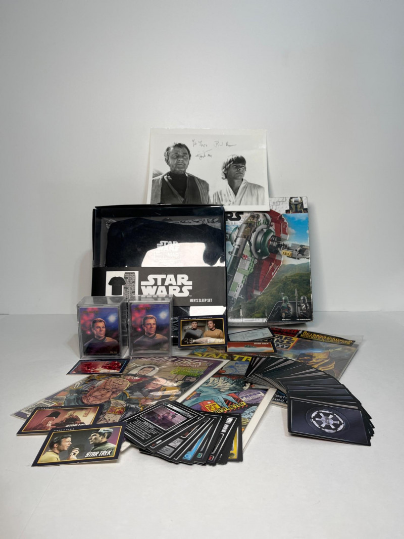 The age-old question remains, 'Which is better? Star Wars or Star Trek?' Why choose? This lot has a little of both! For the Trekkies there are comic books and trading cards. For all of us Nerf Herders there is a Lego set, trading cards, a pair of pajamas still in their original package (men's size large), and a photo of Luke and his uncle Owen signed by the actor who played Owen in the 1979 film, Phil Brown. Please note that we do not go through trading card sets to assess their completeness. While we do make every effort to describe the exact contents of each lot, we cannot guarantee that a previously opened box contains every card advertised on its label. Unless the description expressly states that a case or box is sealed, please assume that the card set inside is or may be incomplete.