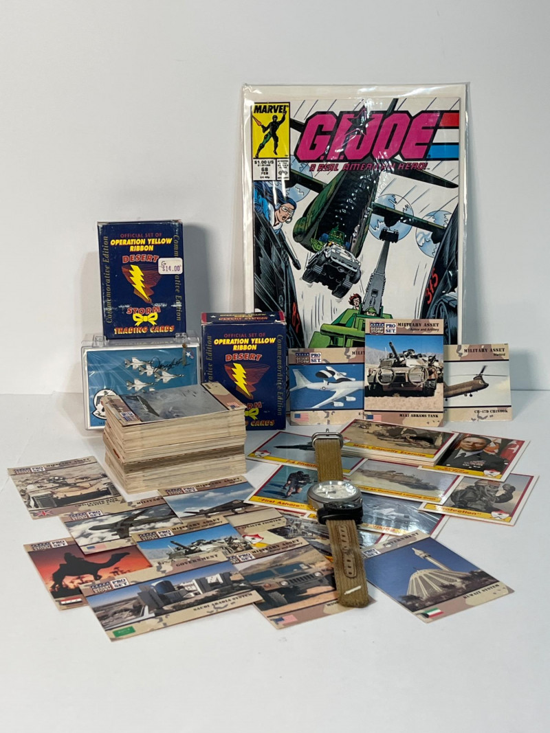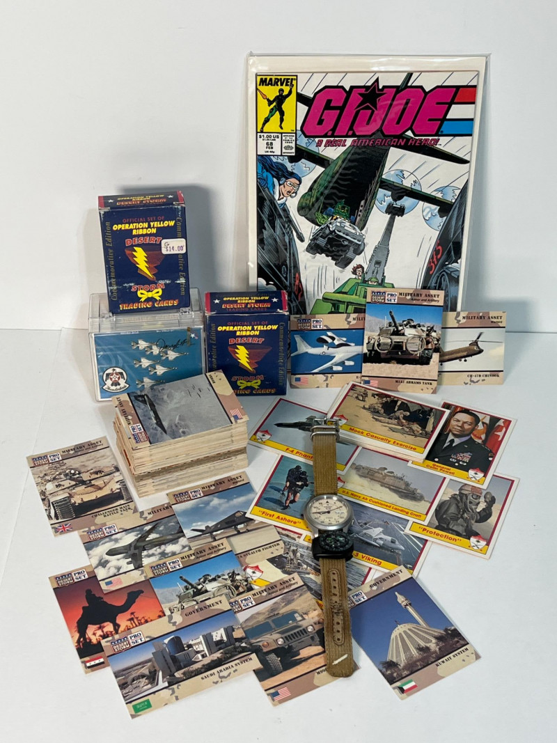 This lot features a large collection of desert storm trading cards from the early 1990's and a vintage GI Joe comic book the real star of the show here is the men's Seiko military watch with heavy duty nylon band. The watch is in working order.