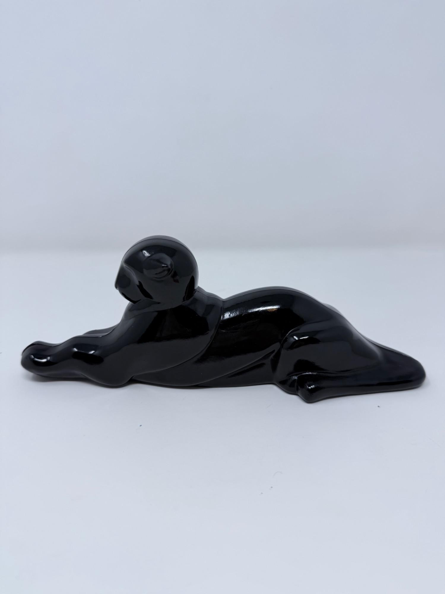 This is a vintage black panther figurine made using the Heisey mold, later produced by Imperial Glass. With its sleek Art Deco style and high-gloss black finish, this striking figurine is both a collectible and an elegant display piece. Manufacturer: Imperial Glass (Heisey mold) Material: High-gloss black glass Design: Reclining panther/tiger in a streamlined Art Deco style Dimensions: Approx. 8” long Condition: Excellent with minimal signs of wear.