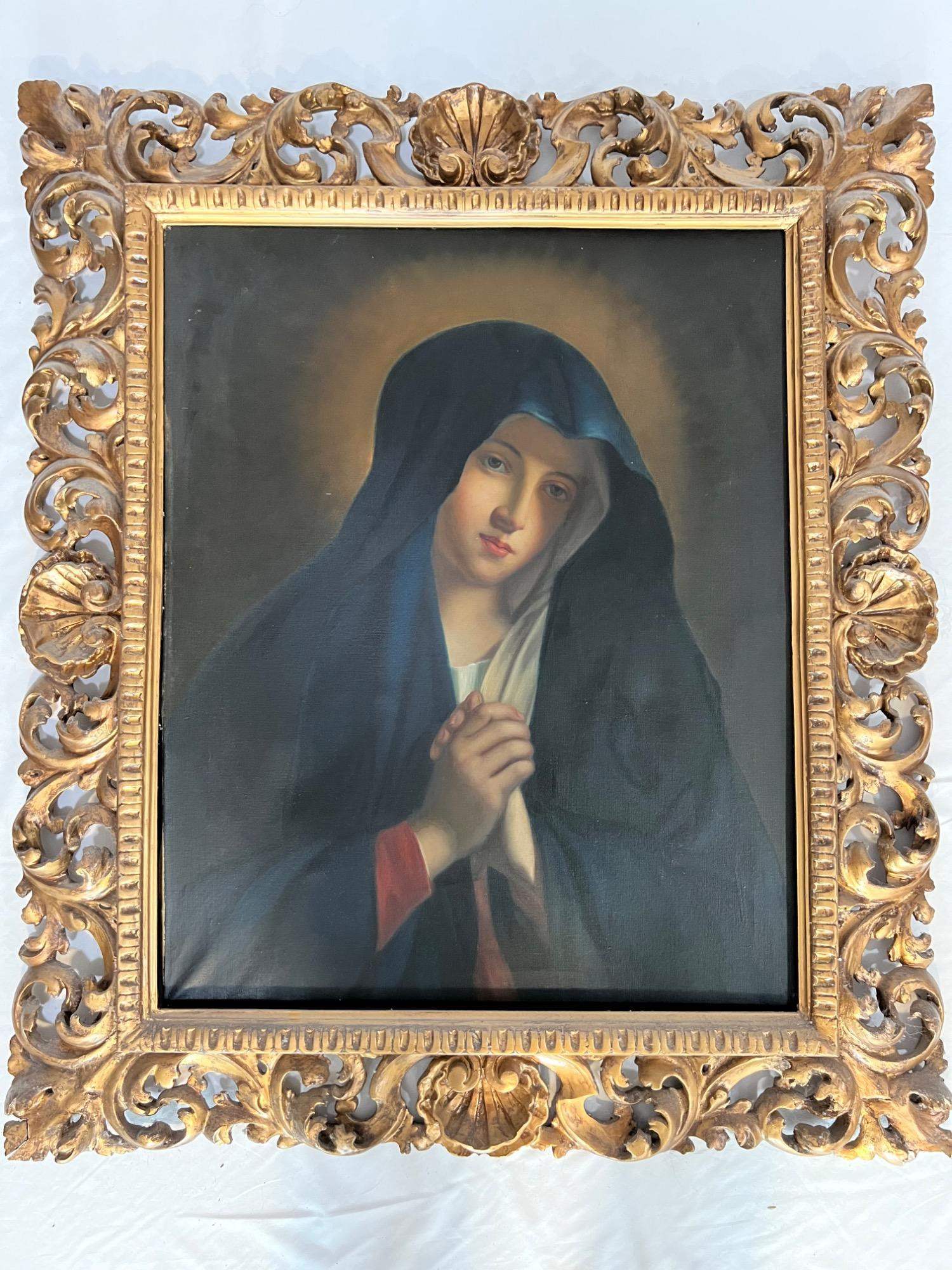 This oil-on-canvas painting is a beautifully executed copy of The Madonna in Sorrow, originally painted by the Italian Baroque master Giovanni Battista Salvi, known as Il Sassoferrato (1609–1685). The piece captures the Virgin Mary in a moment of sorrow, her hands gently clasped in prayer, with a solemn yet serene expression. Sassoferrato was renowned for his devotional and highly detailed depictions of the Virgin Mary, influenced by Renaissance masters such as Raphael and Perugino. His Madonna in Sorrow remains one of the most iconic and frequently copied religious paintings, symbolizing maternal grief and divine serenity. Details: Medium: Oil on canvas Frame: Ornate, hand carved, and gilded frame with intricate floral scrollwork Dimensions: 35" W x 39.5" H (Frame included) Condition: Some signs of wear and age-related patina on the frame (see photos). Provenance: Labeled on the back, indicating it was copied by C. Papi, likely in the Uffizi Gallery, Florence, Italy.