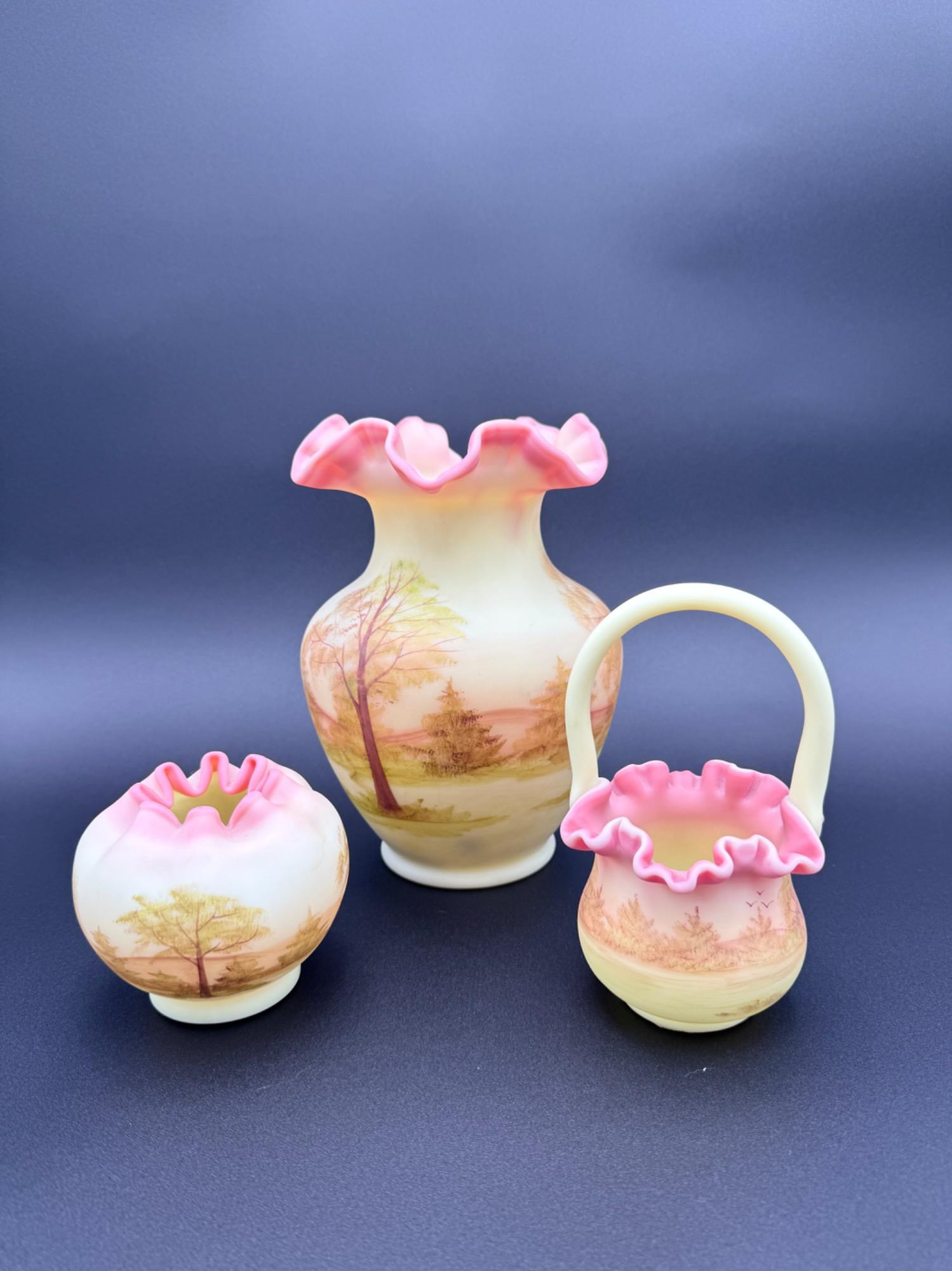 This stunning Fenton Burmese Glass 85th Anniversary Set is a rare and highly collectible trio, featuring hand-painted artistry and a mesmerizing uranium glow under UV light. Produced between 1885 and 1900, legend states that the name was provided by Queen Victoria who, upon receipt of the glass was said to have exclaimed the rich tones of blushing pink reminded her of a Burmese sunset. Created using pure gold and uranium, this set embodies Fenton’s legacy of craftsmanship. Each piece is individually signed by renowned artist Peggy Bennett, showcasing a serene autumn landscape with delicate trees. The ruffled edges and smooth satin finish highlight the iconic Burmese glass color transition from warm yellow to soft pink. Set Includes: Tall Vase: 6.5” W × 8.5” T – Classic flared ruffle top with hand-painted autumn tree design Handled Basket: 6.25” T × 3.25” W – Elegant curved handle, ruffled edge, scenic painting Small Vase: 3.25” T × 3.5” W – Compact yet striking, with the same signature Fenton artistry Key Features: Brand: Fenton Art Glass Material: Burmese glass (contains uranium and gold) Design: Hand-painted autumn tree motif Signed by: Peggy Bennett Origin: Handmade in the USA Special Feature: Glows under blacklight Condition: Excellent, with original Fenton label & tags.
