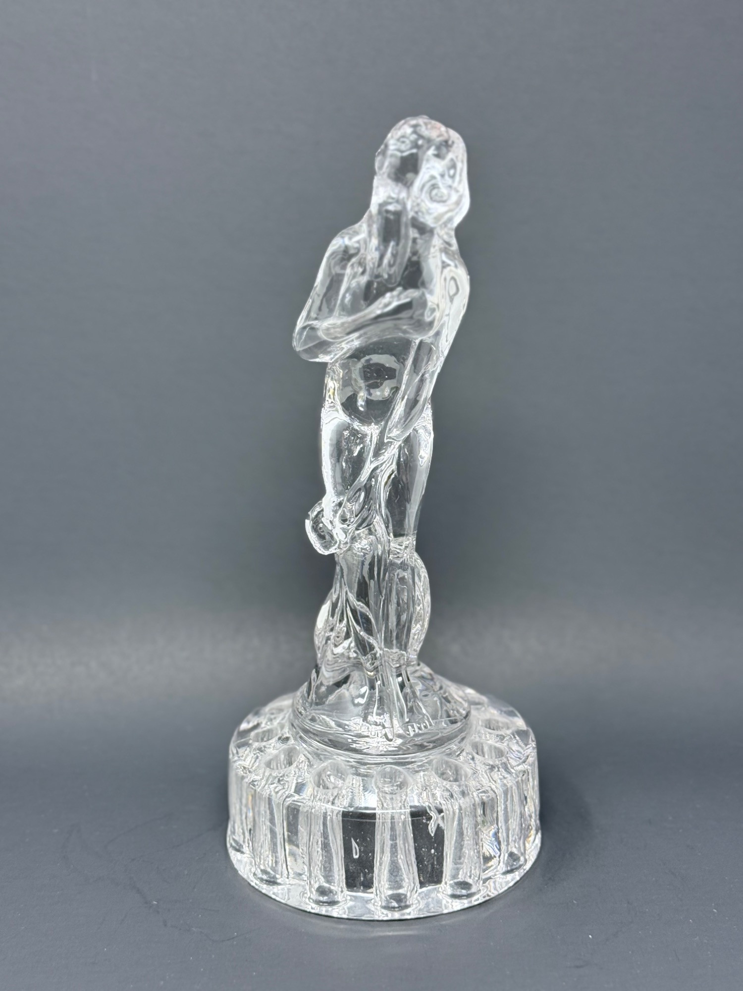 This elegant vintage glass figurine, known as Bashful Charlotte, was made by Cambridge Glass Company. Featuring a gracefully posed woman with a flowing draped design, it serves as both a decorative piece and a flower frog with multiple holes for arranging flowers. Features: Maker: Cambridge Glass Company Design: Elegant figurine of a modestly posed woman with a draped gown Material: Clear pressed glass Function: Decorative flower frog with multiple holes for arranging flowers Dimensions: 4 ⅞” wide x 10.5” tall Markings: Patent number 167158 embossed on the base Era: Likely early-to-mid 20th century