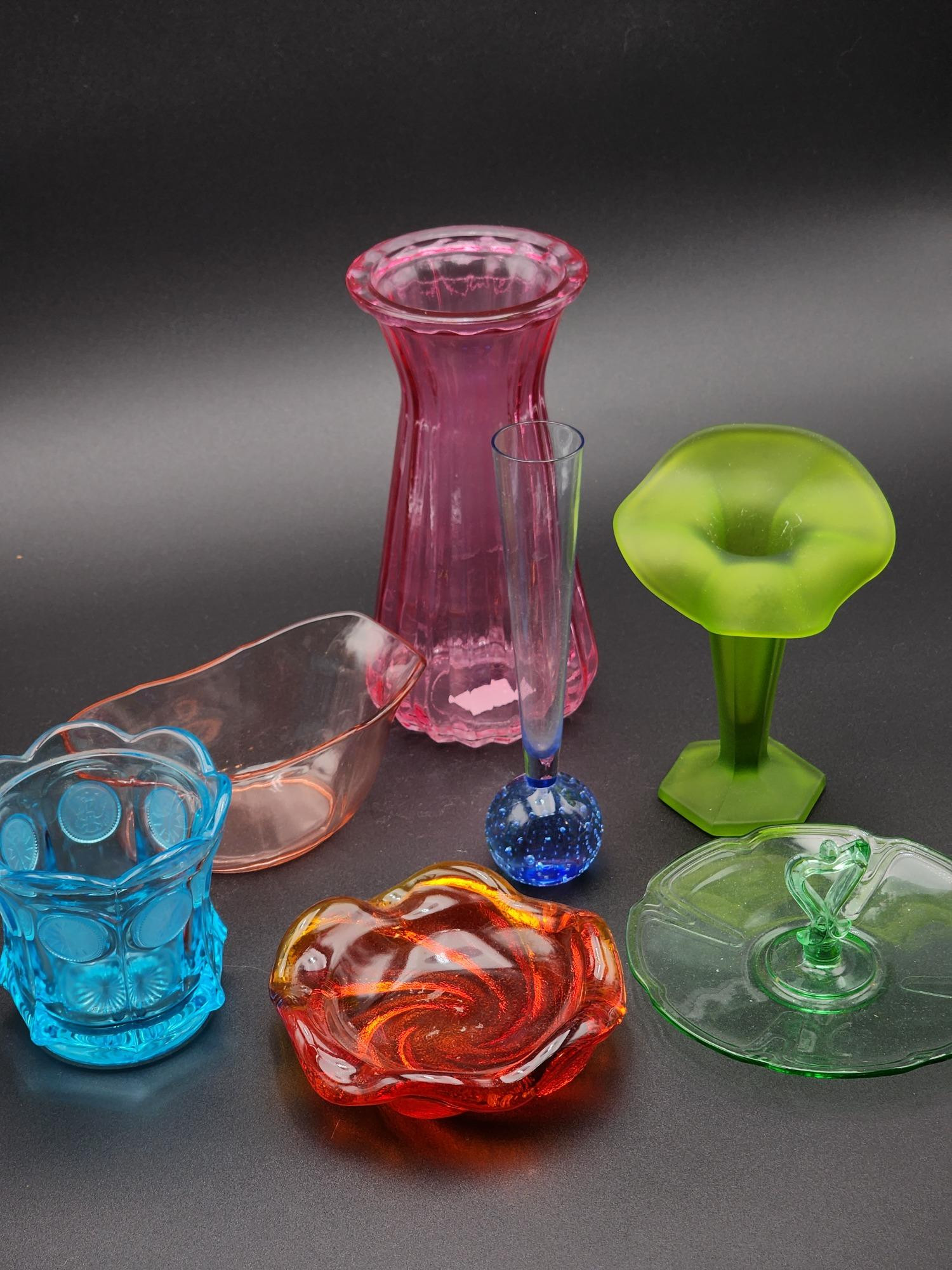 This elegant array of Eclectic Art Glass presents seven unique pieces for a colorful collection. The set includes: Tall Pink Vase – Flared rim with a subtle ribbed texture. 8.75 " tall Green Satin Glass Vase – Trumpet-style with a soft satin finish. 6.5" tall Blue Bud Vase – Slender design with a controlled bubble base. 8" tall Blue Coin Dot Tumbler – Patterned with a scalloped rim. 4" tall Pink Oval Dish – Delicate shape with a softly curved edge. 2.75" tall, 6.5" wide Orange Swirl Bowl – Ruffled edges with a striking swirl pattern. 5.5" Green Divided Dish – Functional design with a central handle. 6" Condition: Varies per piece; overall good vintage condition with minimal signs of wear. See photos for details.
