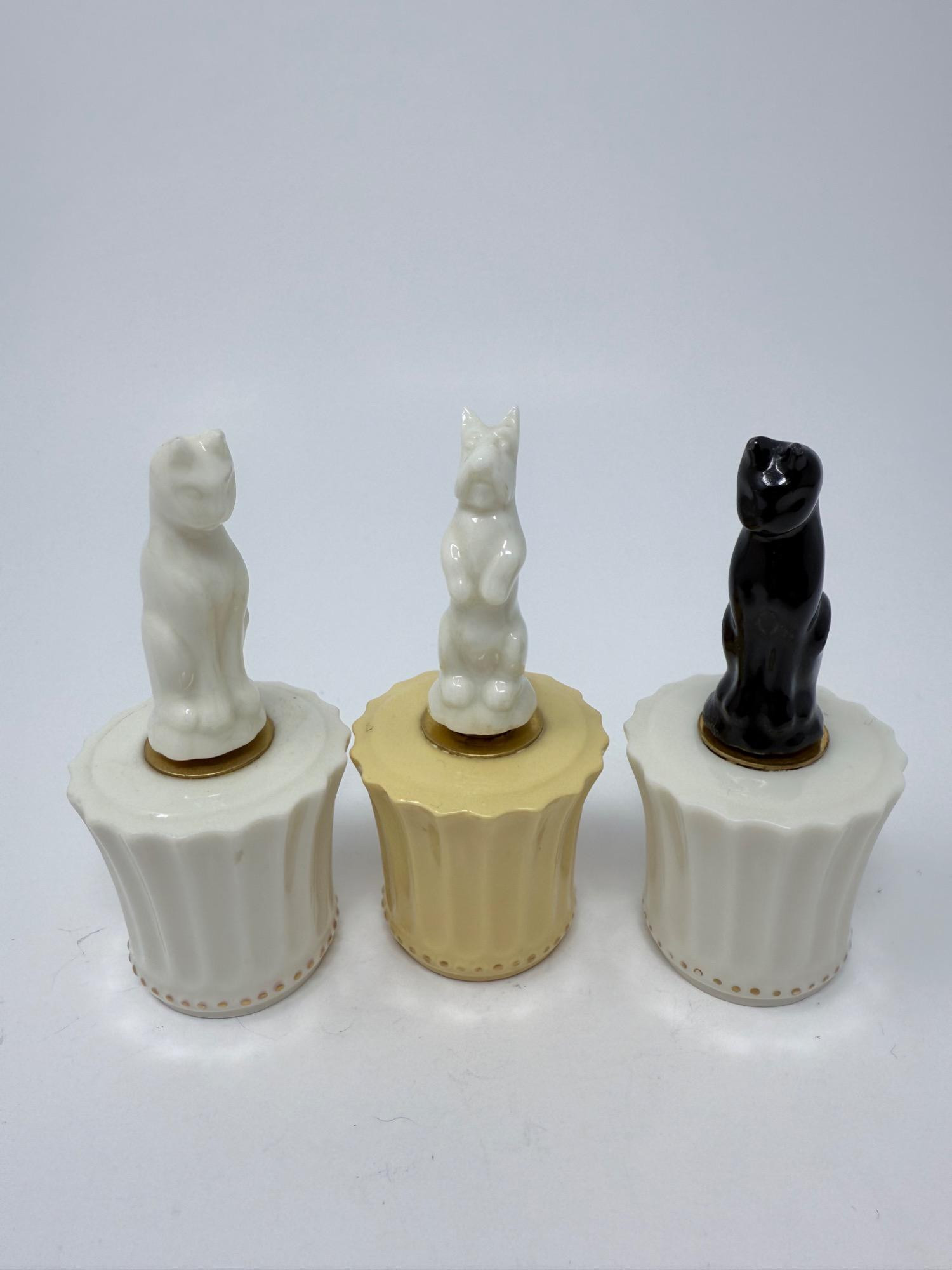 A charming set of three vintage DeVilbiss Lenox perfume bottles, featuring elegant porcelain bodies with finely sculpted animal-shaped stoppers. Each bottle showcases a scalloped design with delicate gold trim, embodying classic craftsmanship. Features: Brand: DeVilbiss x Lenox Material: Porcelain with gold-tone accents Design: Fluted bottle bases with figural animal stoppers (cat and dog) Dimensions: 4 inches tall and 2 inches wide. Origin: Made in the USA Functionality: Includes intact glass applicators inside the stoppers Condition: Minor signs of age-related wear. The glass dauber on the dog stopper remains functional (see photos for details).