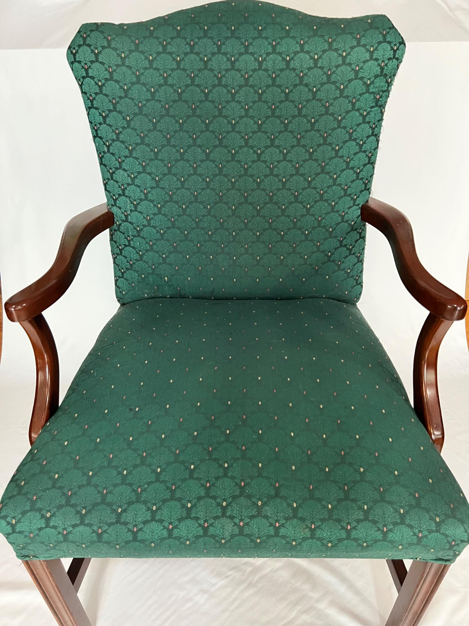 This vintage armchair features an elegant wooden frame with gracefully curved arms and a sturdy structure. The chair is upholstered in a rich green fabric with a subtle fan-patterned design, adding a touch of classic charm. The cushioned seat and slightly curved backrest provide comfort and support. Dimensions: Overall: 24” W x 27” D x 36.5” H Seat Height: 19”