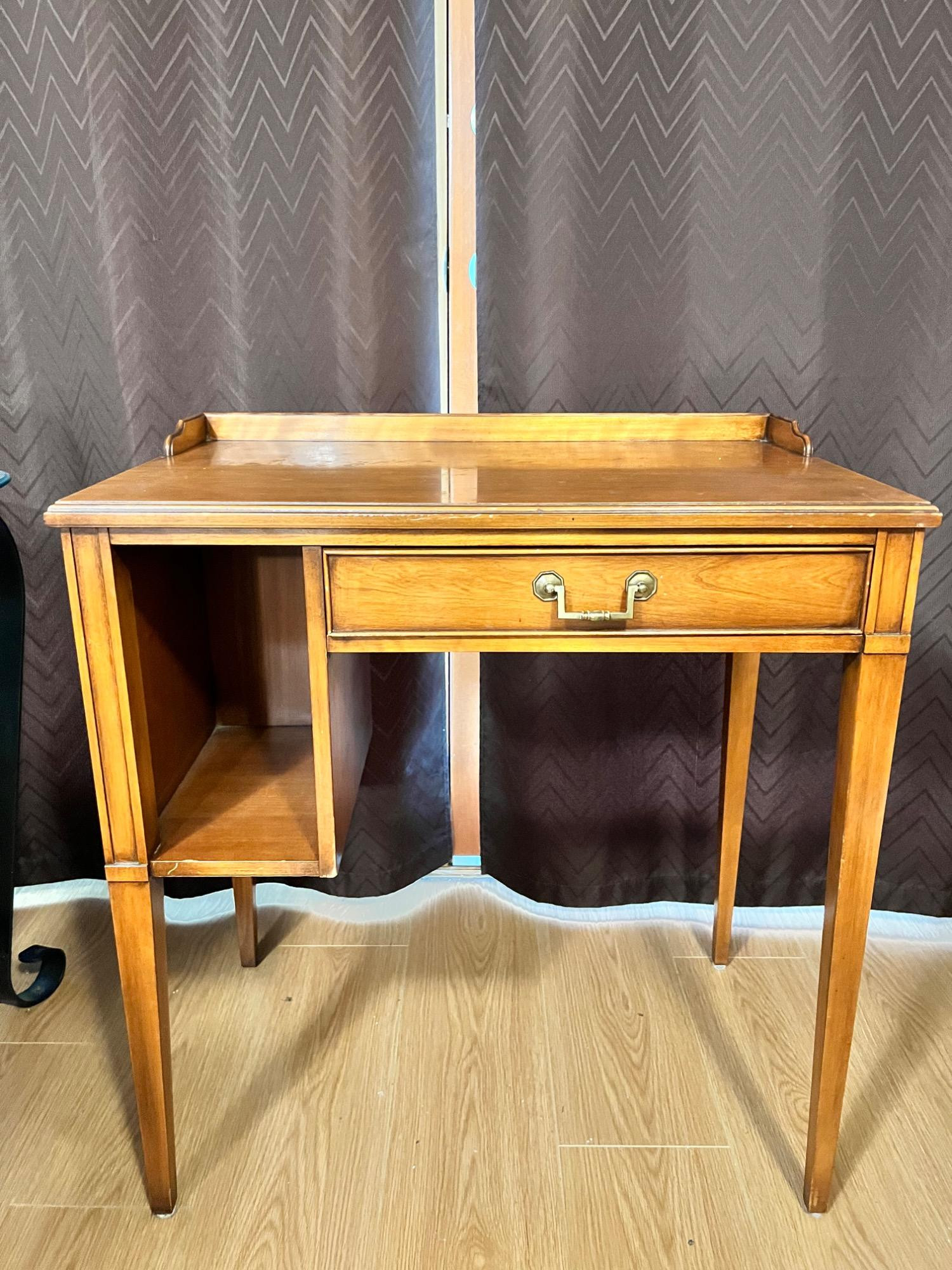 A classic vintage wooden desk with a warm wood finish and mid-century design. Features a single drawer with brass-finish hardware and an open side compartment for storage. The raised back panel adds a refined touch, while tapered legs enhance its sleek aesthetic. Dimensions: 30.5” H x 28” W x 17” D Condition: Sturdy with minor surface wear and light scratches. Drawer opens smoothly, retaining its vintage charm.