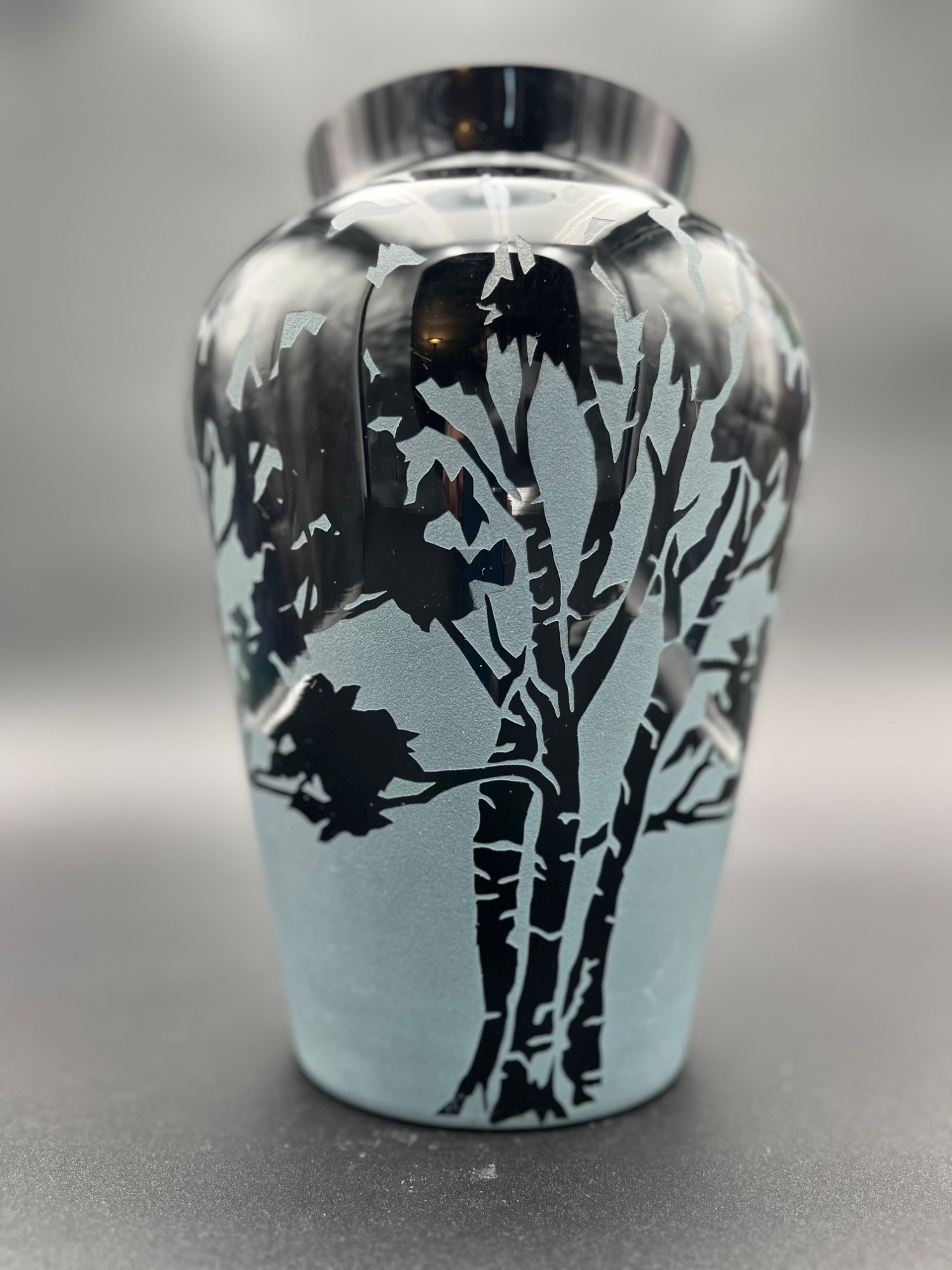 Lot # 53 - Kelsey Pilgrim Cameo Glass Vase – Black & Frosted Tree Design – 11”
