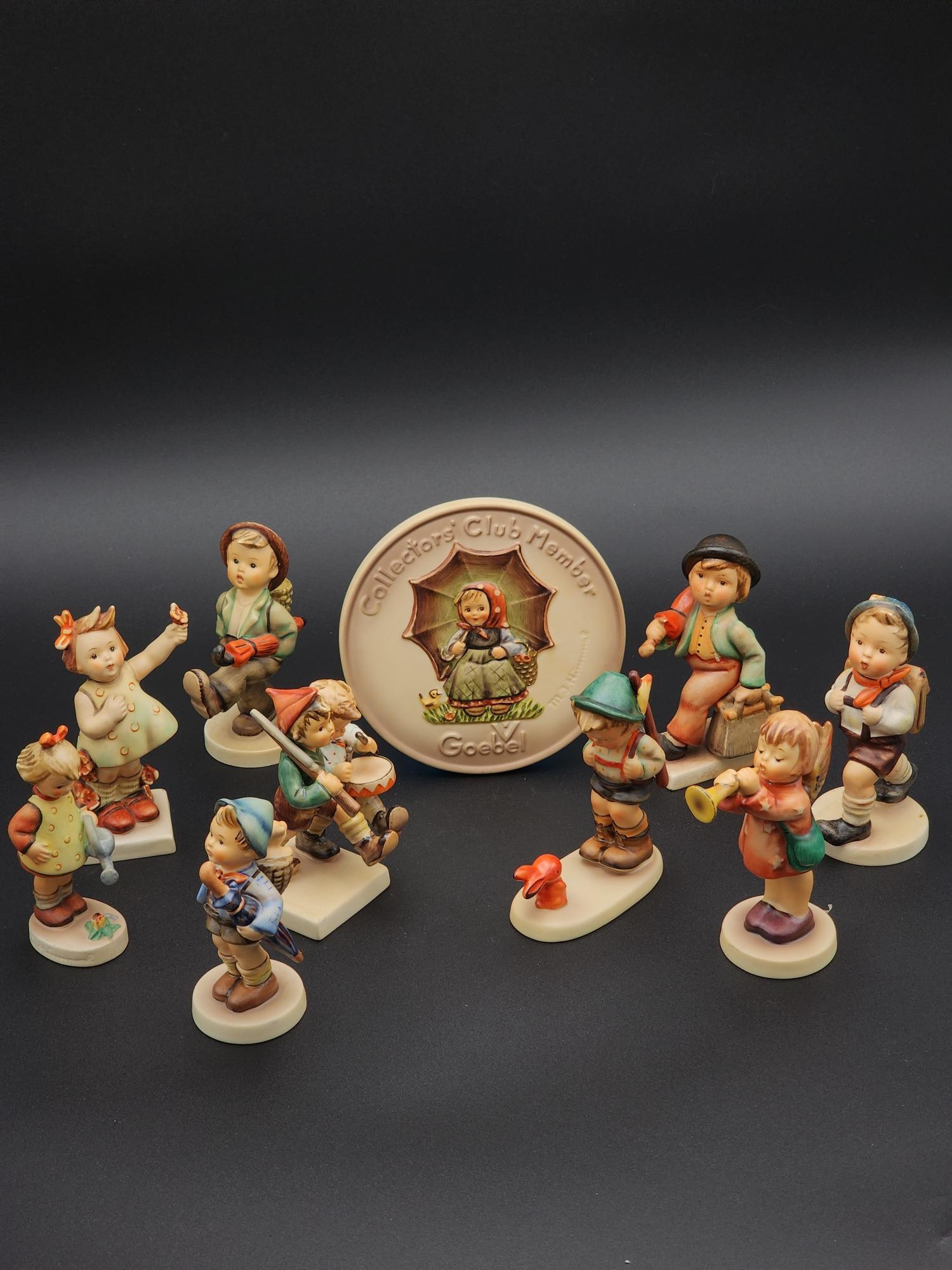 These Beautiful & Cute collectible, hand-painted earthenware ceramic figurines based on the drawings of Sister Maria Innocentia Hummel. This set of 10 figures plus the plaque are a perfect part of your collection. Most figures are in beautiful collection only one of the bigger figures is broken on his hat the "leaf" broke off. (see the figurine with a blue hat wearing a backpack). No cracks or chips on the other pieces.