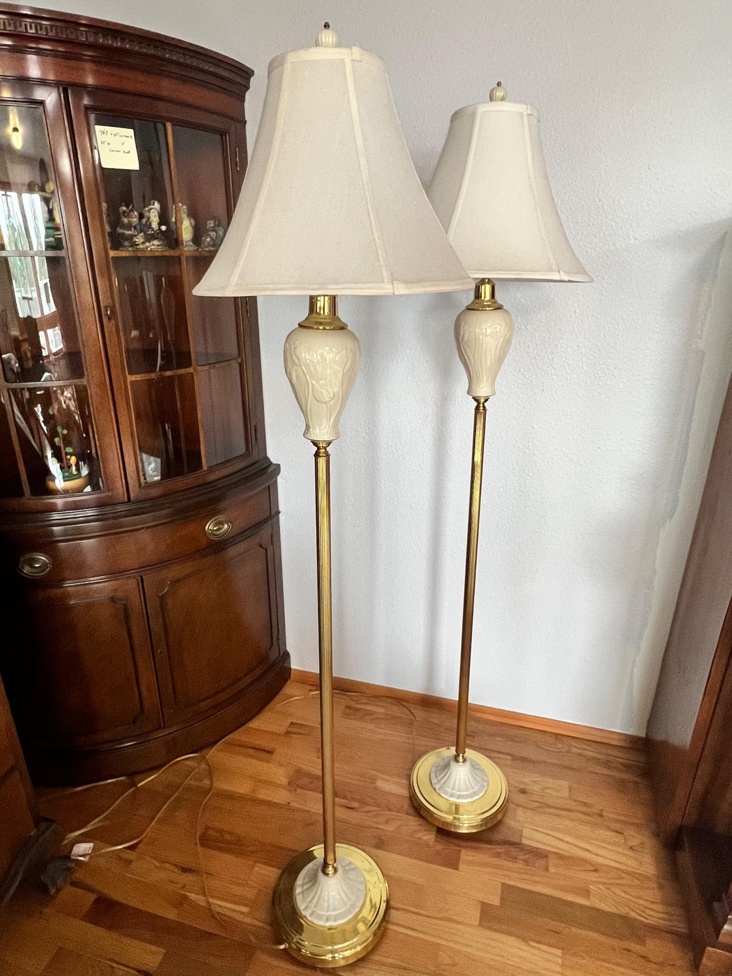 Add a sophisticated touch to your interior décor with this exquisite pair of matching vintage floor lamps. Beautifully designed with polished brass-colored stands and intricate cream-colored ceramic accents, these lamps exude timeless charm and elegance. Each lamp is topped with a classic white fabric lampshade in a graceful bell shape. Features: Matching set of two vintage floor lamps Polished brass-colored metal stands Detailed cream-colored ceramic accents White fabric lampshades in bell shape Solid, stable bases combining ceramic and brass Dimensions: 64” H x 16” Diameter Shade x 10.5” W Base Condition: Excellent condition.
