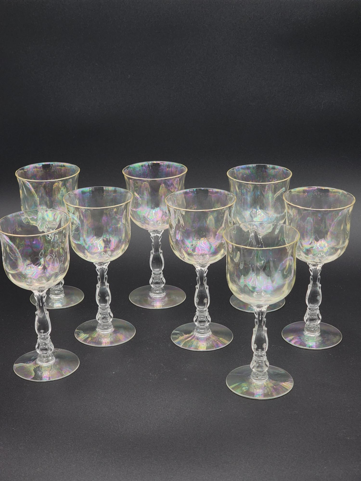 Fostoria Coral Pearl Iridescent Wine Glasses or Goblets. Add a touch of vintage glamour to your dining table with these rare Fostoria Coral Pearl water goblet glasses. Made of high-quality glass in the United States, these goblets are perfect for all occasions, from casual dinners to elegant soirées. The iridescent finish gives them a unique and eye-catching look that is sure to impress your guests. Water goblets, making them a great addition to your glassware collection. The antique style and food & drink theme make them a must-have for any avid collector. Don't miss out on the chance to own these discontinued Fostoria Coral Pearl water goblets. Replacements for these are around $40 per piece on Replacements Ltd. Dimensions: Height: 7 1/8 in Width: 3 3/8 in Blown Glass
