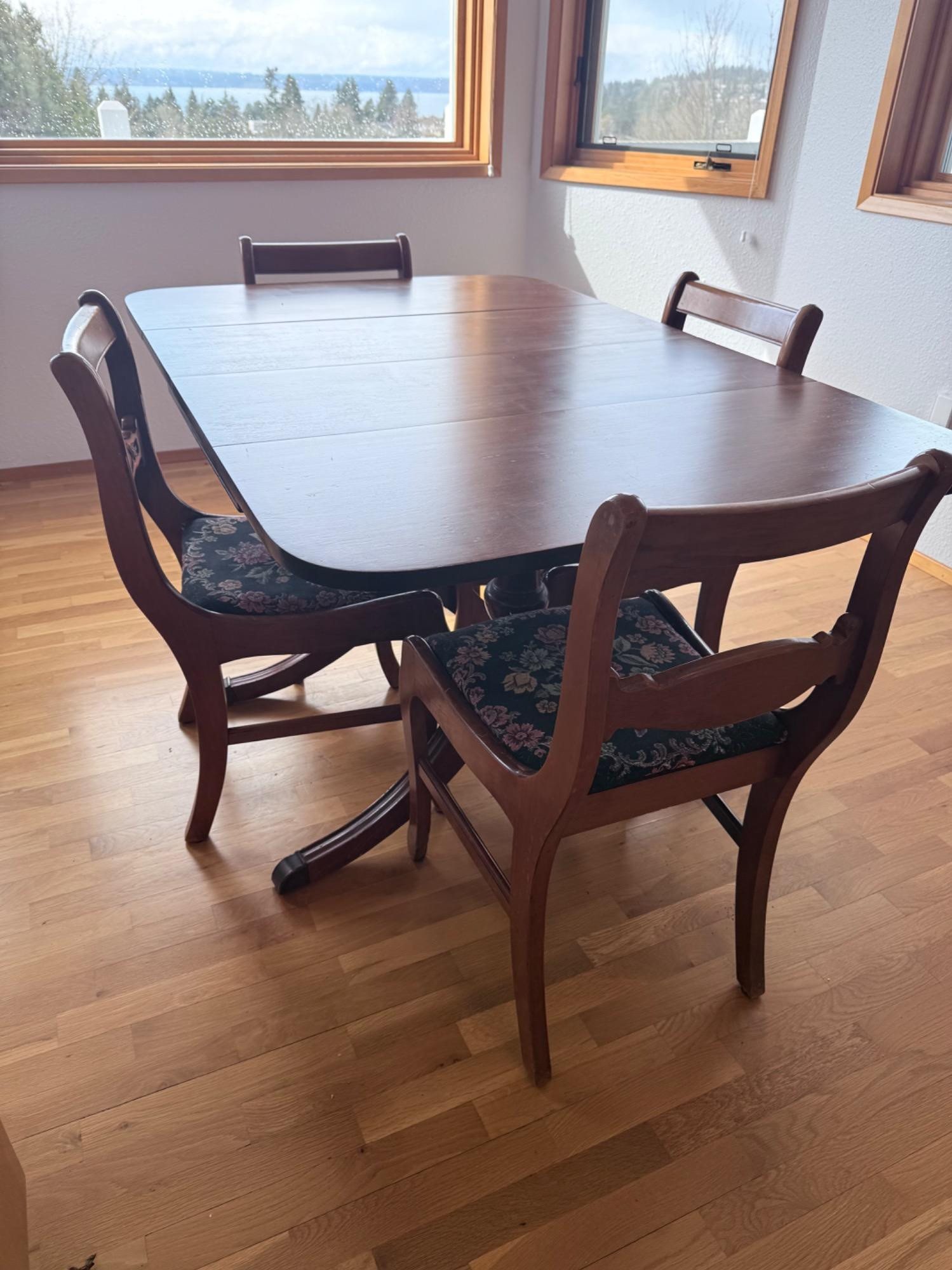 This vintage wooden dining set includes a rectangular expandable table and four matching chairs, perfect for a classic dining space. The set features solid wood construction with turned legs and a warm wood finish. The chairs have floral-patterned upholstered seats, adding a traditional touch. Table Details: Dimensions: 36” wide x 54” long (approx.) Height: 30” Expandable Design: Features a drop-leaf mechanism for flexible sizing. Chair Details: Quantity: 4 matching chairs Seat Height: 17” Upholstery: Floral-patterned fabric Frame: Sturdy wooden structure with curved backrests Condition: Structurally solid with age-related wear, including minor scuffs and finish imperfections.