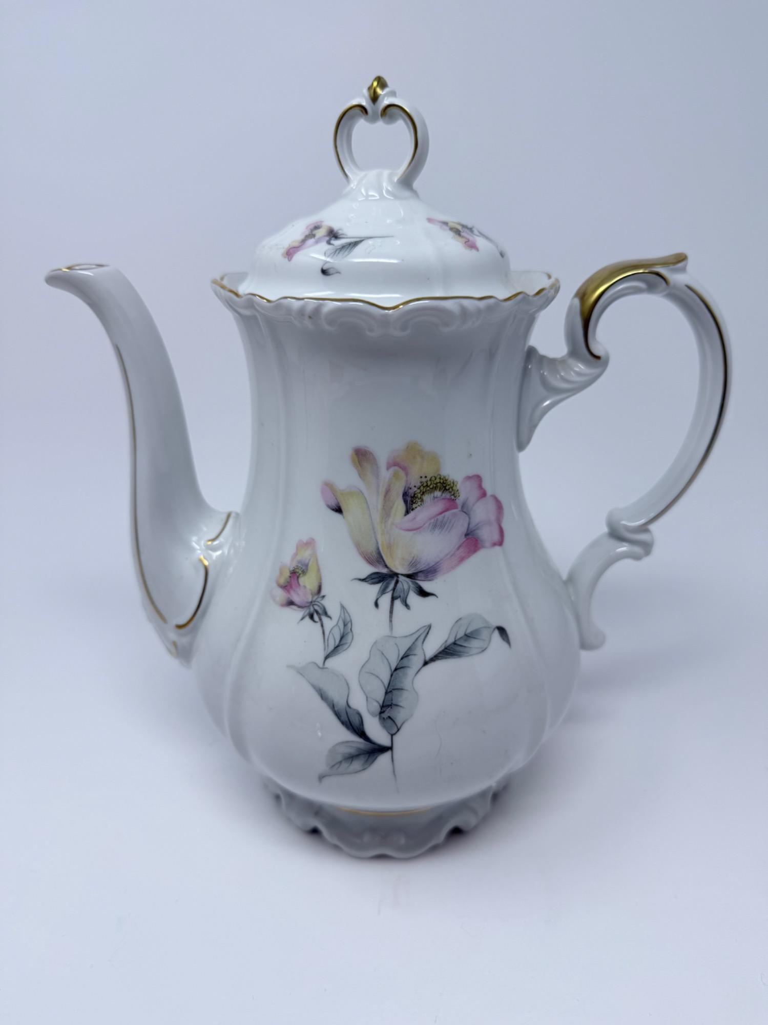 This vintage German porcelain teapot is a stunning addition to any collection, featuring an elegant floral design from the renowned Edelstein Bavaria Maria Theresia 21615 Irish Rose collection. Crafted with fine European craftsmanship, this teapot showcases delicate hand-painted pink and yellow flowers with intricate black leaf detailing. The gold-trimmed accents on the lid, handle, and spout add a luxurious touch, while the ornate handles and scalloped edges enhance its antique charm. Features: Manufacturer: Edelstein Bavaria Condition: Good vintage condition with minor discoloration, light staining, and some fading on the gold trim, but no cracks or major chips.