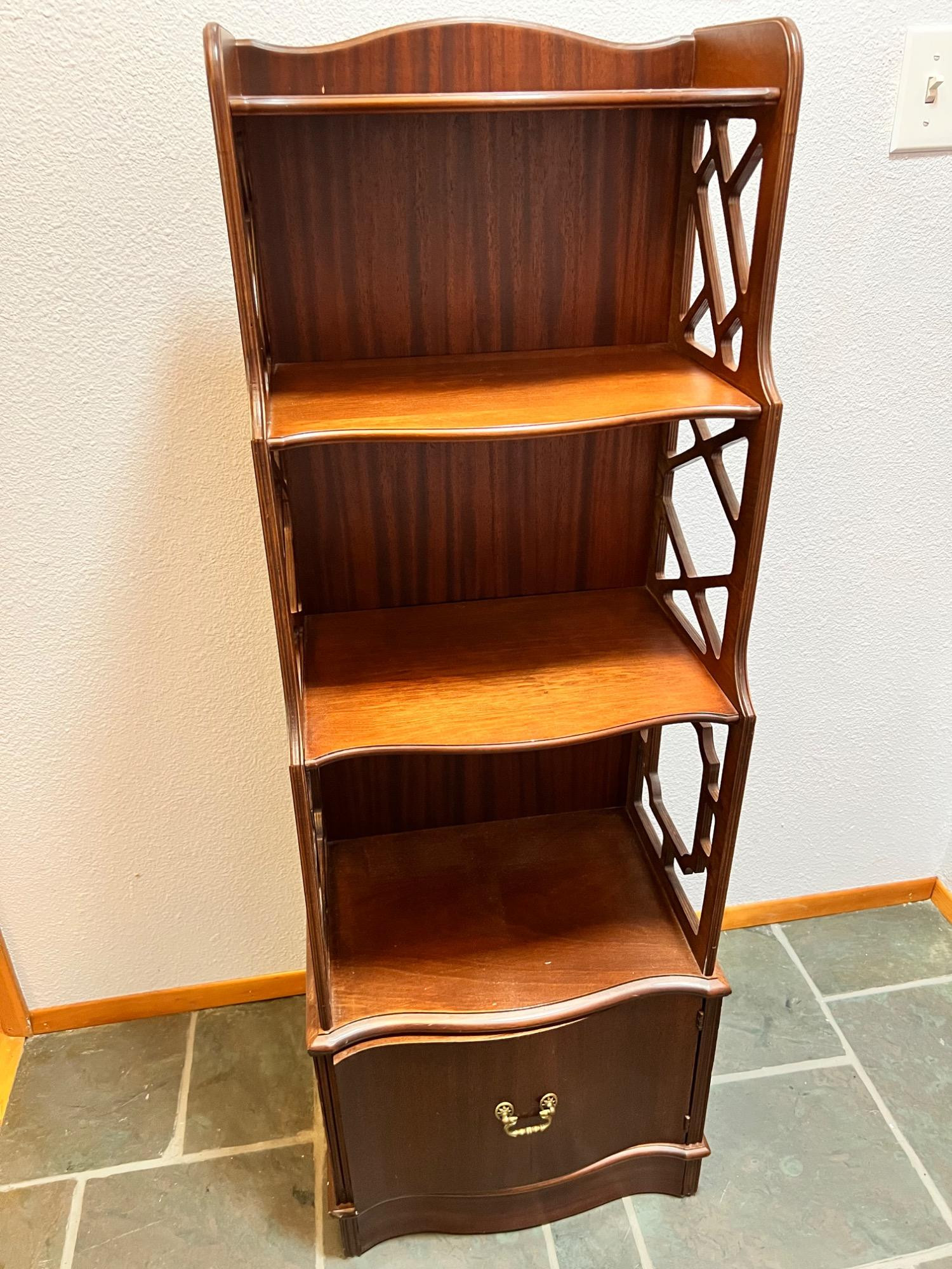This remarkable vintage Butler bookcase is a beautifully crafted piece that blends classic design, practicality, and vintage charm. Made from solid wood, it features a warm brown finish, gracefully curved edges, and intricately carved lattice side panels, making it both a functional storage solution and a stylish statement piece. Classic Vintage Design – Elegant curved shelving and open latticework sides add sophistication and charm. Durable Solid Wood Construction – Built to last with a sturdy frame and rich brown finish. Ample Storage & Display Space – Three open shelves for books, collectibles, or décor. Lower cabinet with brass handle for concealed storage.