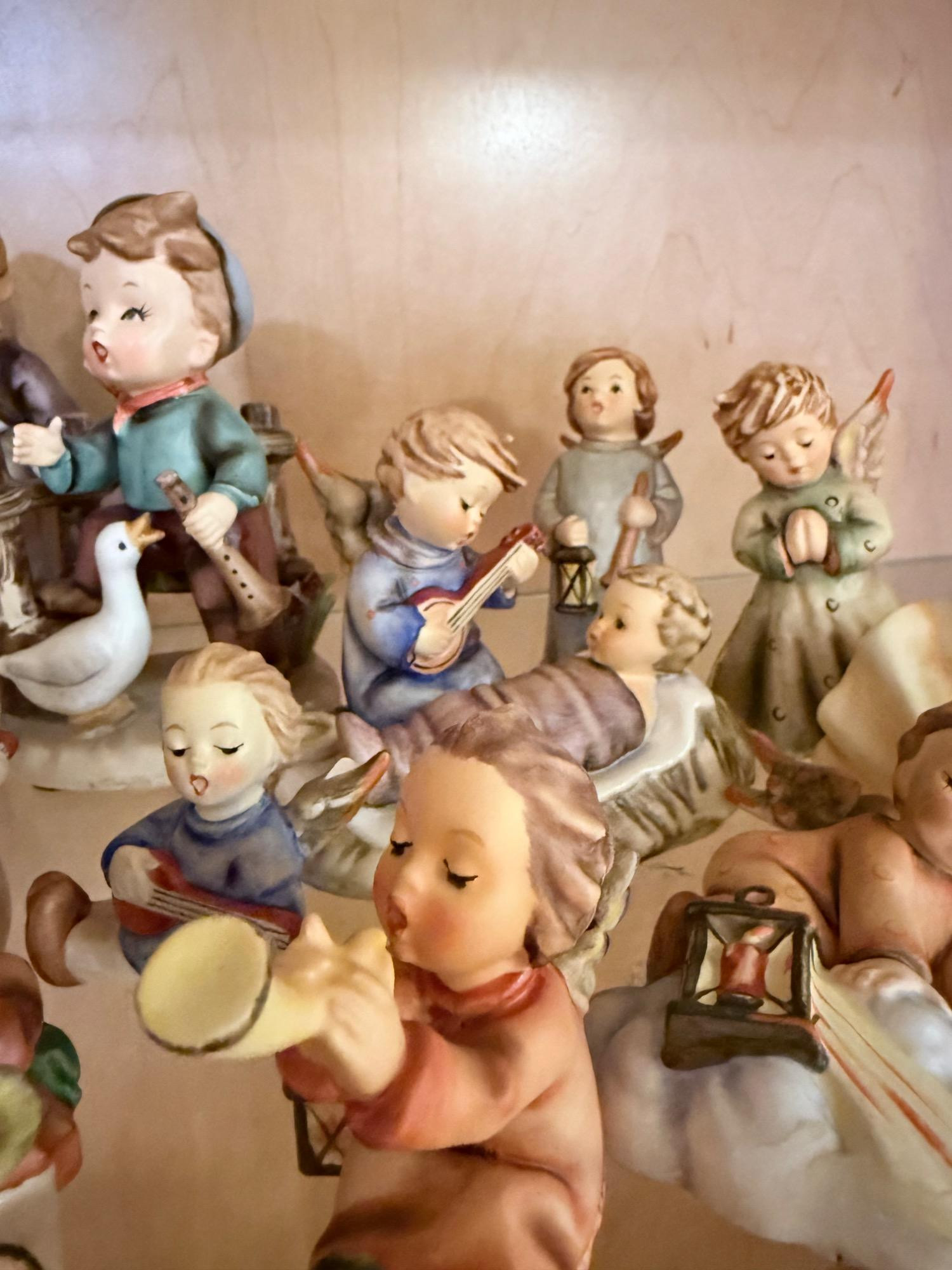This charming collection features 17 vintage, hand-painted ceramic figurines crafted in Germany. Each piece showcases the innocence of childhood and the charm of angelic and festive scenes, making them a timeless treasure for Hummel enthusiasts. Cherubic angels Musical children Festive holiday scenes Smallest figurine: 1.75 inches Largest figurine: 8 inches These figurines are in good vintage condition, with no major flaws—only minor age-related wear. (17 or 11??)